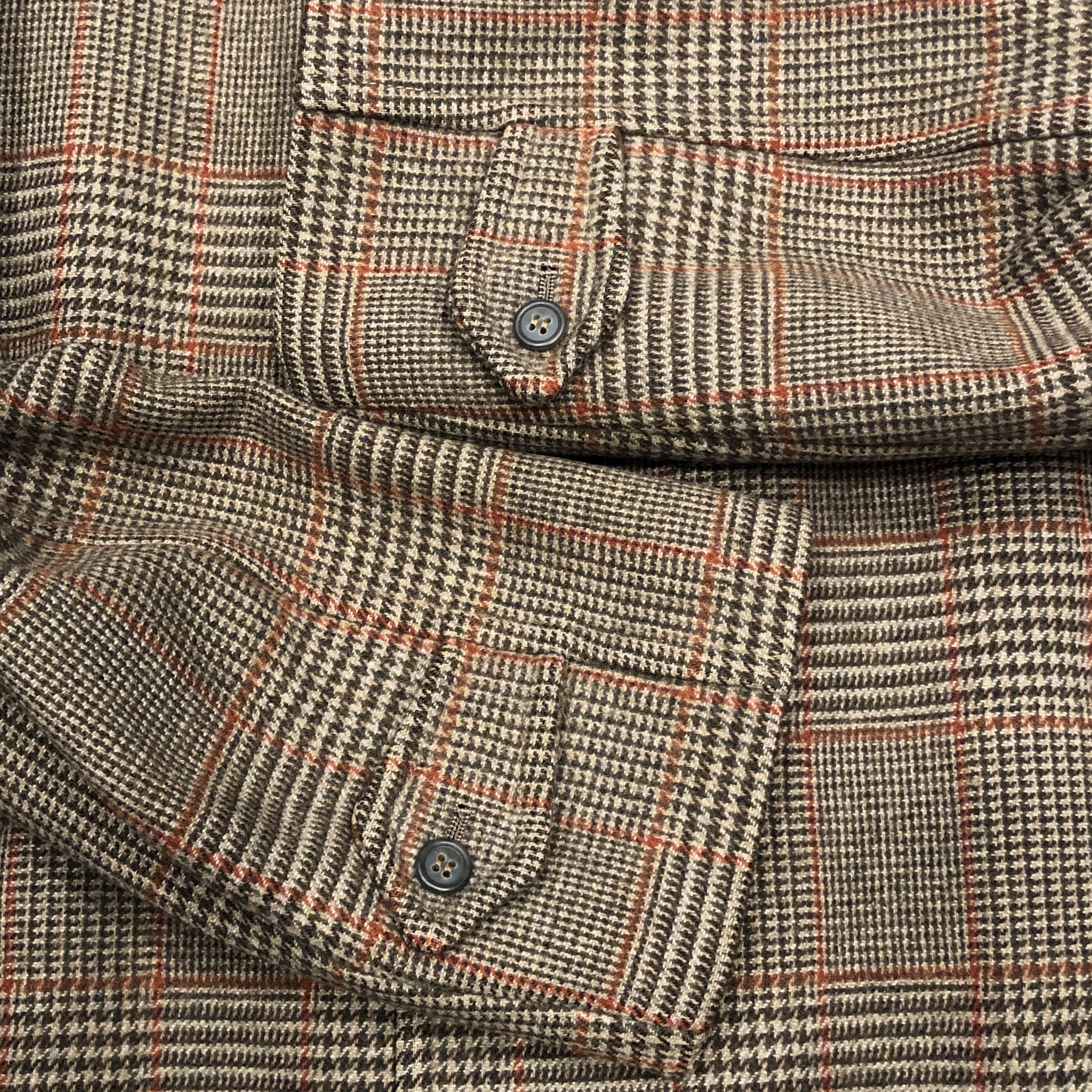 生地に使われているサドルツイードは、元来カントリーウェアや乗馬由来の実用服に用いられてきた、耐久性と保温性に優れたツイード。しっかりとした打ち込みがありながらも、着込むほどに身体に馴染んでいく質感は、現代の量産ウールではなかなか味わえないものです。