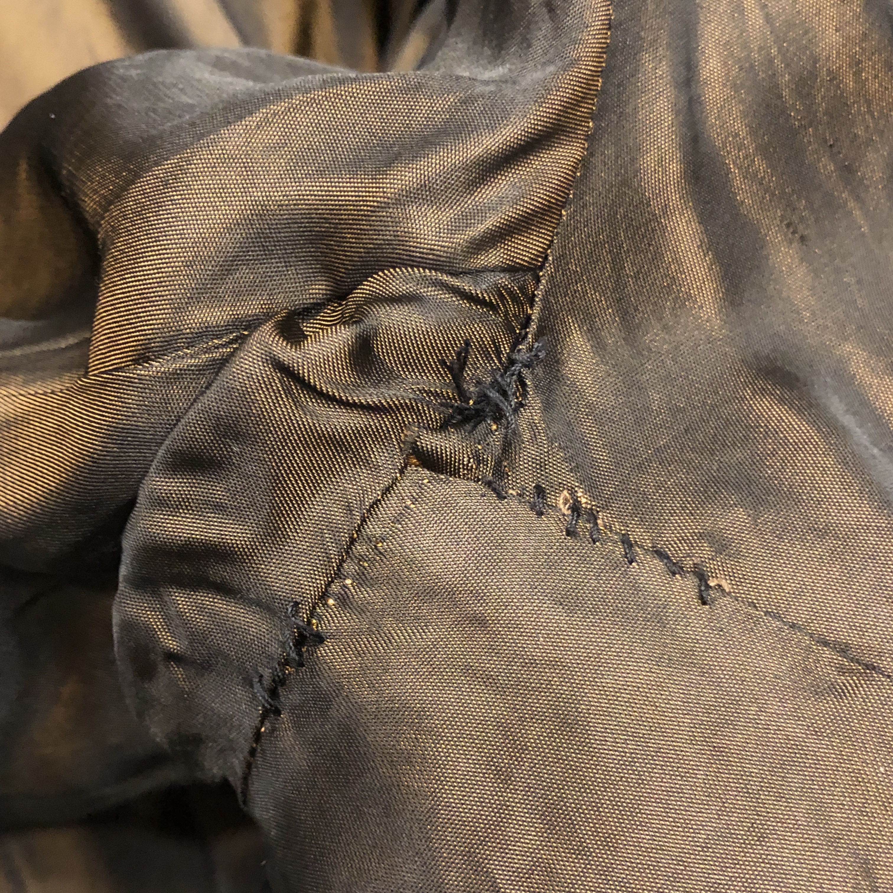 年代相応の着用感、内側裾付近のダメージ、内側左脇下のリペア跡等が画像の様にございますが、古着慣れされている方でしたら問題なくお使いいただける範囲です。正面一番下のボタンが画像の様に色目の異なる物となっております。