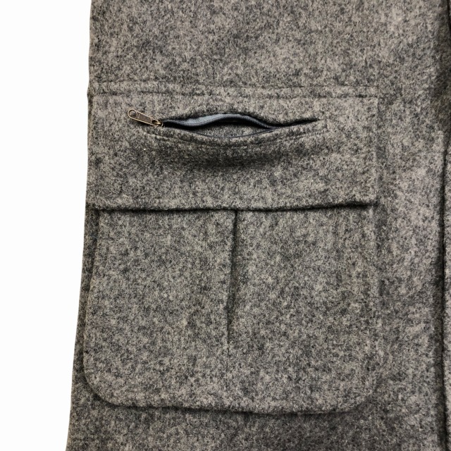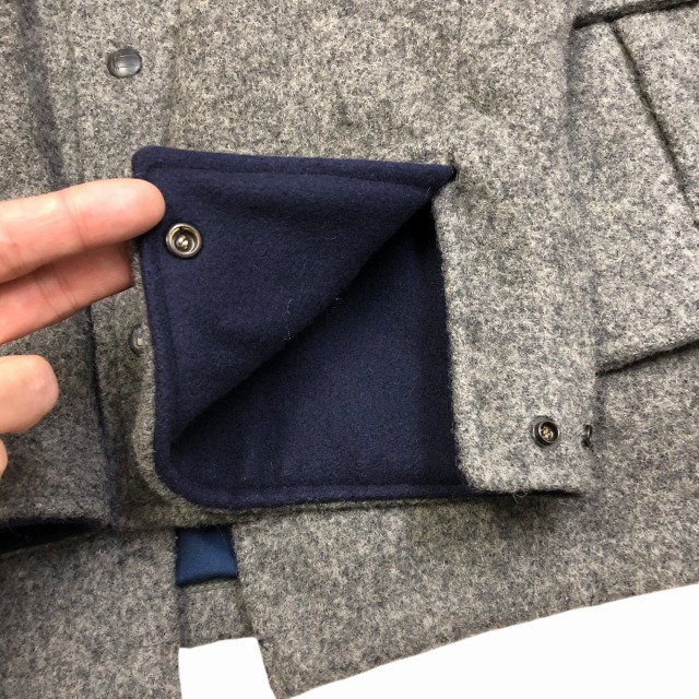 カラーはグレーで、襟と袖先裏地がネイビーが入ります。