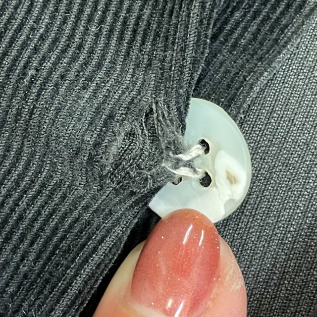 ボタンホールに多少の裂けがあり、ボタン付け根の生地にダメージがございます。
