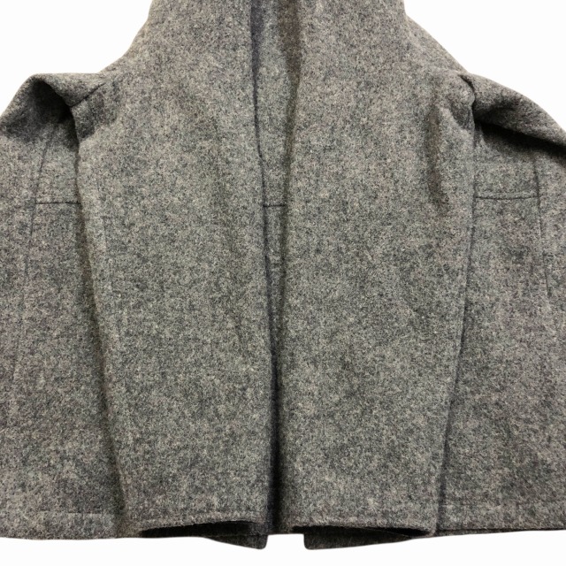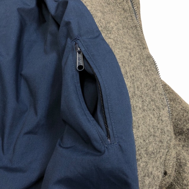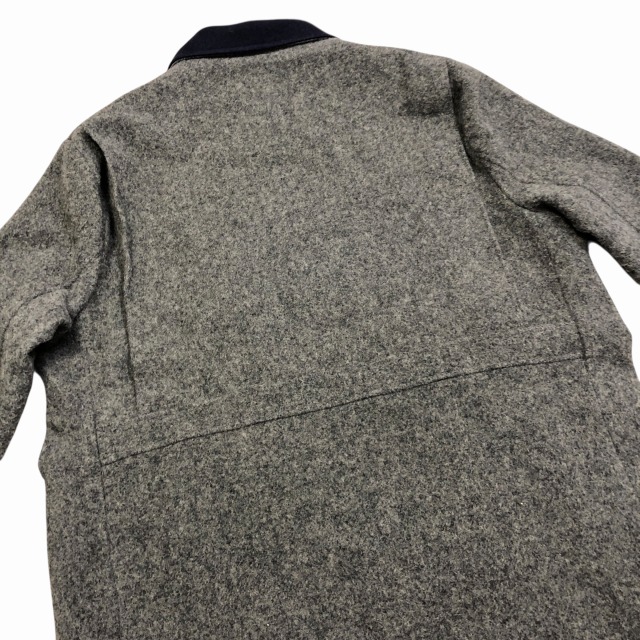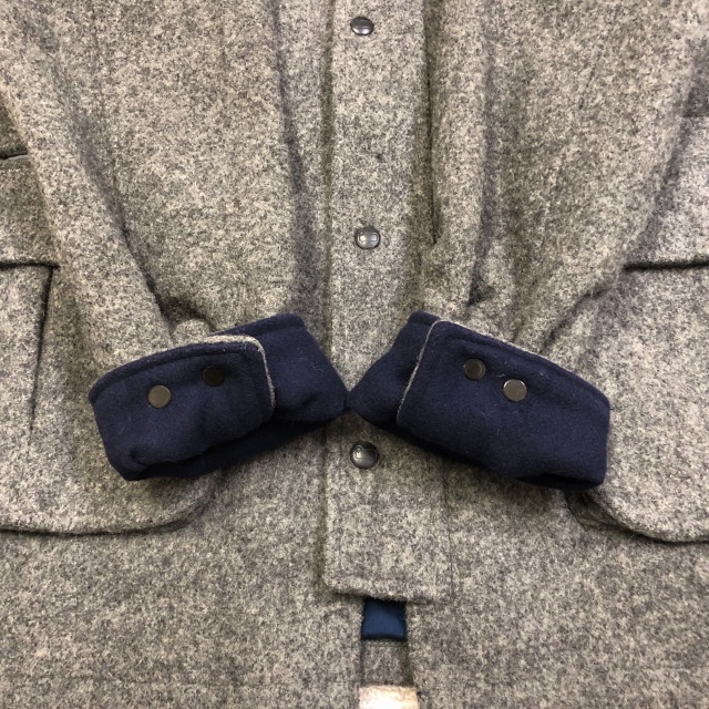 カラーはグレーで、襟と袖先裏地がネイビーが入ります。