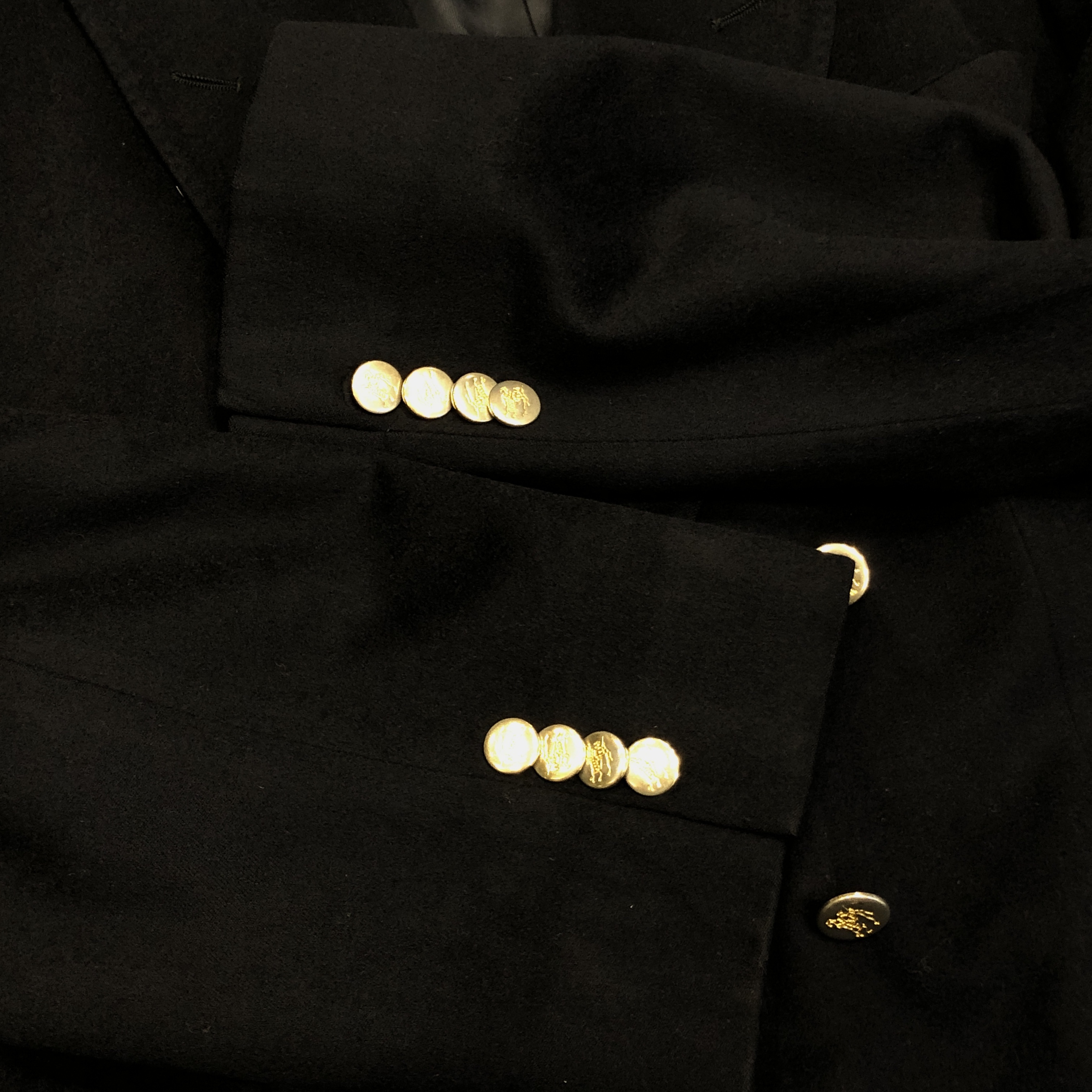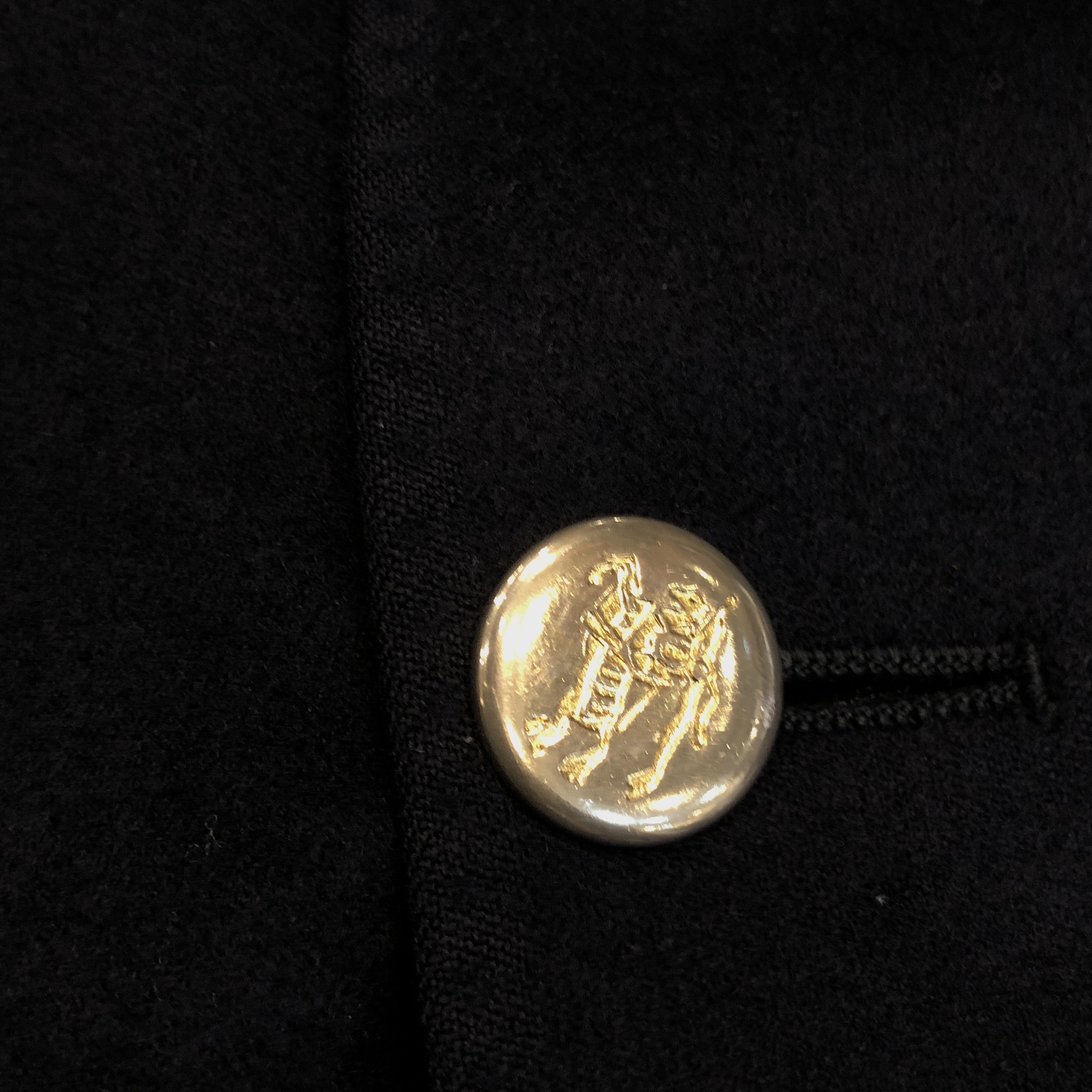 ライニングにまで散りばめられた騎士のロゴ、重厚感ある金ボタン、まさにクラシック・ブリティッシュの美学を体現したようなブレザーです。