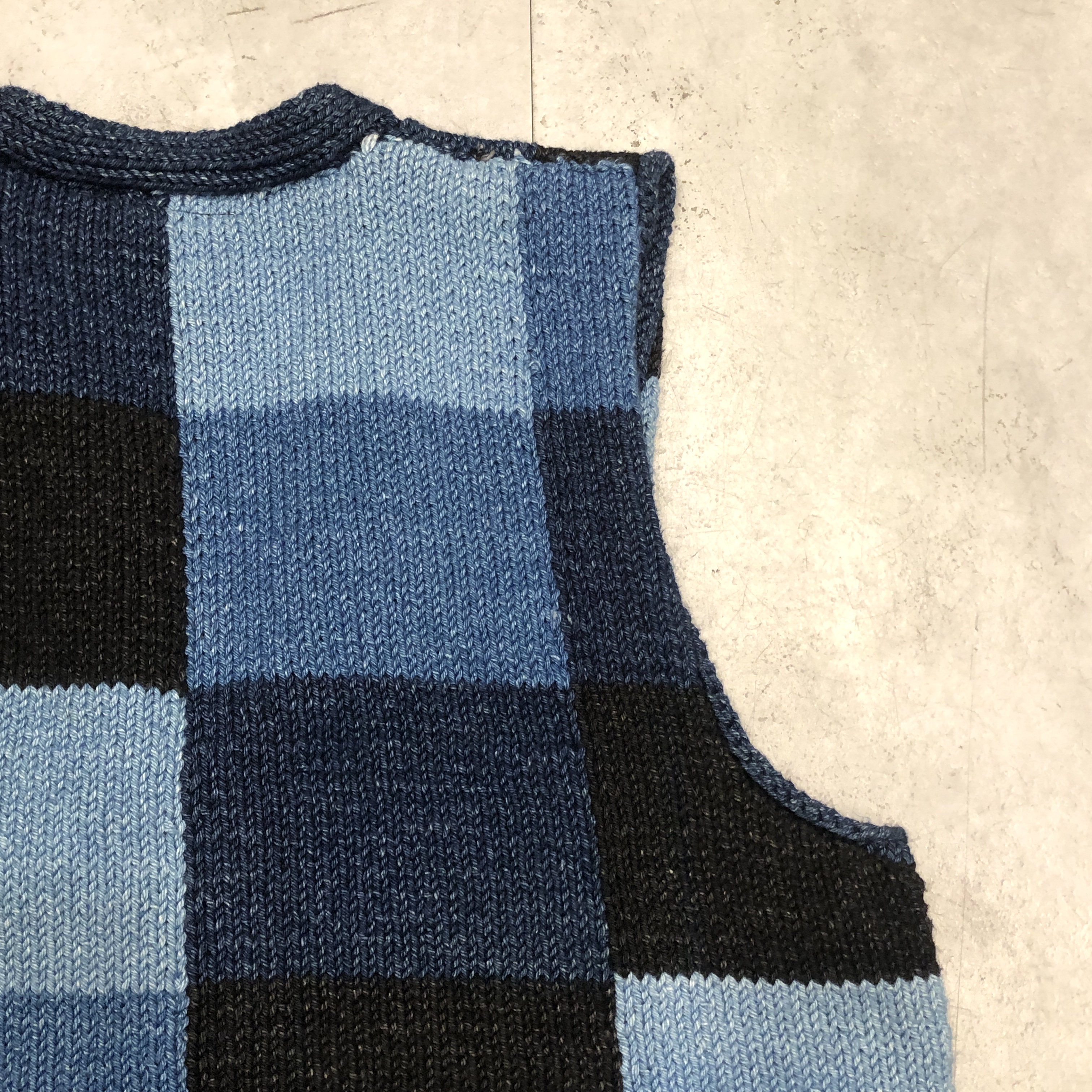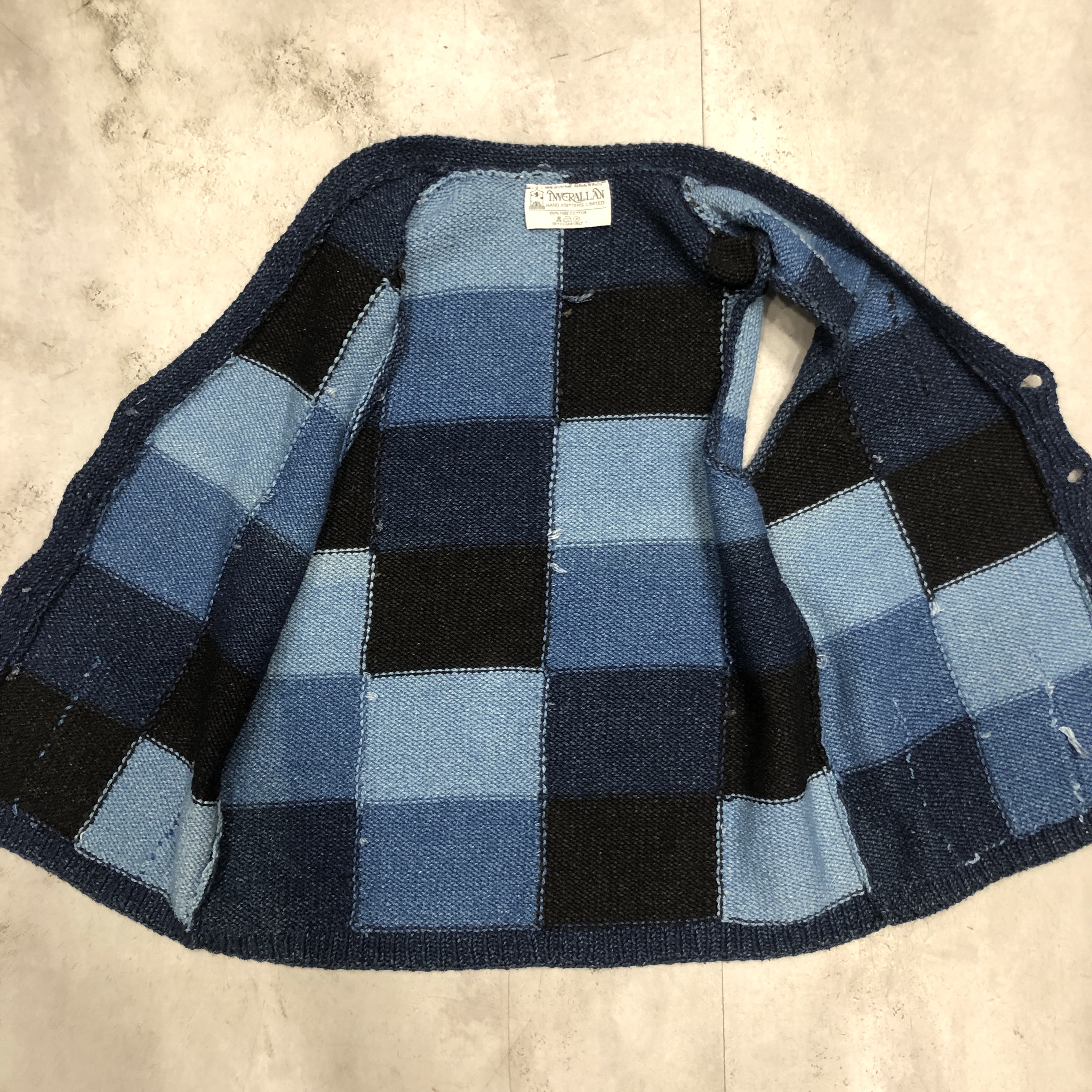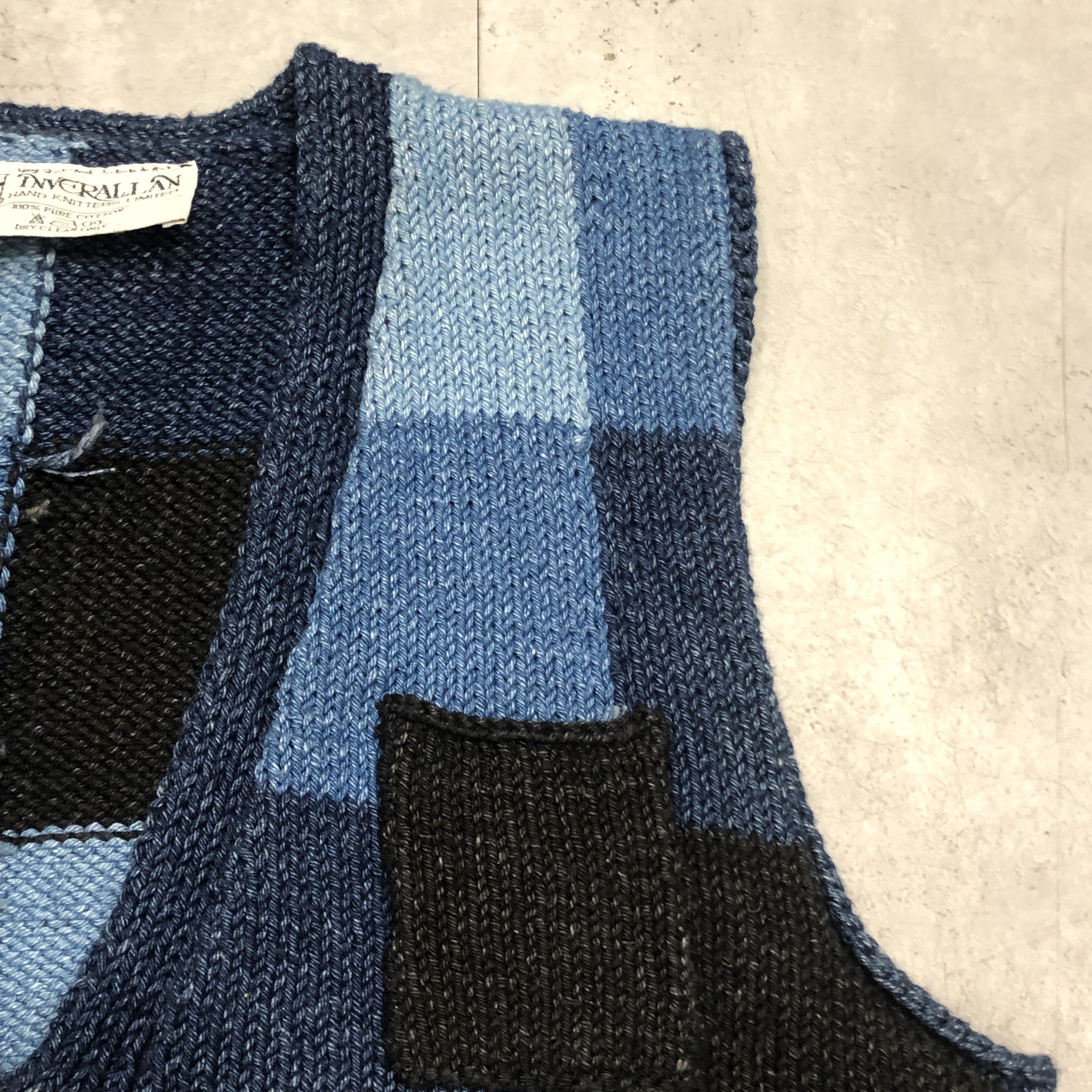 - スコットランド西岸、クライド湾沿いの小さな港町で、熟練のニッターによって一針一針編み上げられる〈INVERALLAN〉。こちらはインディゴニットベスト、コットン仕様です。