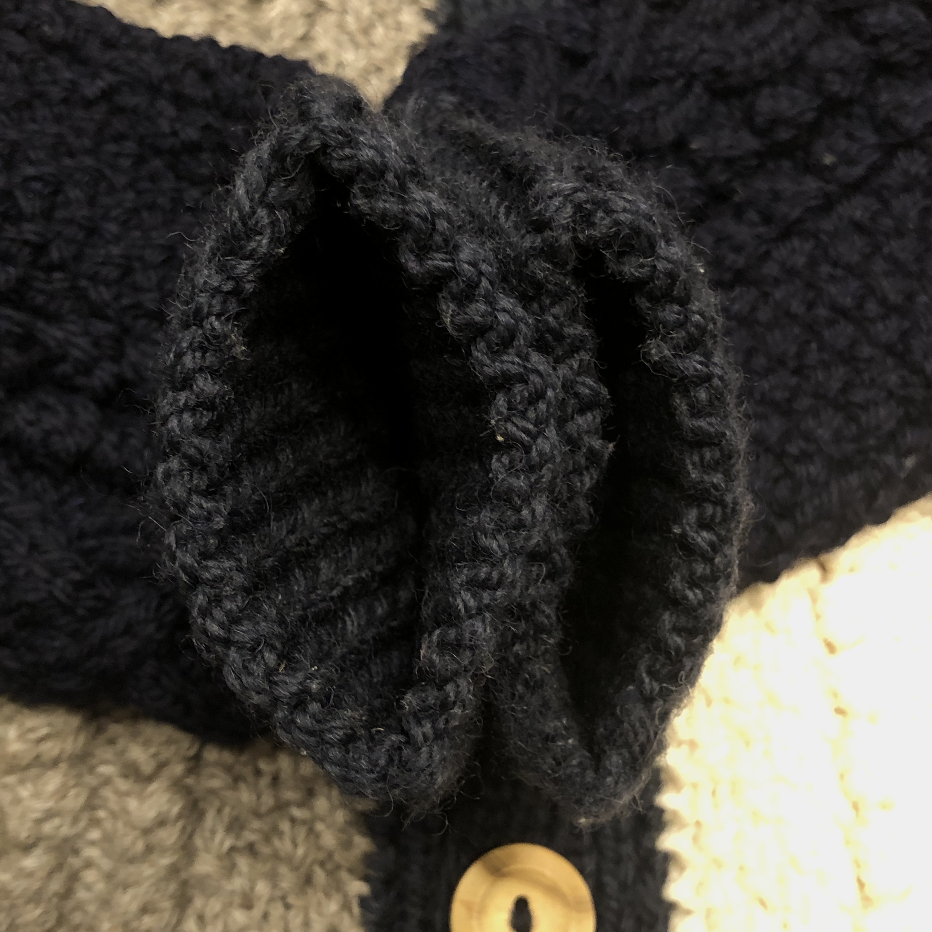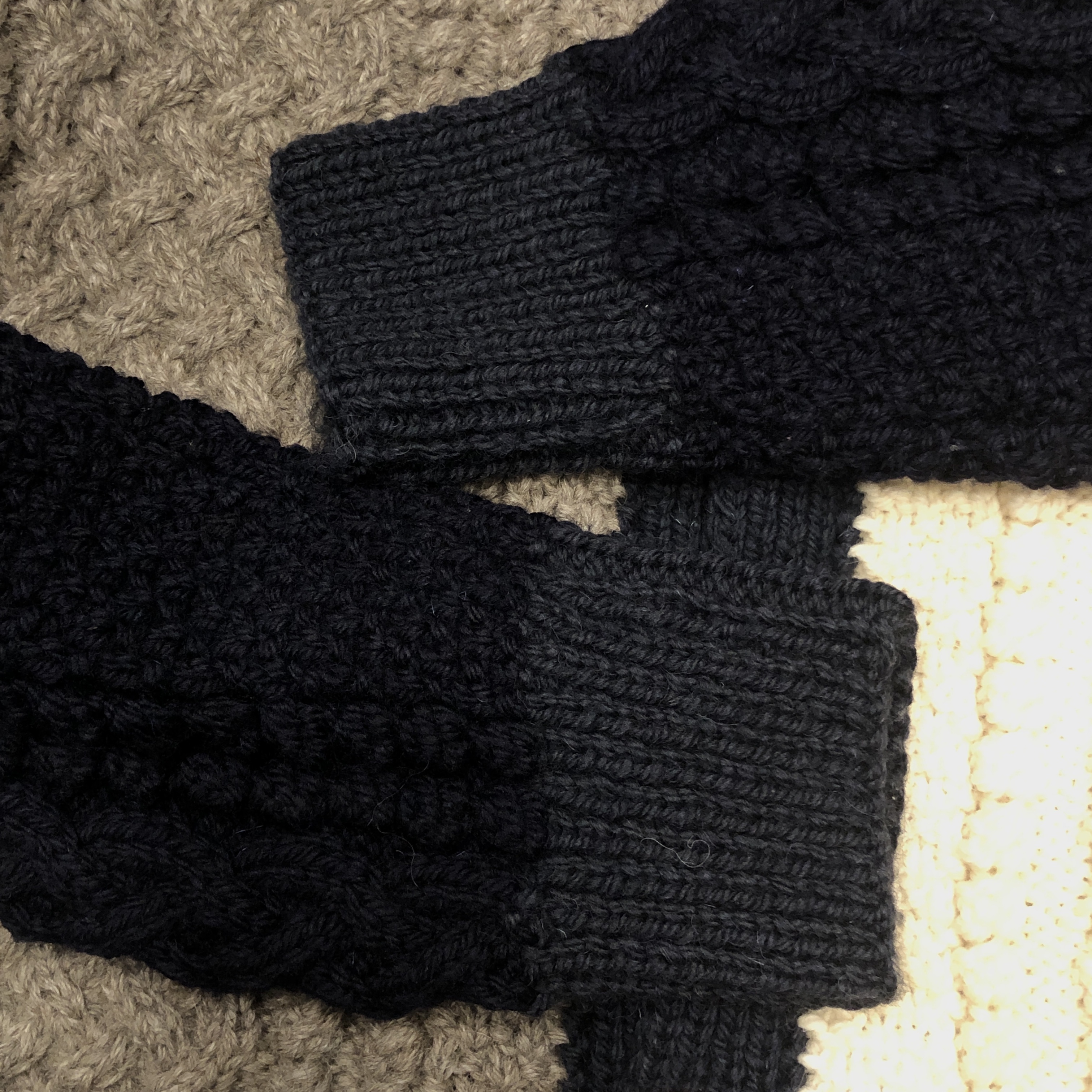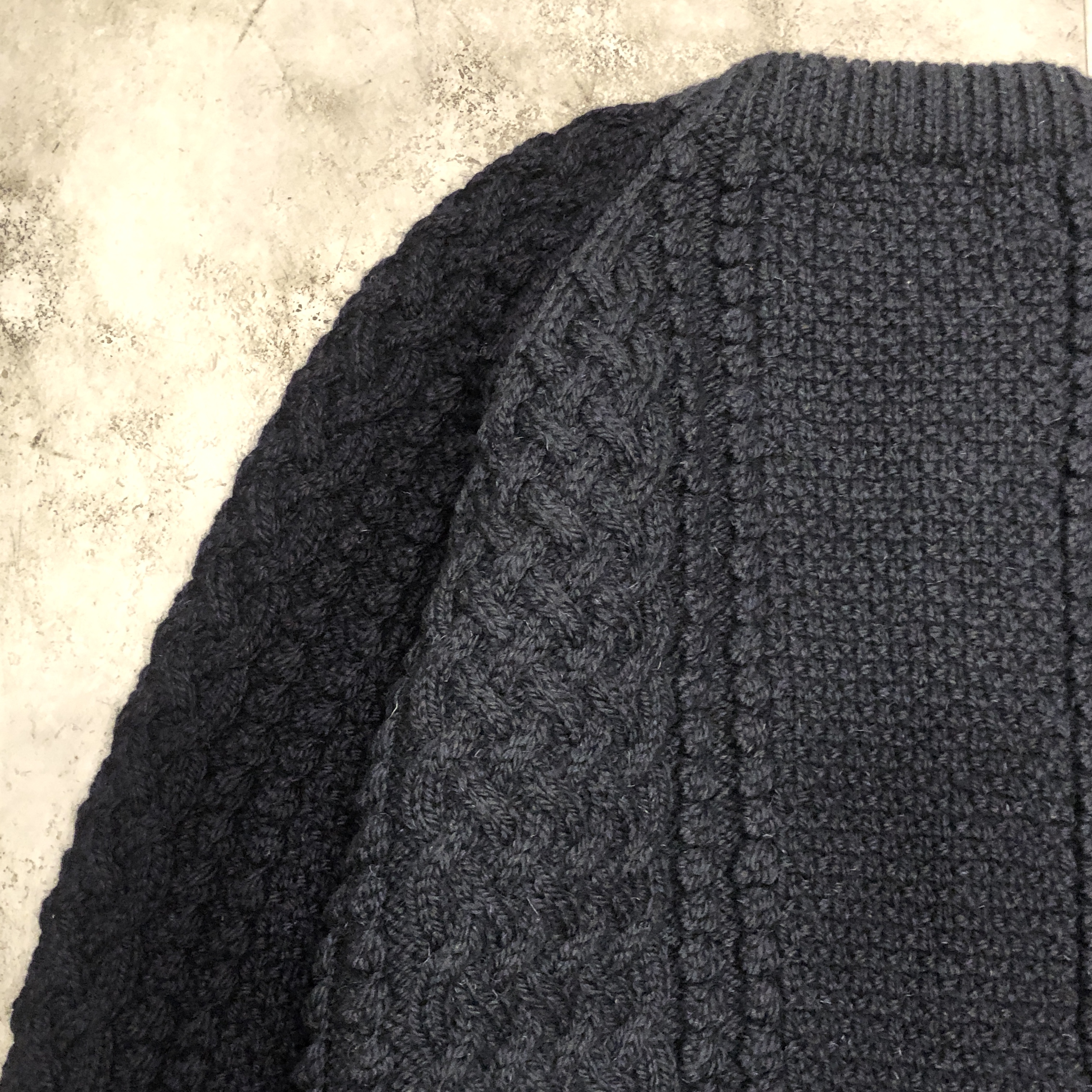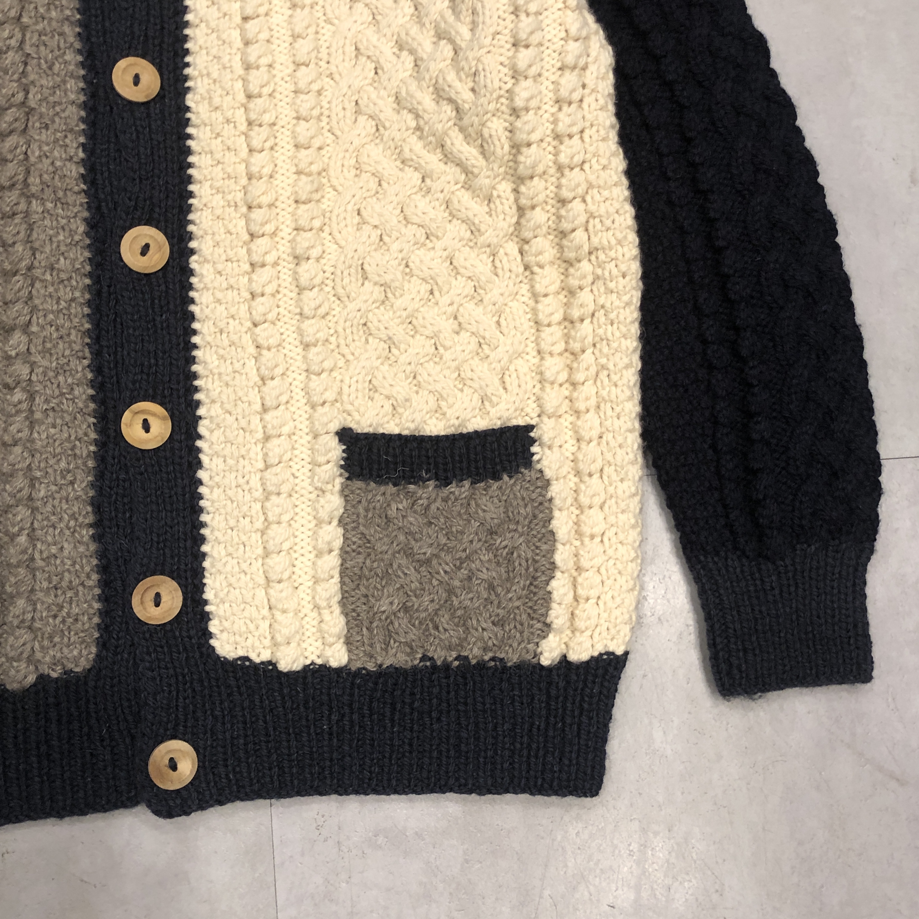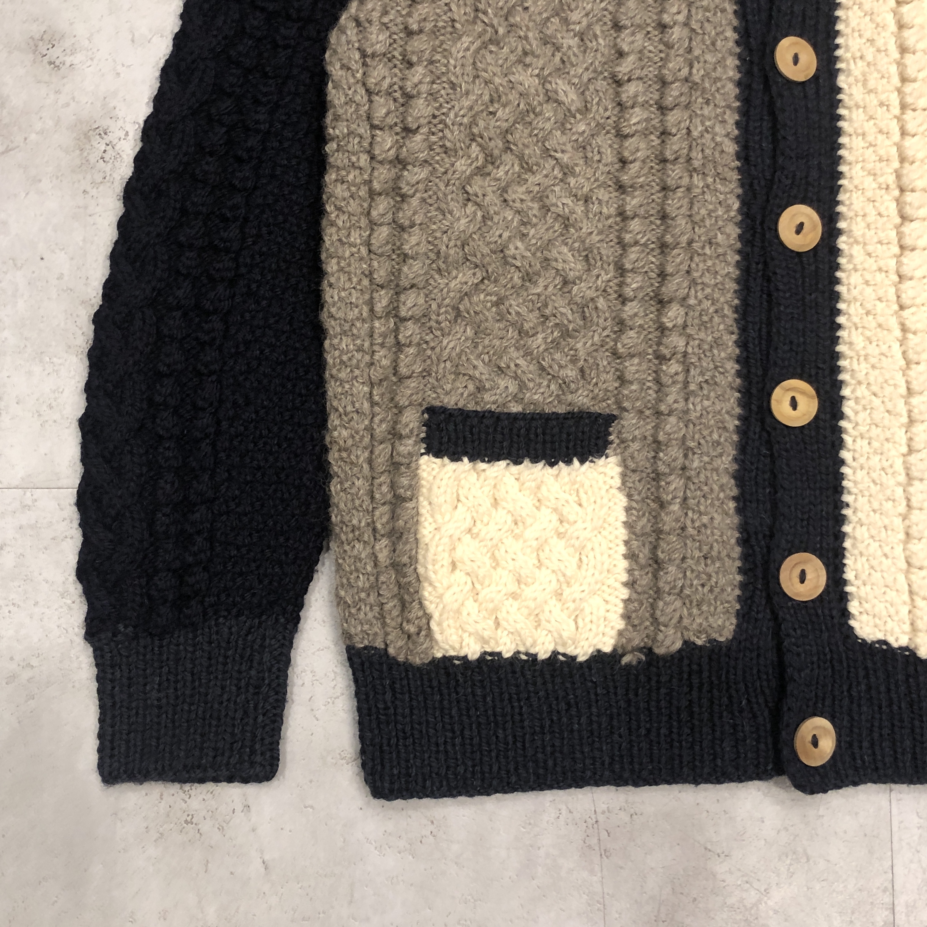 アイボリー × モカ × ネイビーのブロックが、伝統的なアラン模様の立体感をより際立たせています。