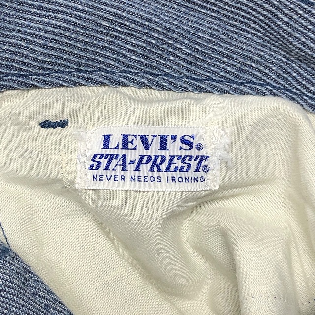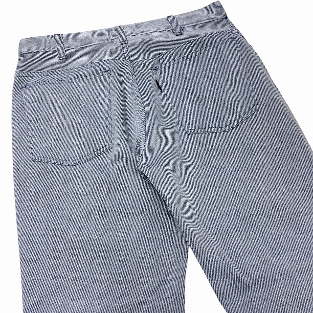「サックスブルー、レアファブリック、実寸W31 L29.5」