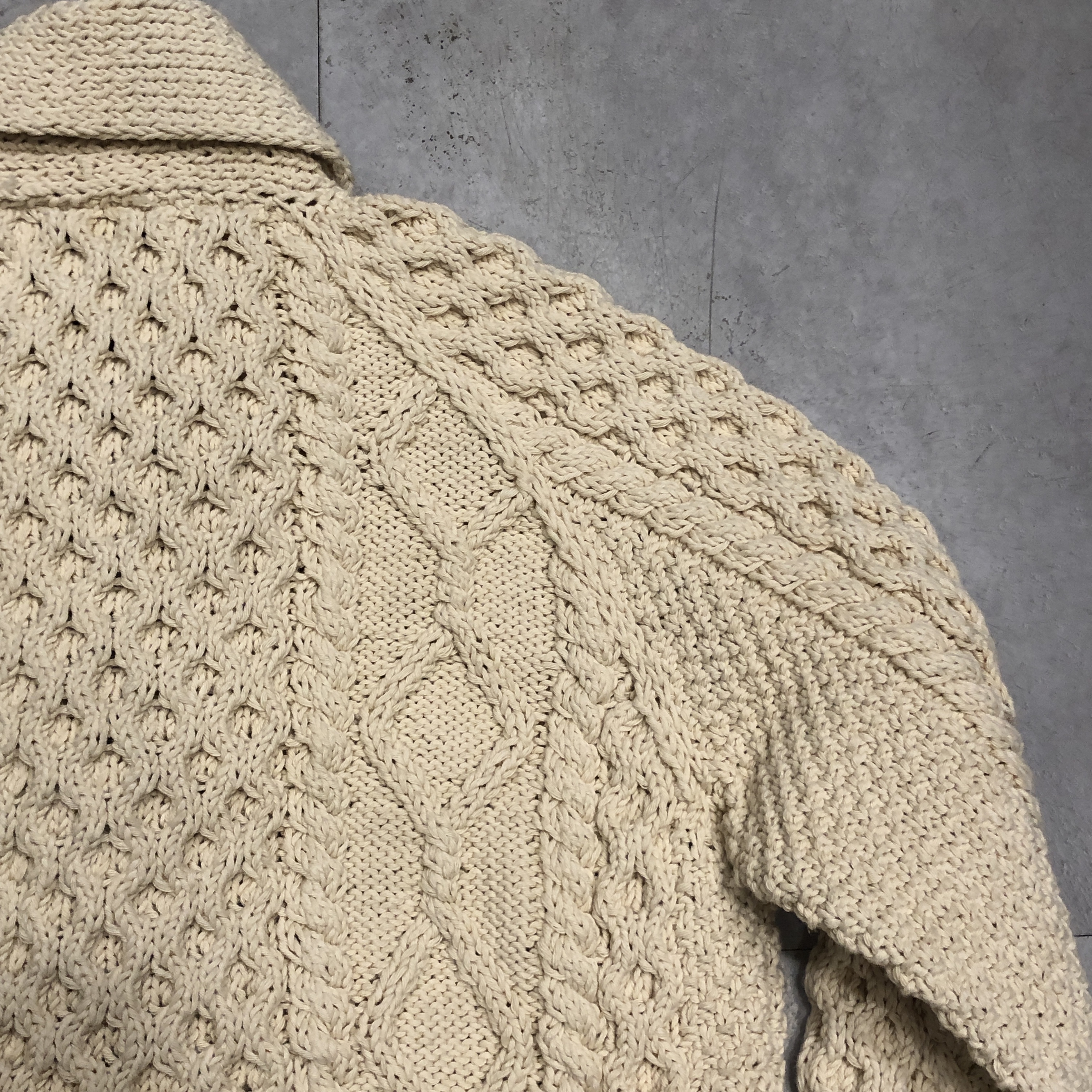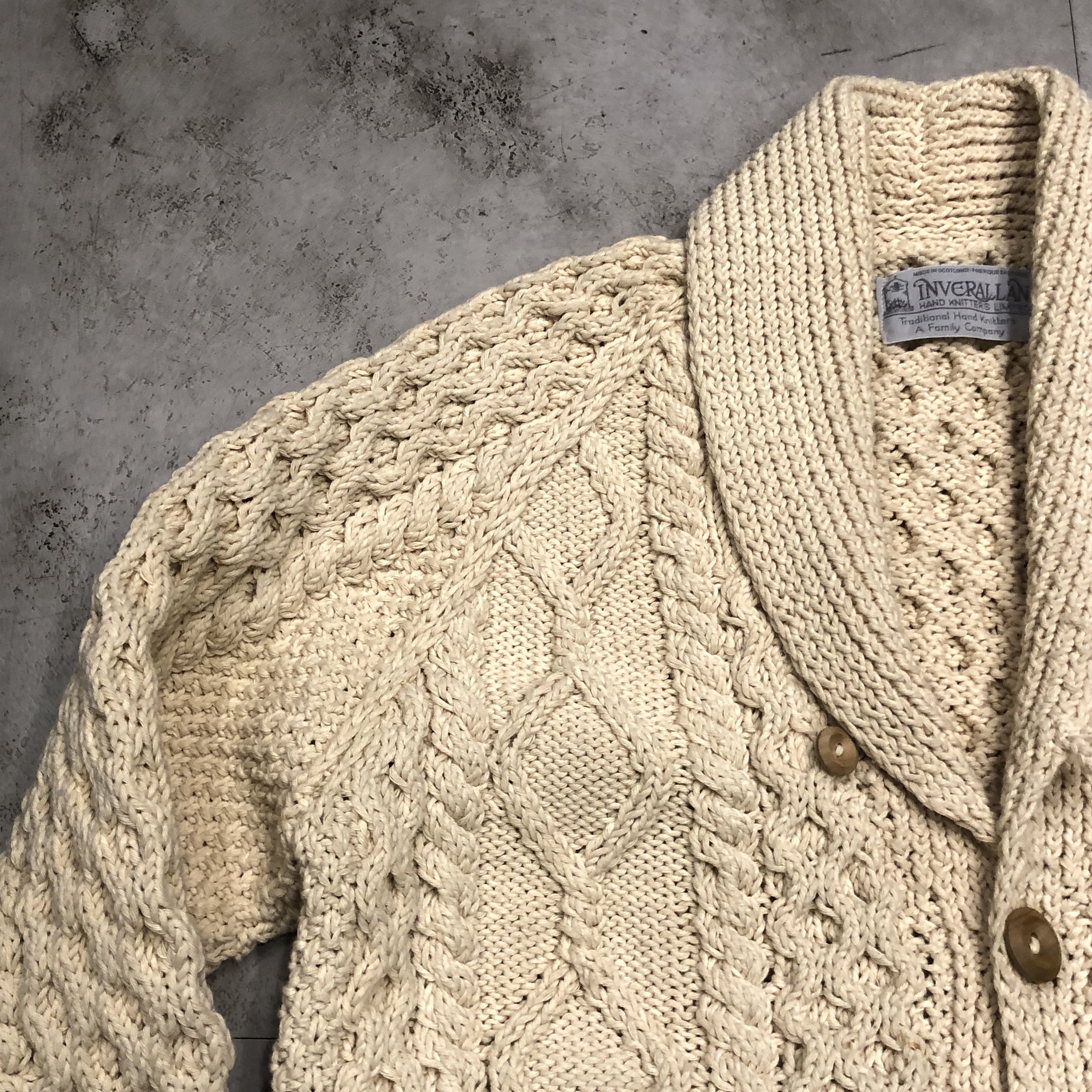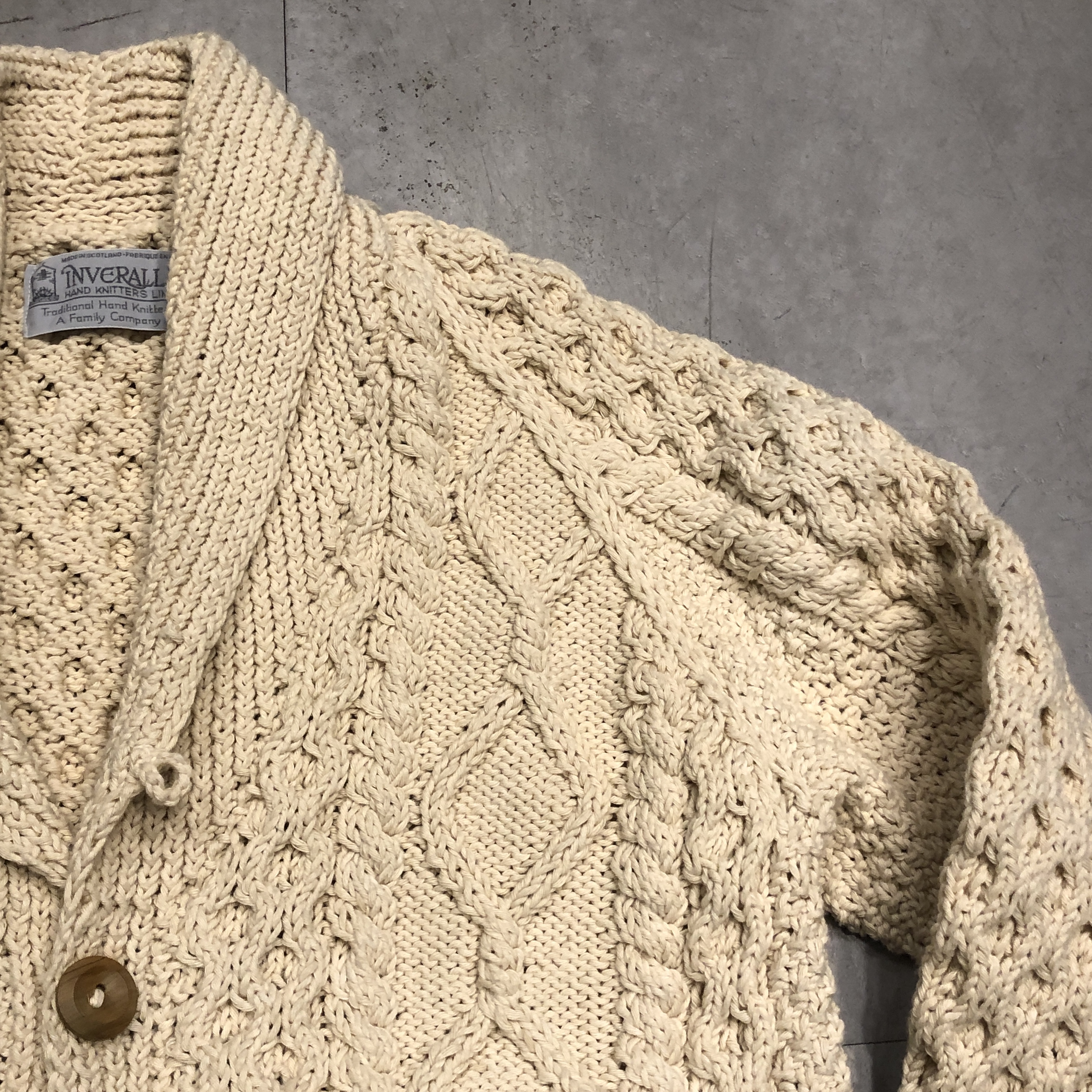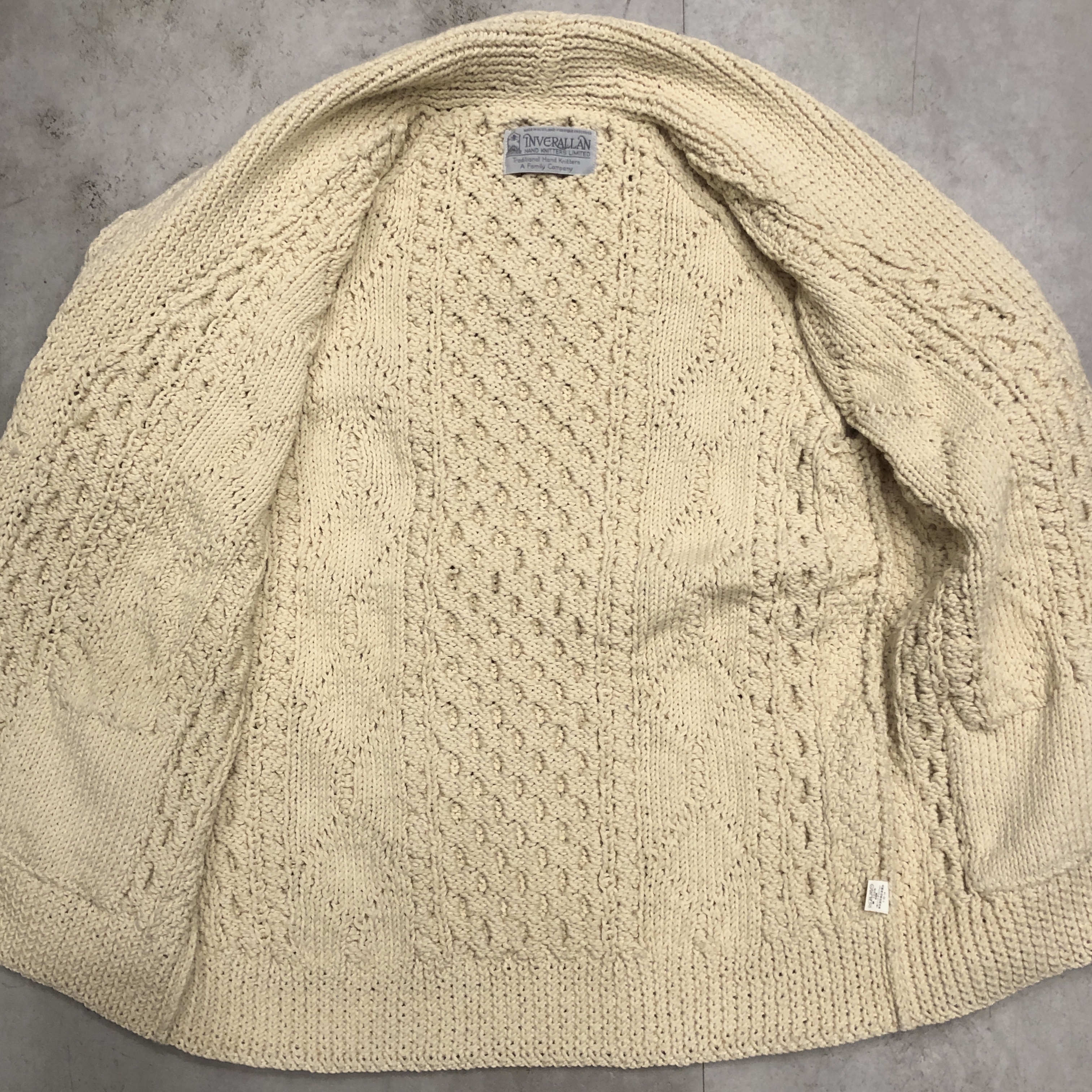- 1970年代より続くスコットランド発の名門〈INVERALLAN〉による、名作「6A」ハンドニットカーディガンのご紹介です。熟練した職人の手仕事により、1着編み上げるのに60時間以上を要するとも言われる名品。クラシックなアラン編みの模様と、存在感のあるウッドボタン、ざっくりとしたコットンの肉厚な風合いが相まって、まさに“一生モノ”と呼ぶにふさわしい佇まいです。