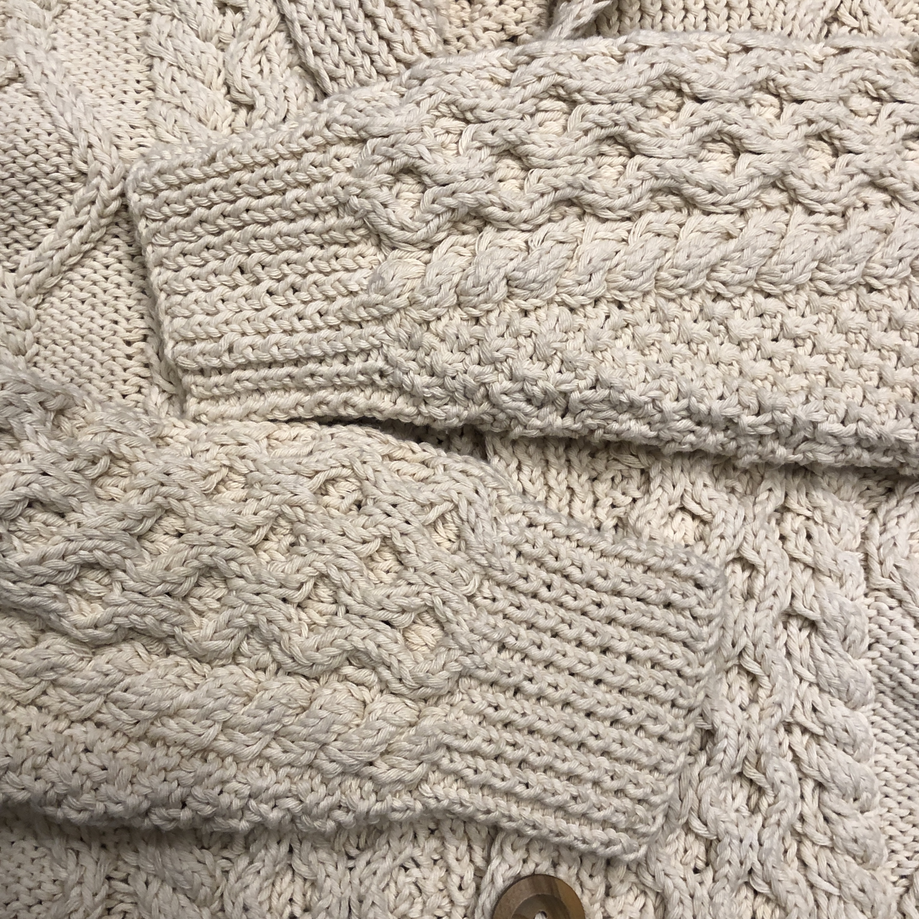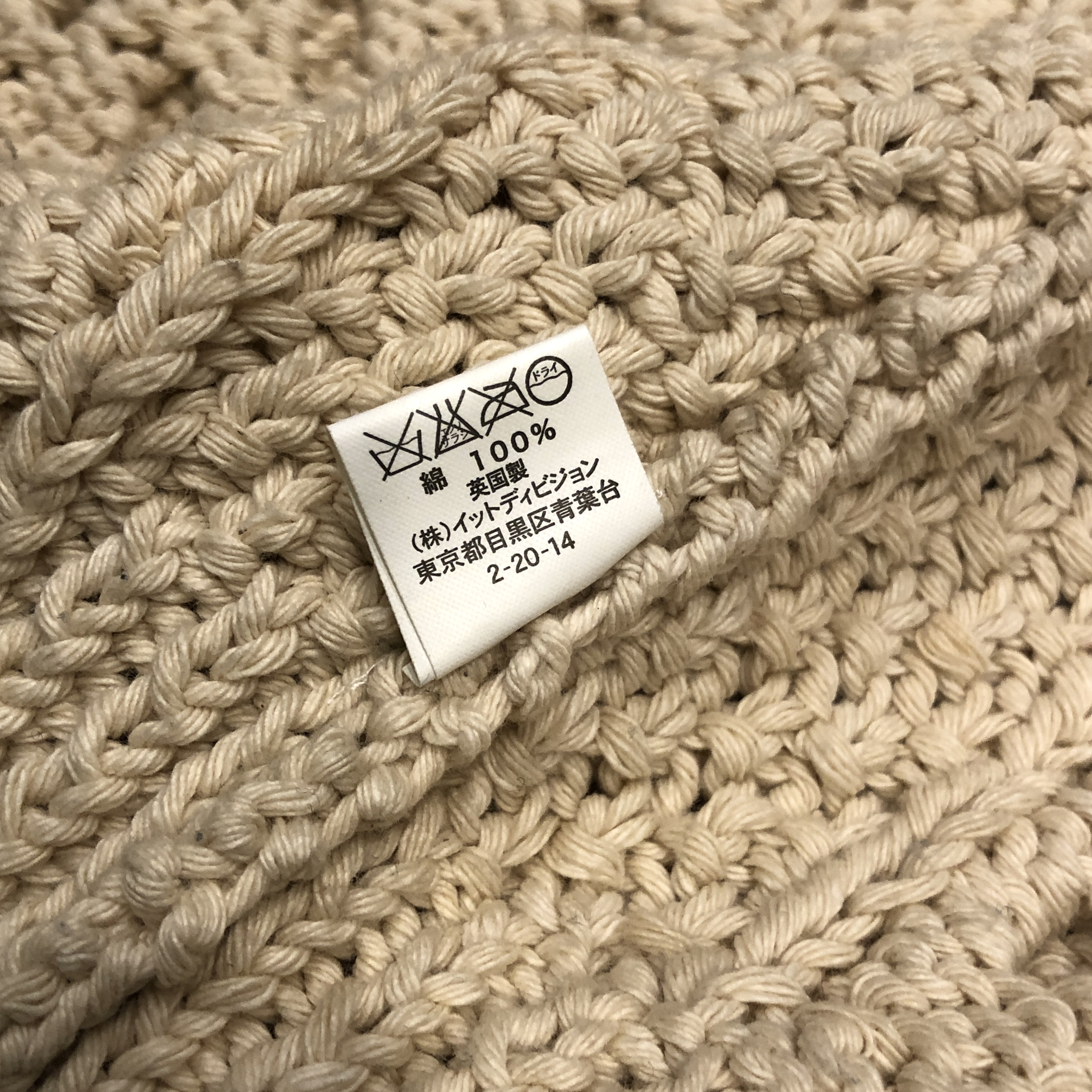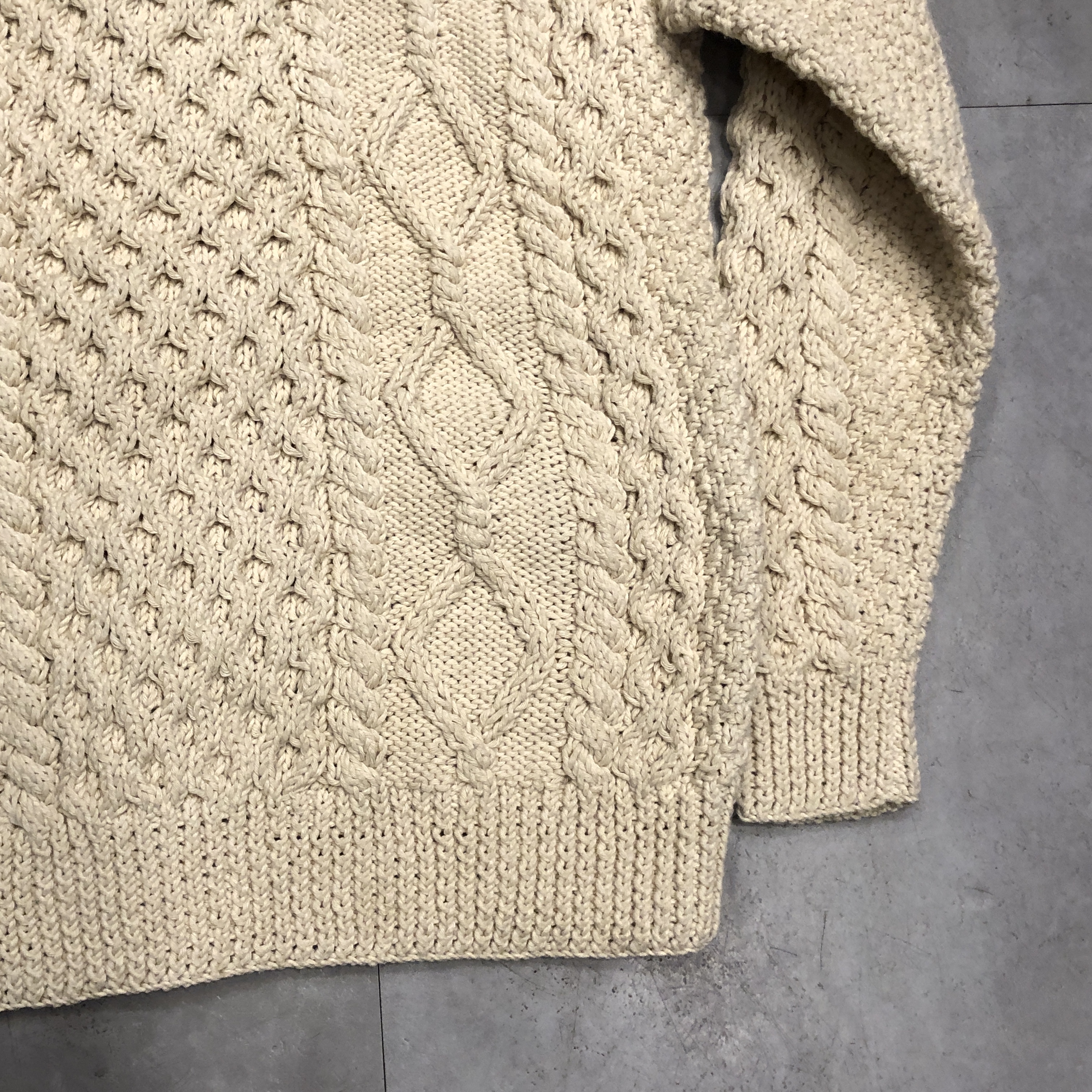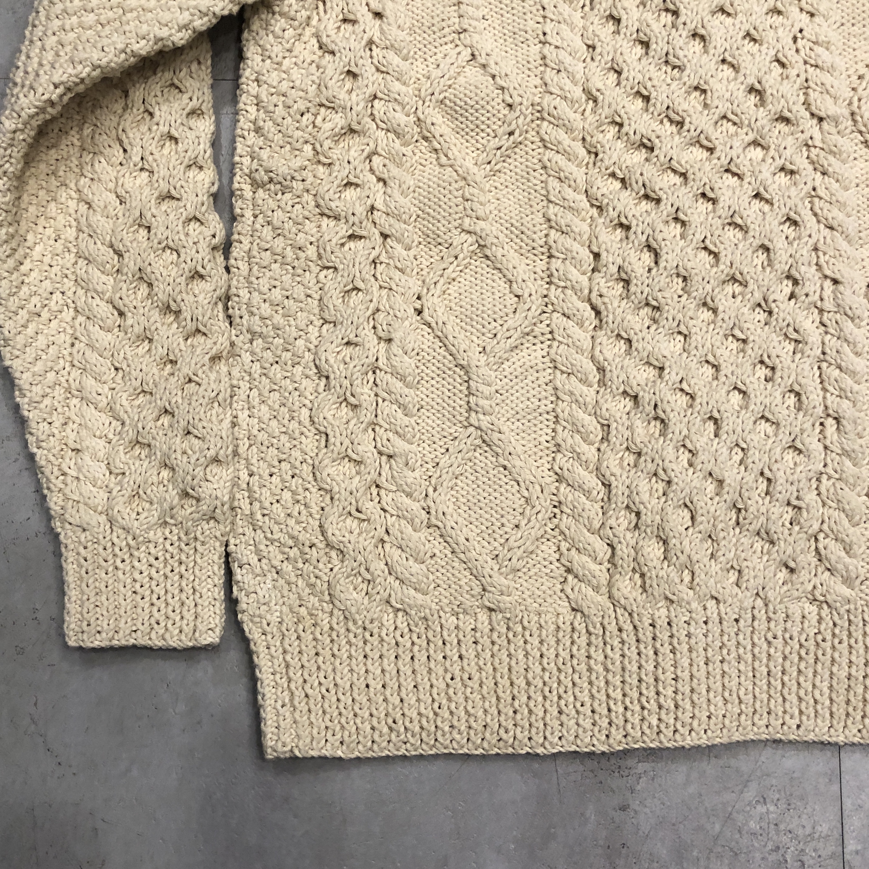 - 1970年代より続くスコットランド発の名門〈INVERALLAN〉による、名作「6A」ハンドニットカーディガンのご紹介です。熟練した職人の手仕事により、1着編み上げるのに60時間以上を要するとも言われる名品。クラシックなアラン編みの模様と、存在感のあるウッドボタン、ざっくりとしたコットンの肉厚な風合いが相まって、まさに“一生モノ”と呼ぶにふさわしい佇まいです。