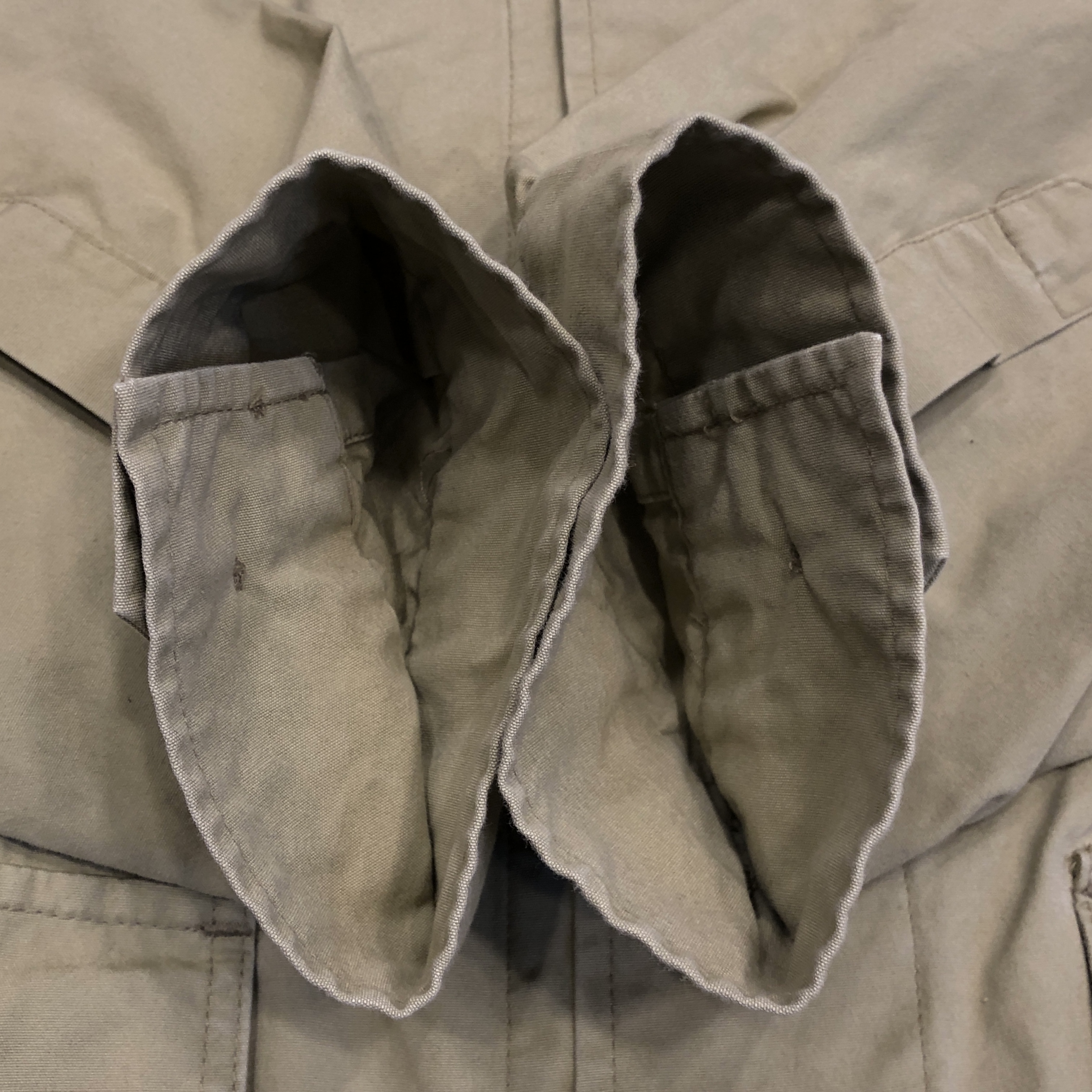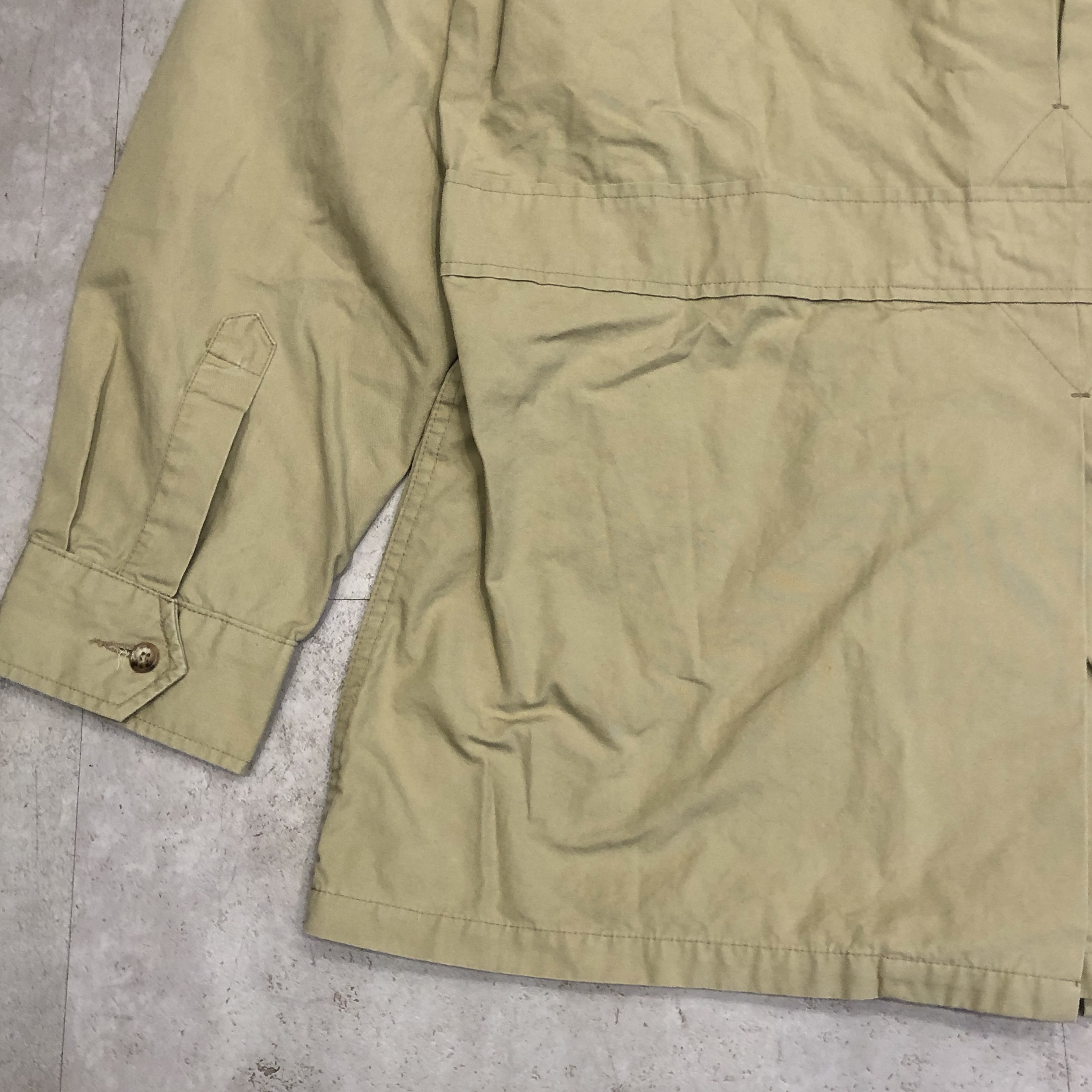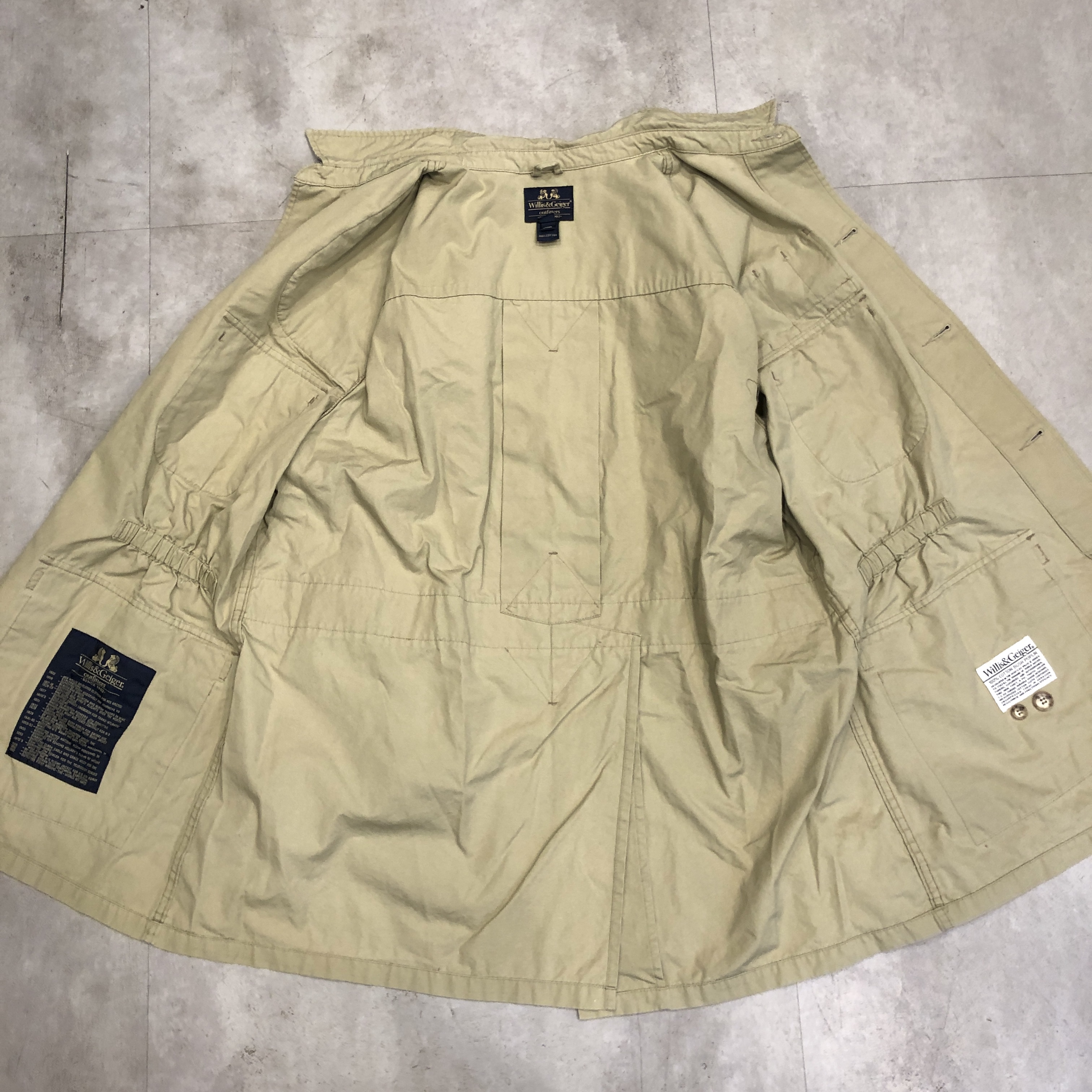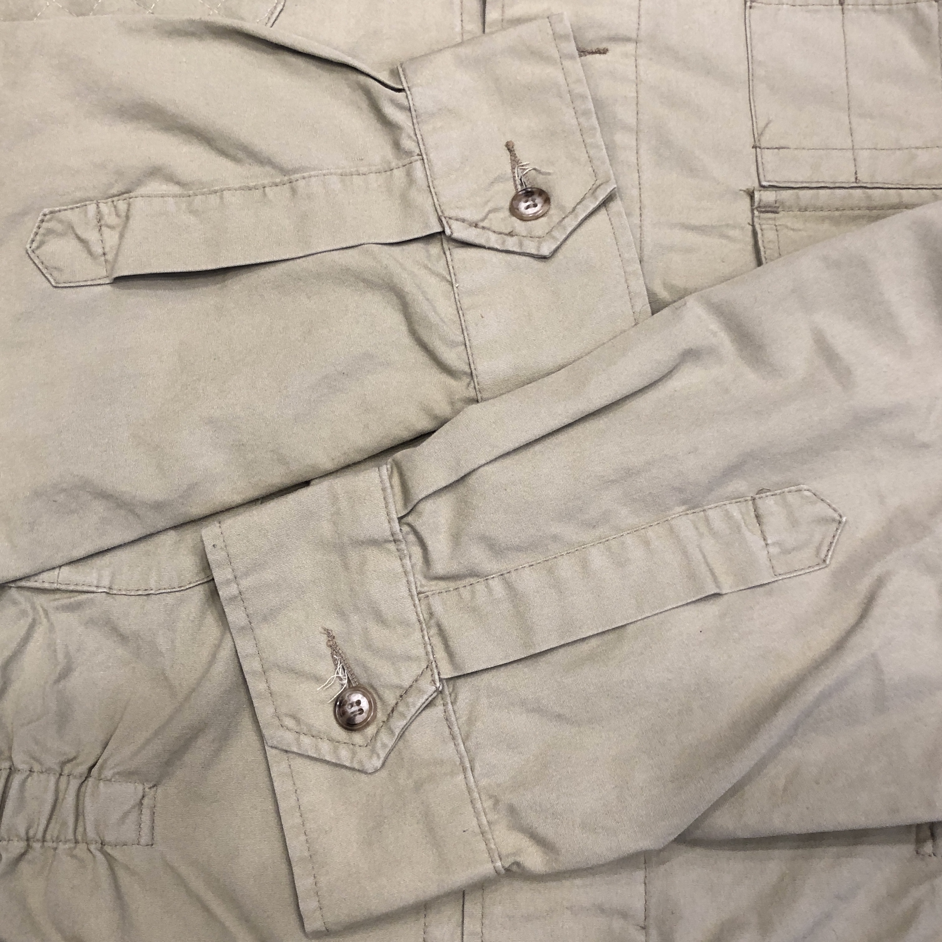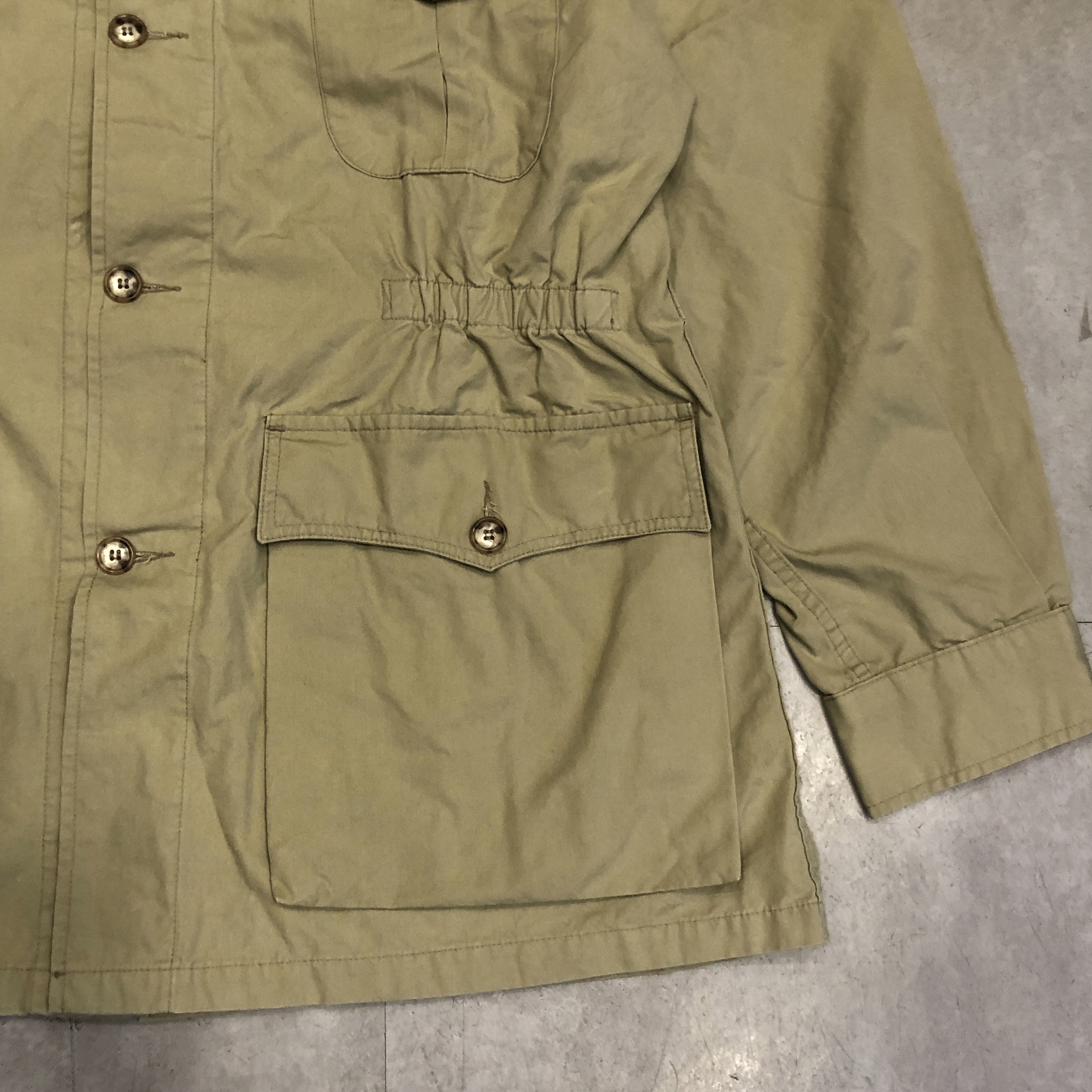表地はウィリス&ガイガー伝統の“コットン・ブッシュポプリン”。7.5オンスという厚みを持ちながら、しなやかで水にも強く、経年で美しい表情を見せてくれます。4つの大型フラップポケット、肩のキルティング補強、絶妙なウエストギャザー、ミリタリージャケット譲りのショルダーループなど、随所に機能美が溢れるディテール。内タグには当時から変わらぬ開発コンセプトが誇らしげに記されています。