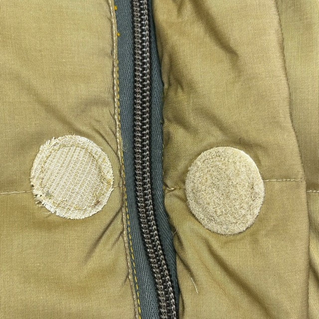 極寒地でも凍らないようにフロントボタンは金属ではなく、丸いベルクロを使用し、