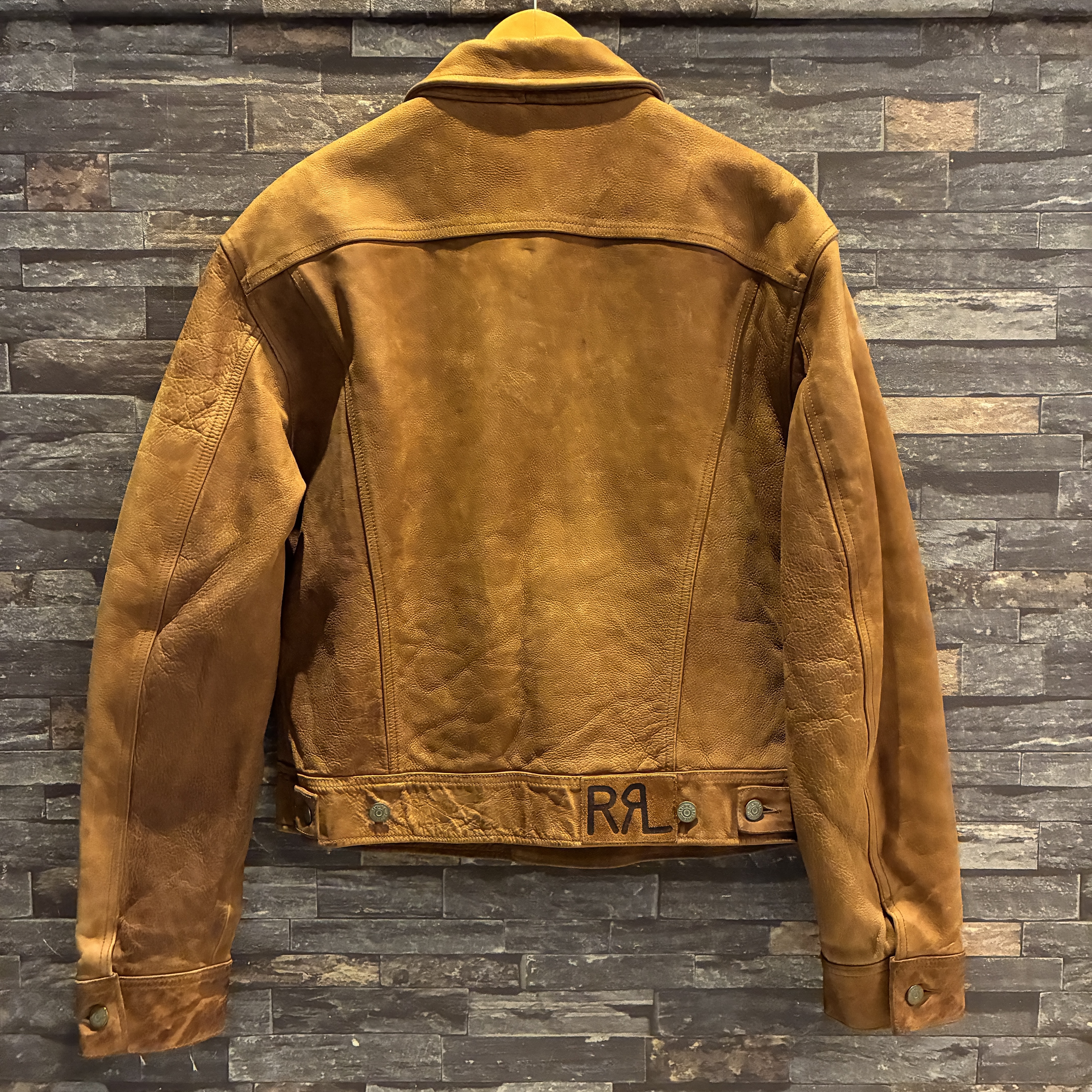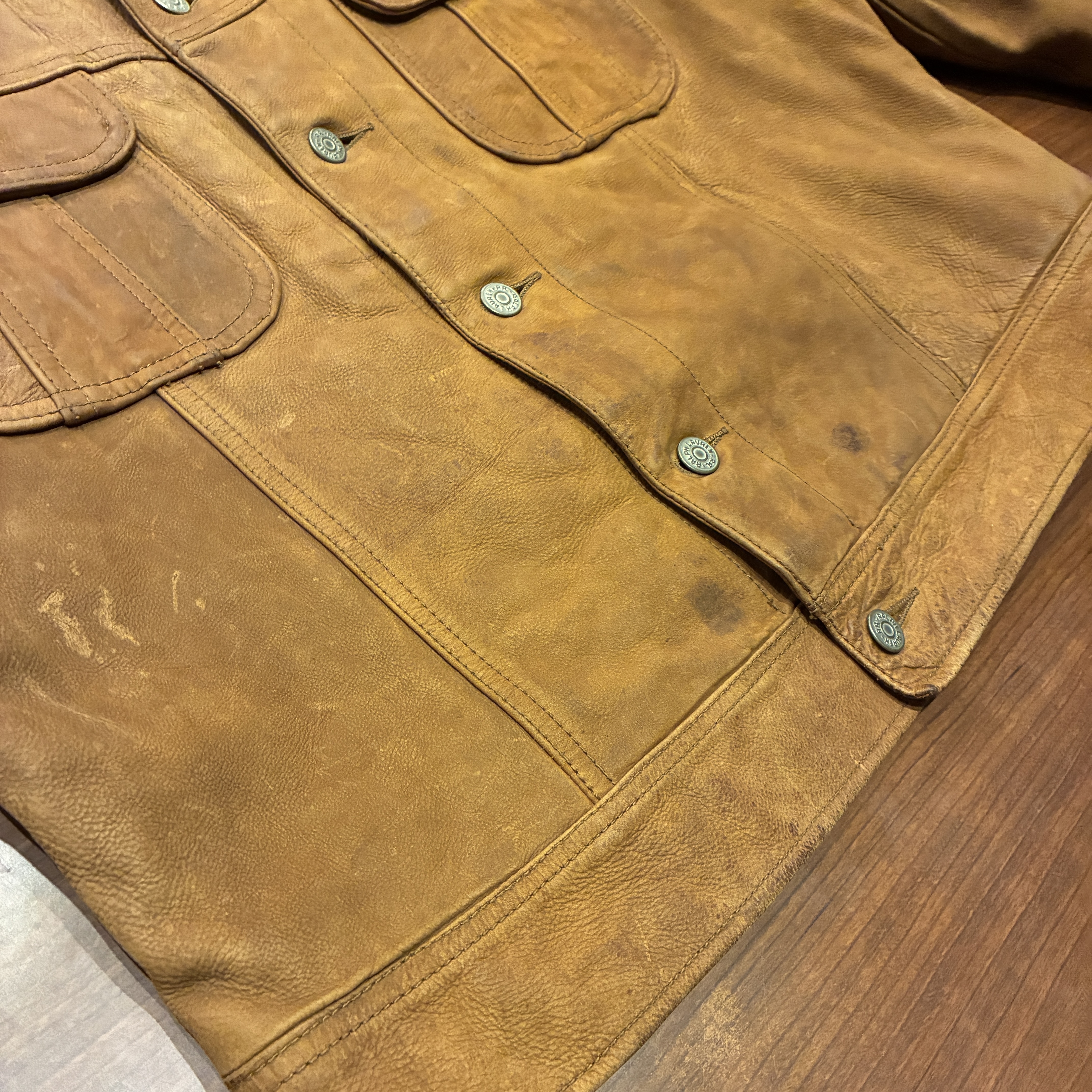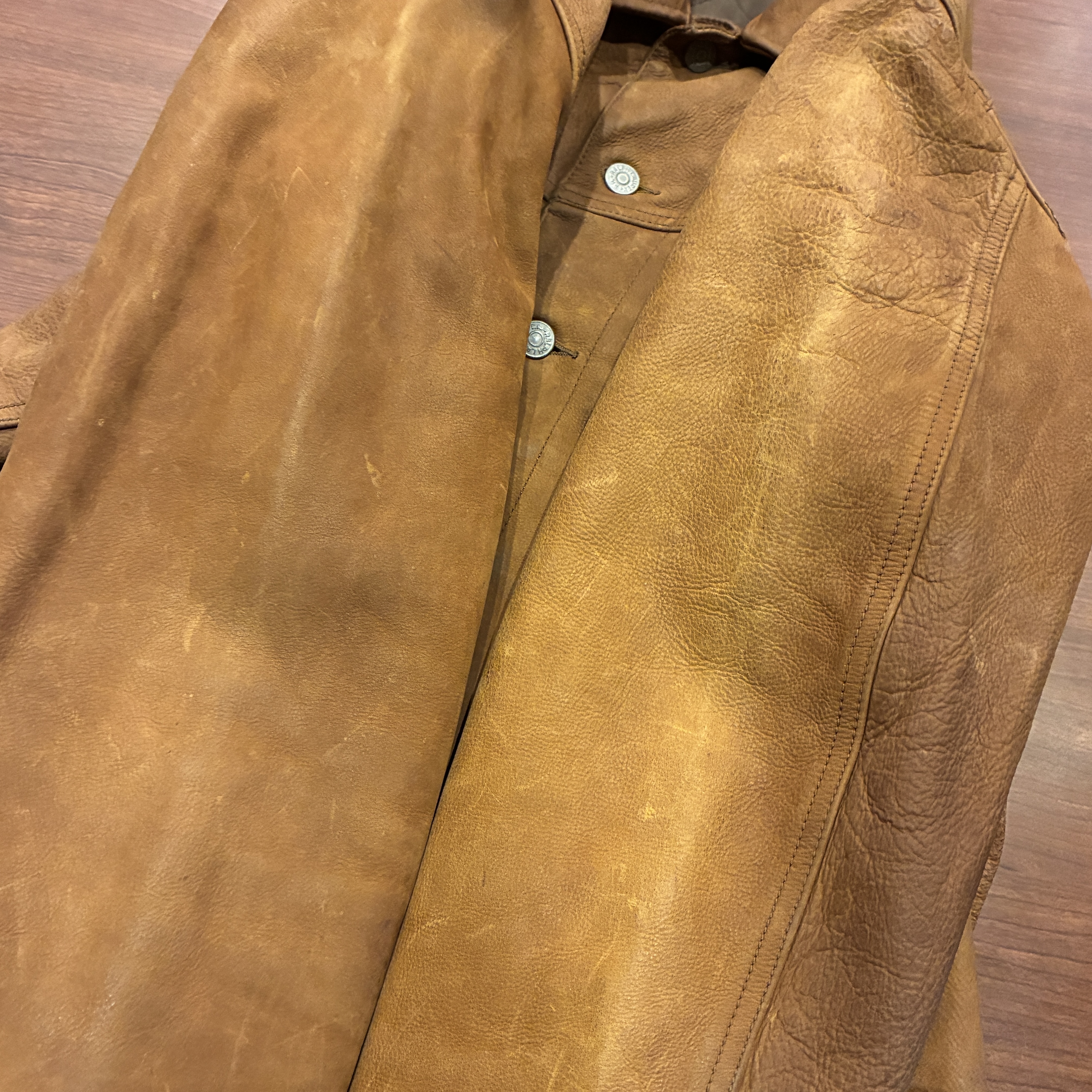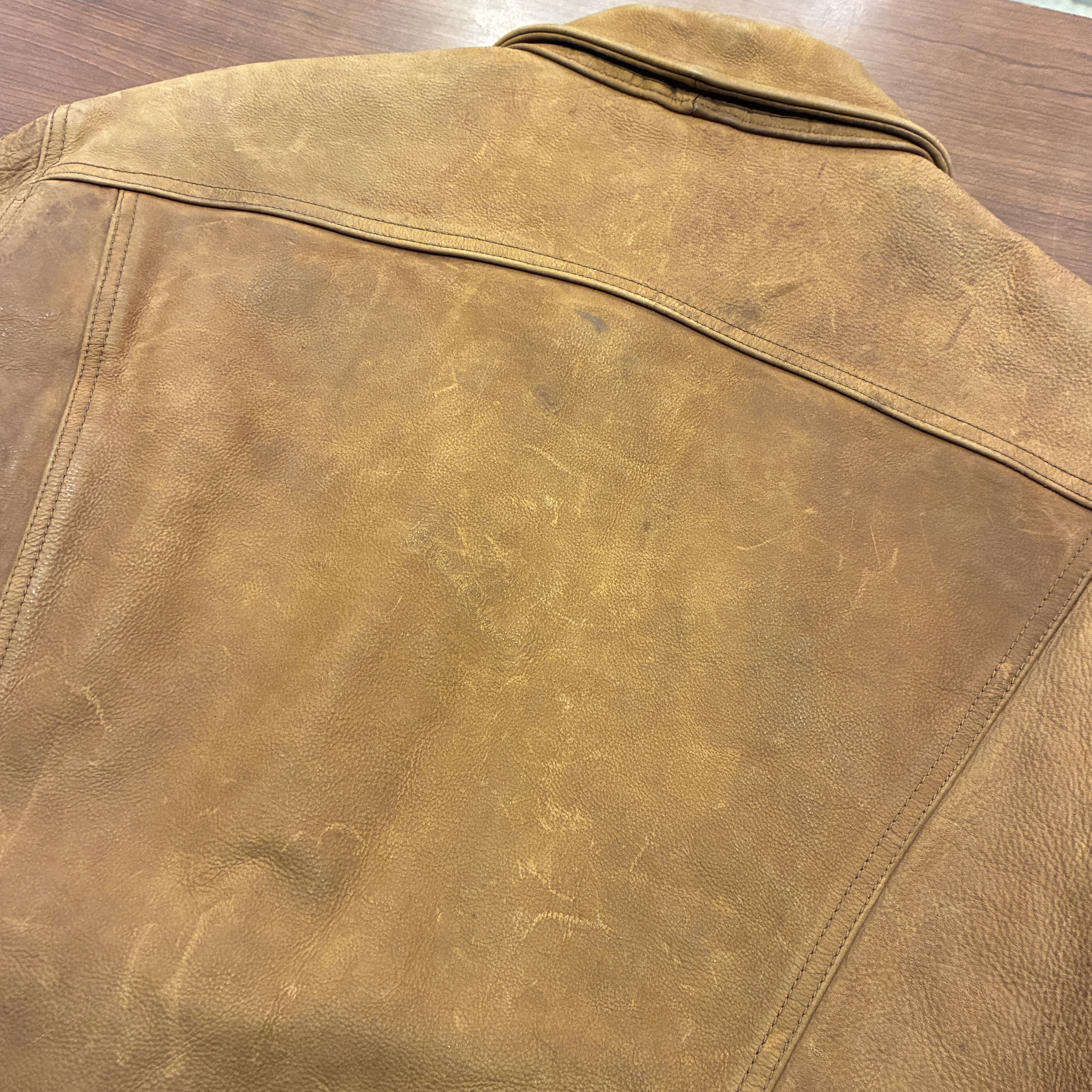 - レザー特有の傷やシワ、黒ずみや袖に焼け等の着用感がございますが、他に目立つ汚れやダメージ等は無く、まだまだ問題無く着用していただける状態です。