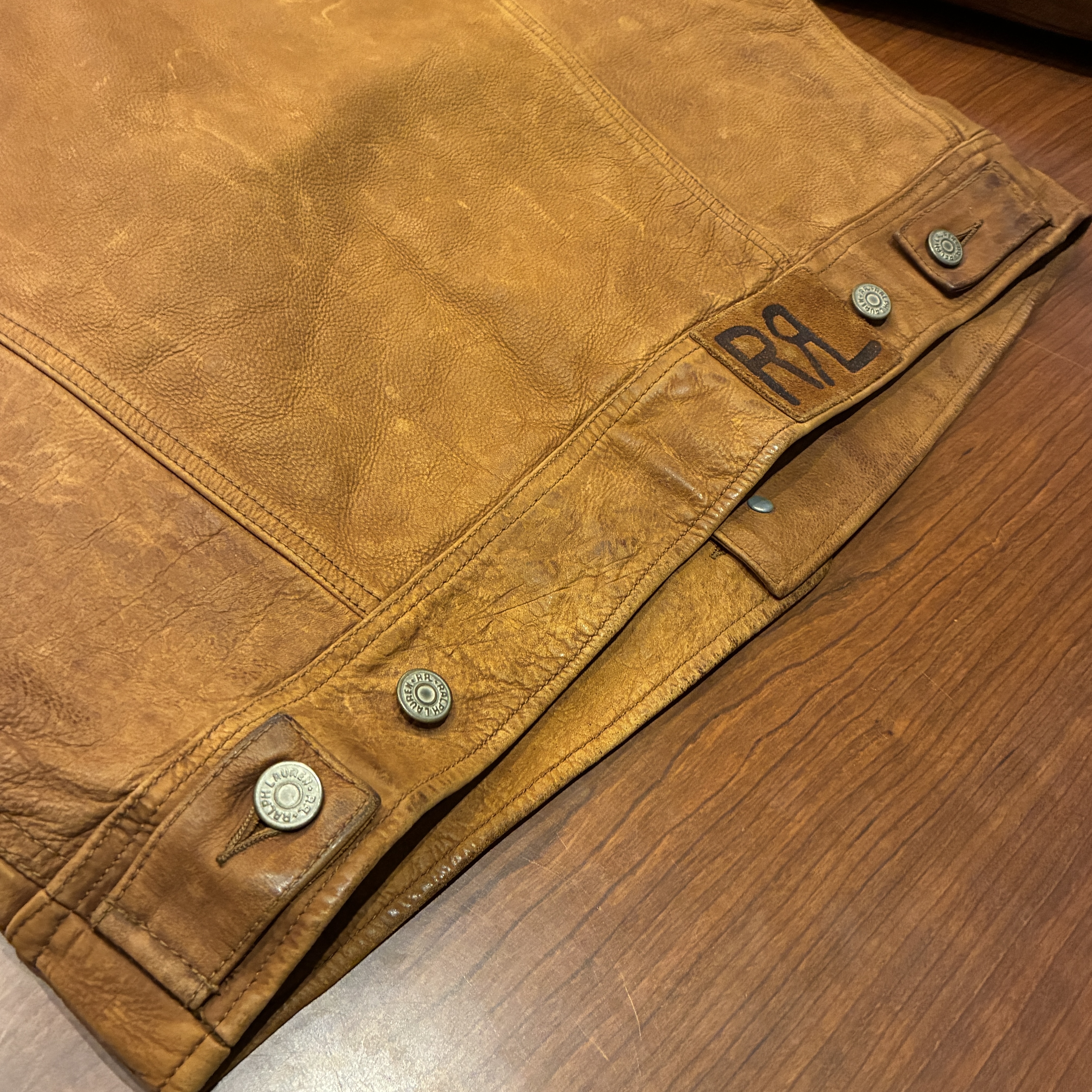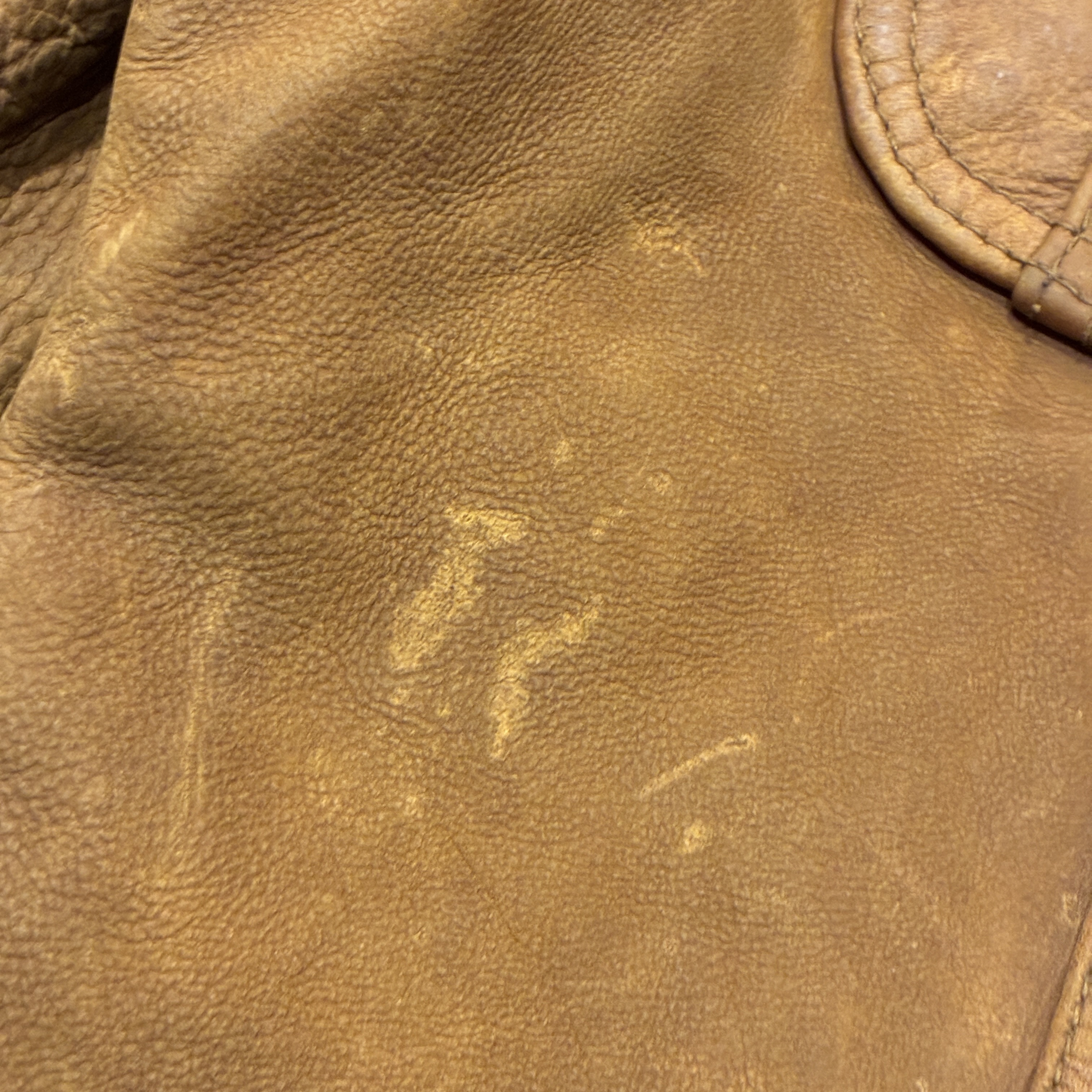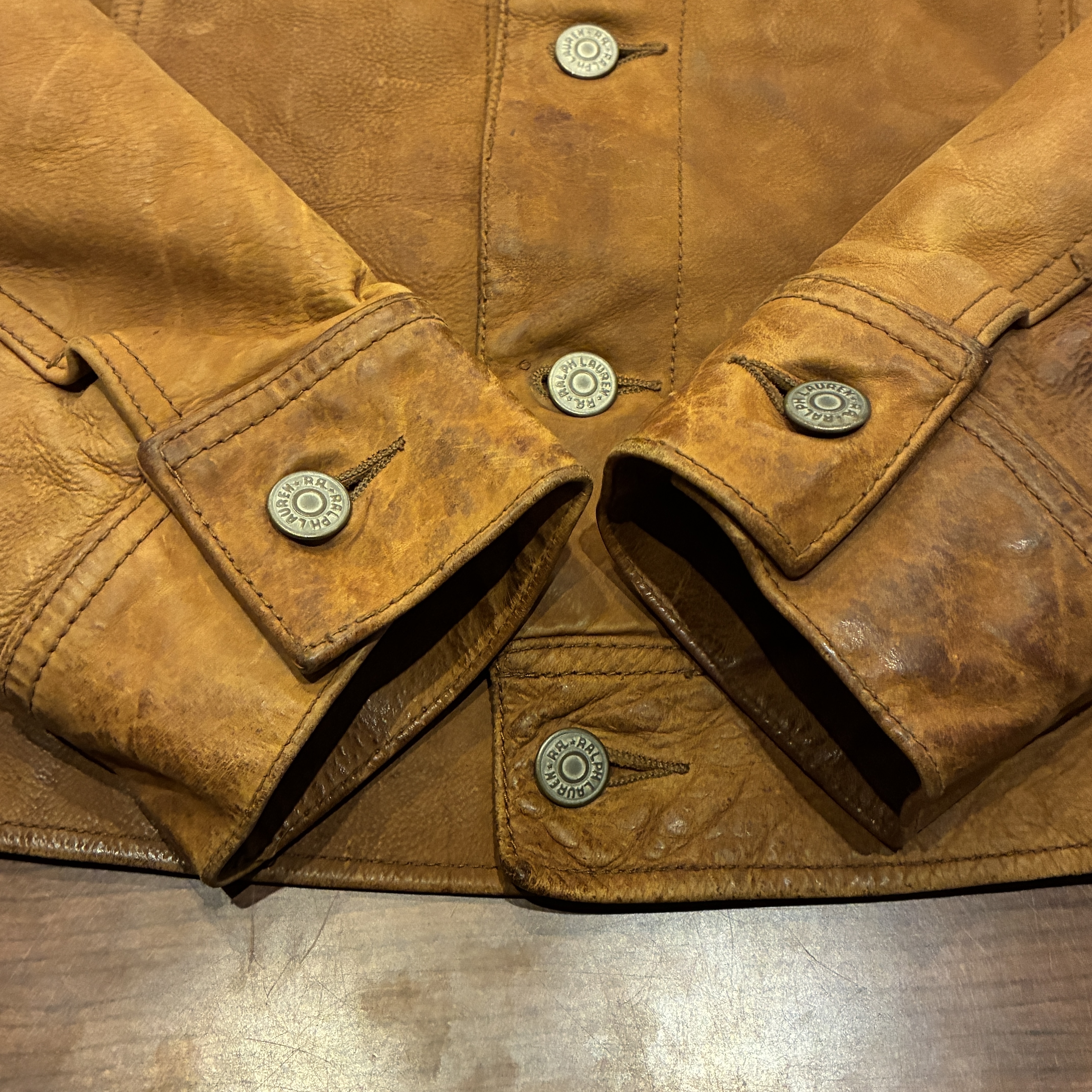 - レザー特有の傷やシワ、黒ずみや袖に焼け等の着用感がございますが、他に目立つ汚れやダメージ等は無く、まだまだ問題無く着用していただける状態です。