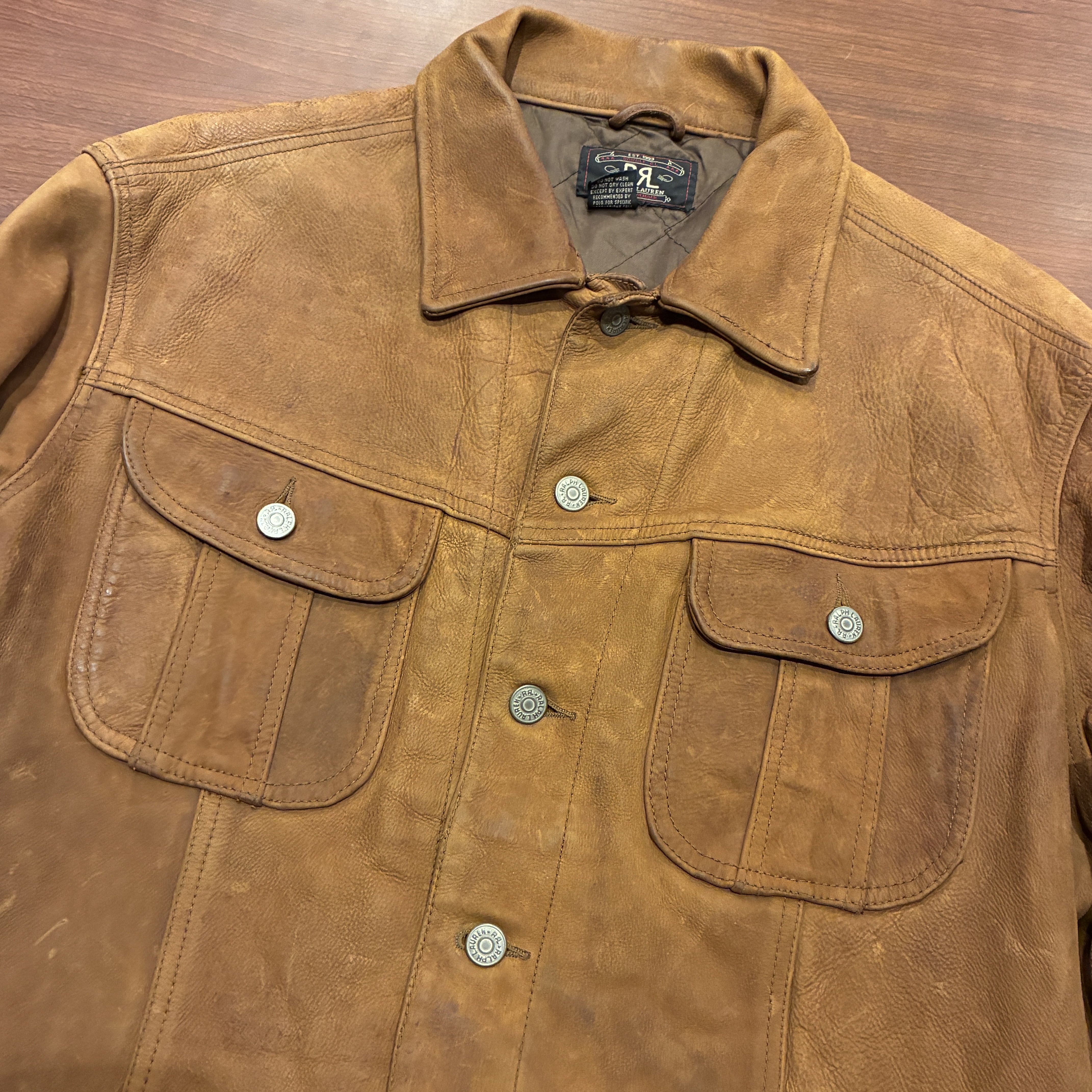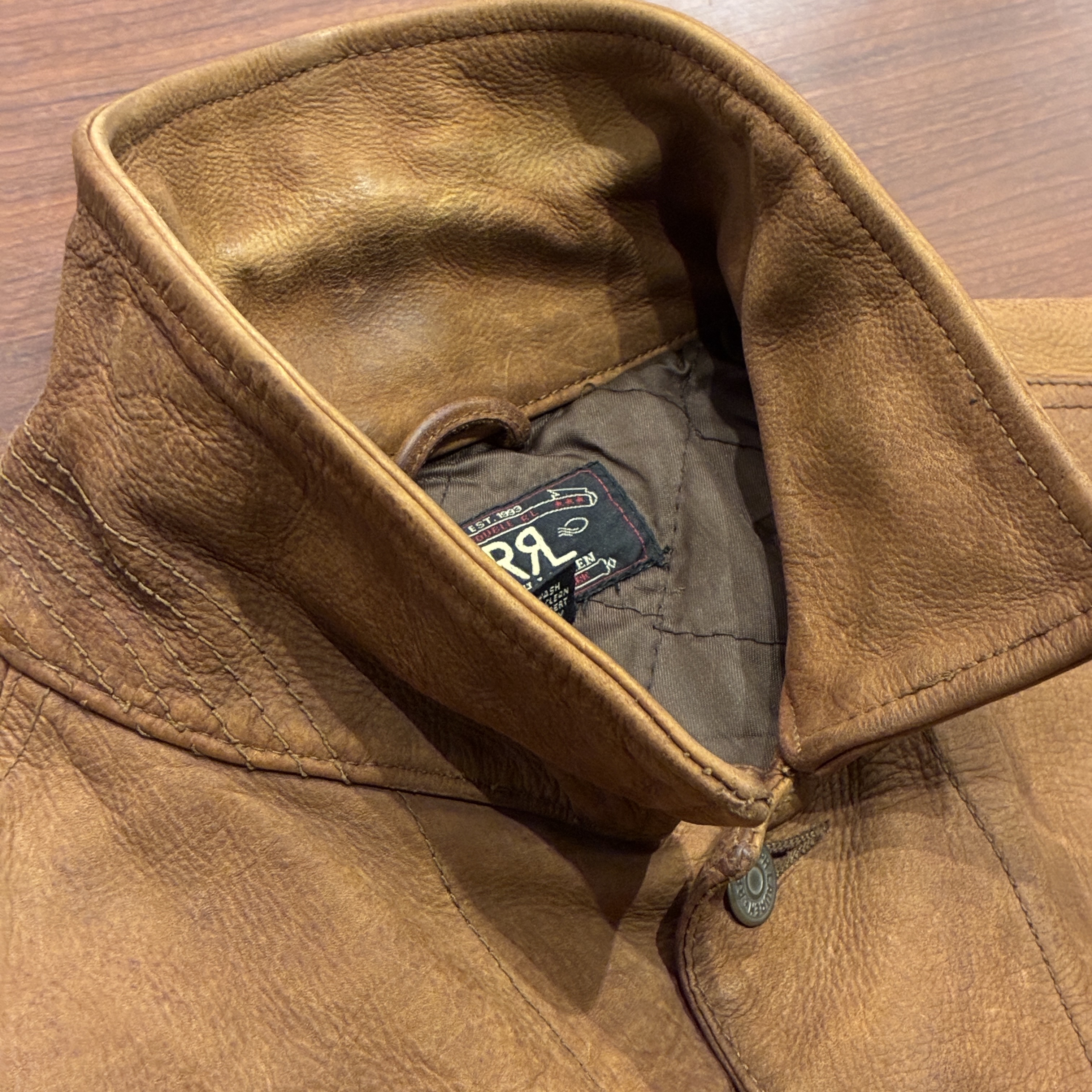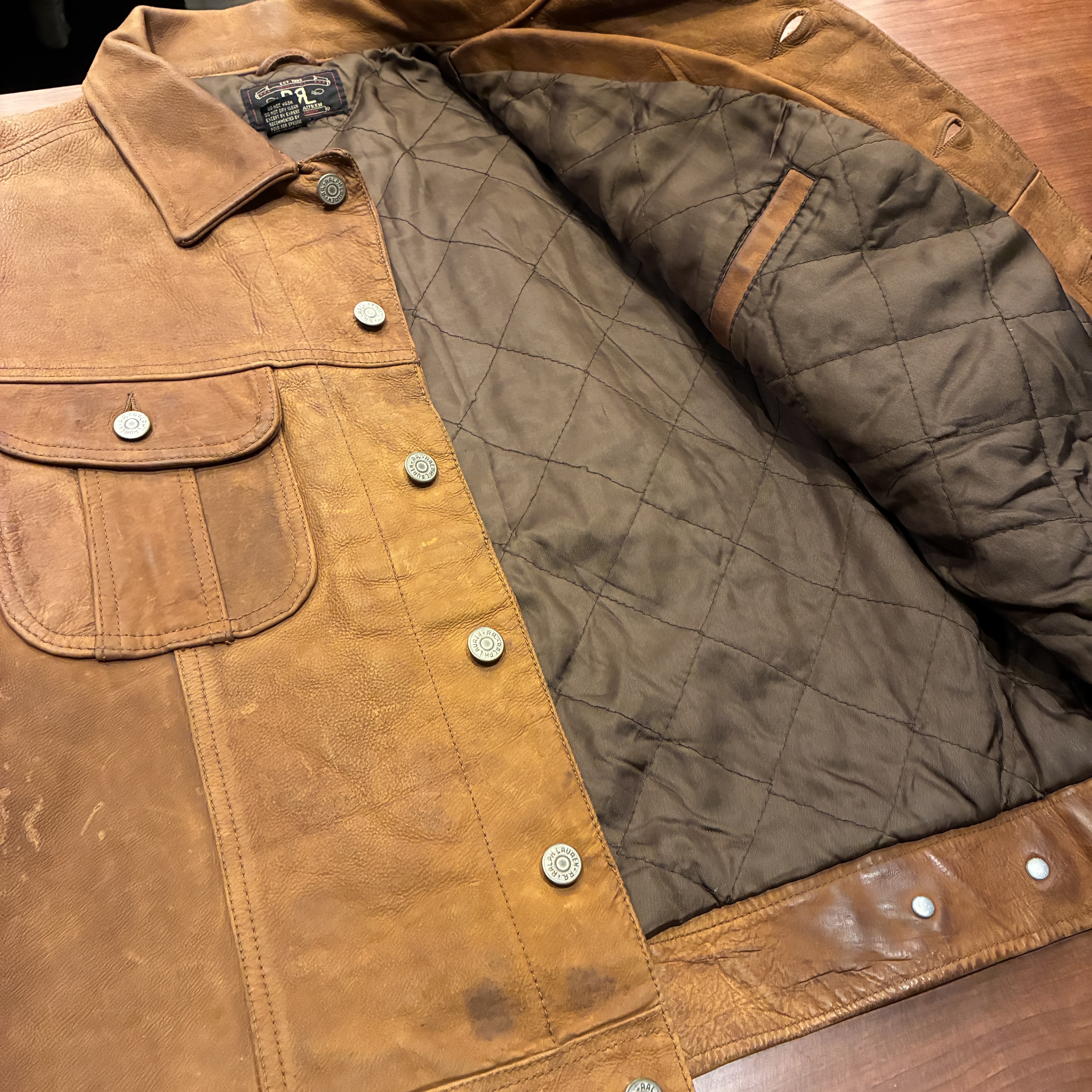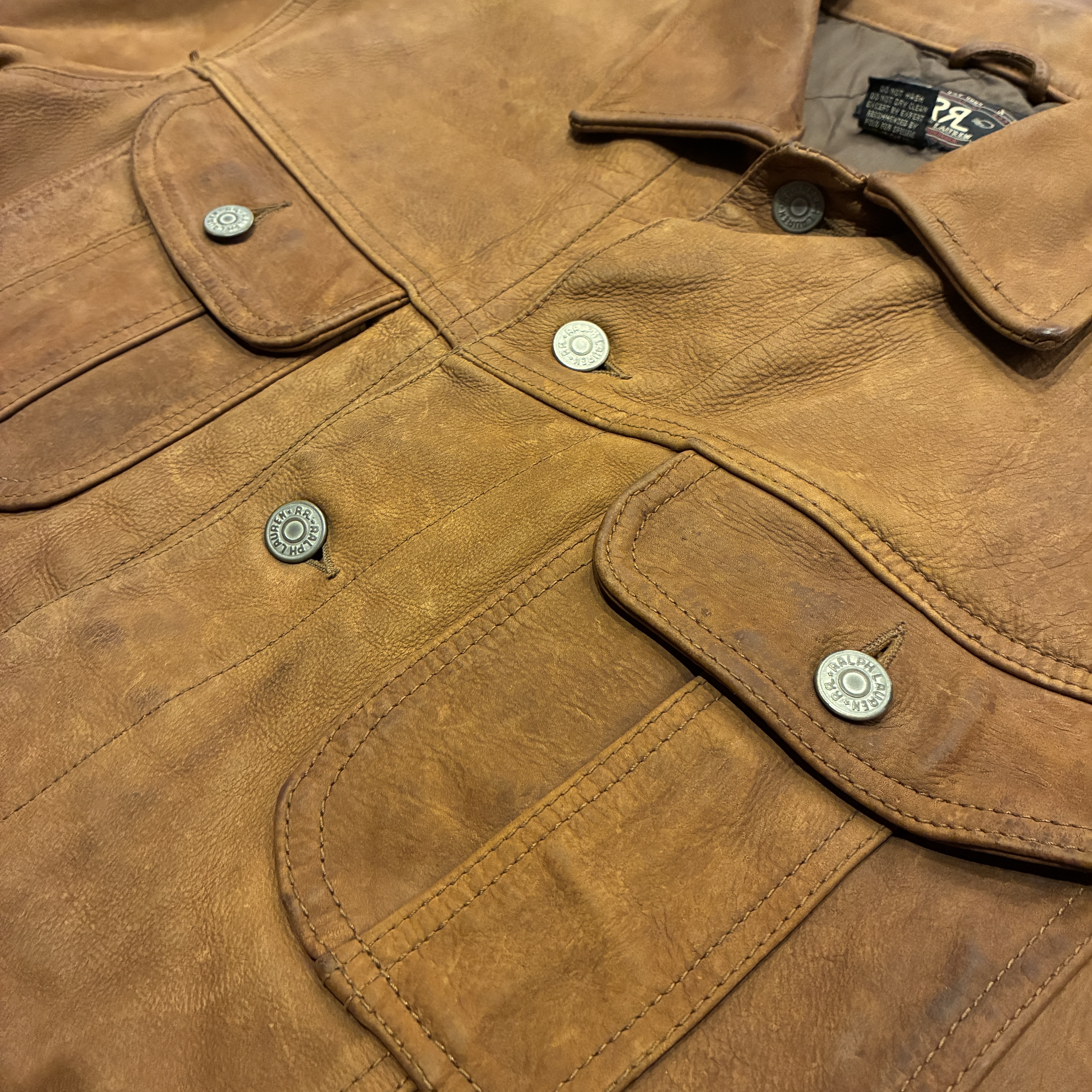 - レザー特有の傷やシワ、黒ずみや袖に焼け等の着用感がございますが、他に目立つ汚れやダメージ等は無く、まだまだ問題無く着用していただける状態です。