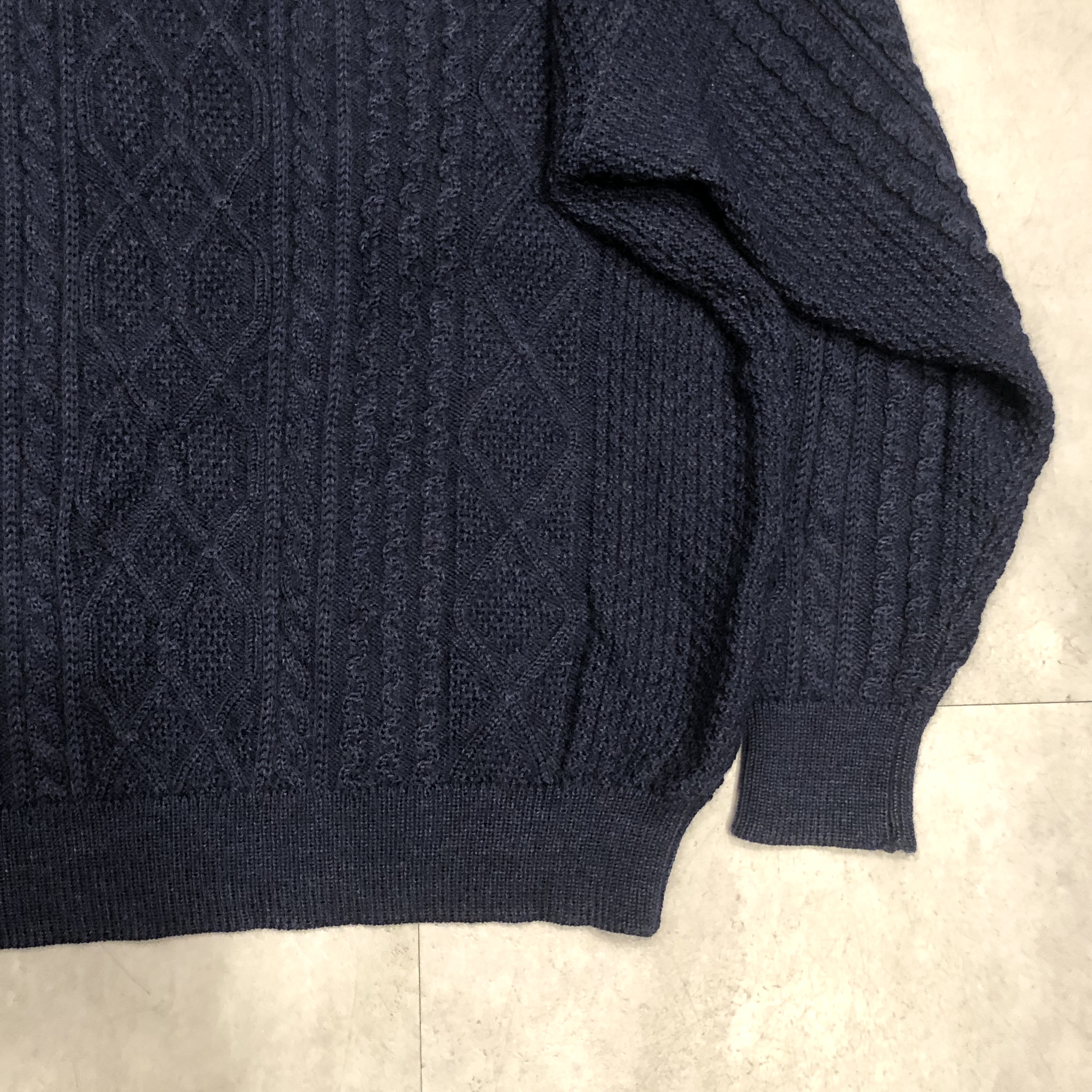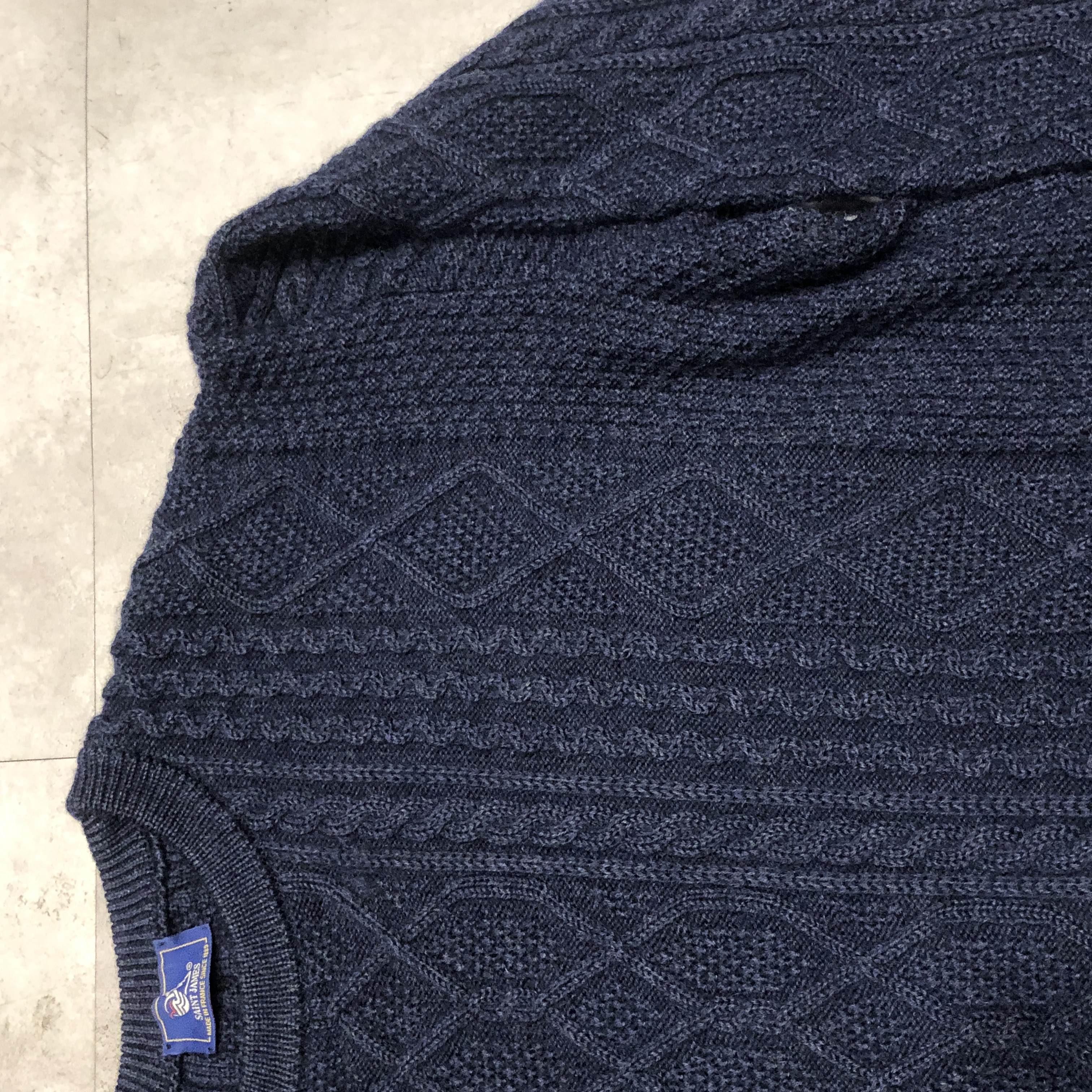 前身頃から袖、背面までびっしりと編み込まれたダイヤ柄やロープ状のケーブルは、立体感があり、まるで手編みのような存在感。現行品にはない“膨らみ・軽さ・油分(ラノリン)”が残るウールを用いており、クラシックニットに特有のふっくらとした温かみが感じられます。