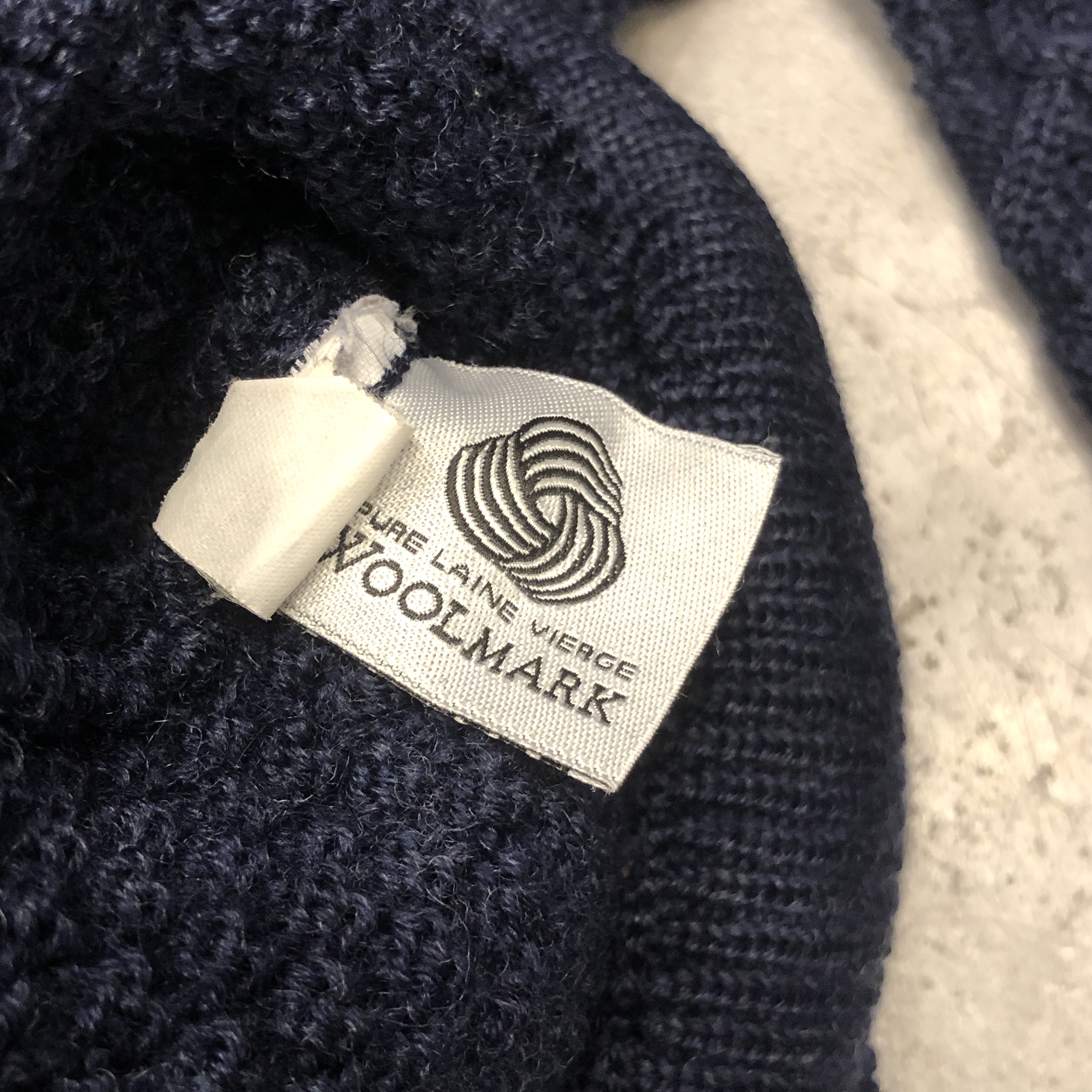 タグはブルー×ゴールドの刺繍ロゴに「MADE IN FRANCE SINCE 1889」表記、WOOLMARKタグ、欧州〜USAのサイズ表記タグが揃う組み合わせ。この構成から 80年代後半〜90年代前期 の生産が濃厚。セントジェームスが最も品質の良かった“黄金期”の個体といえます。