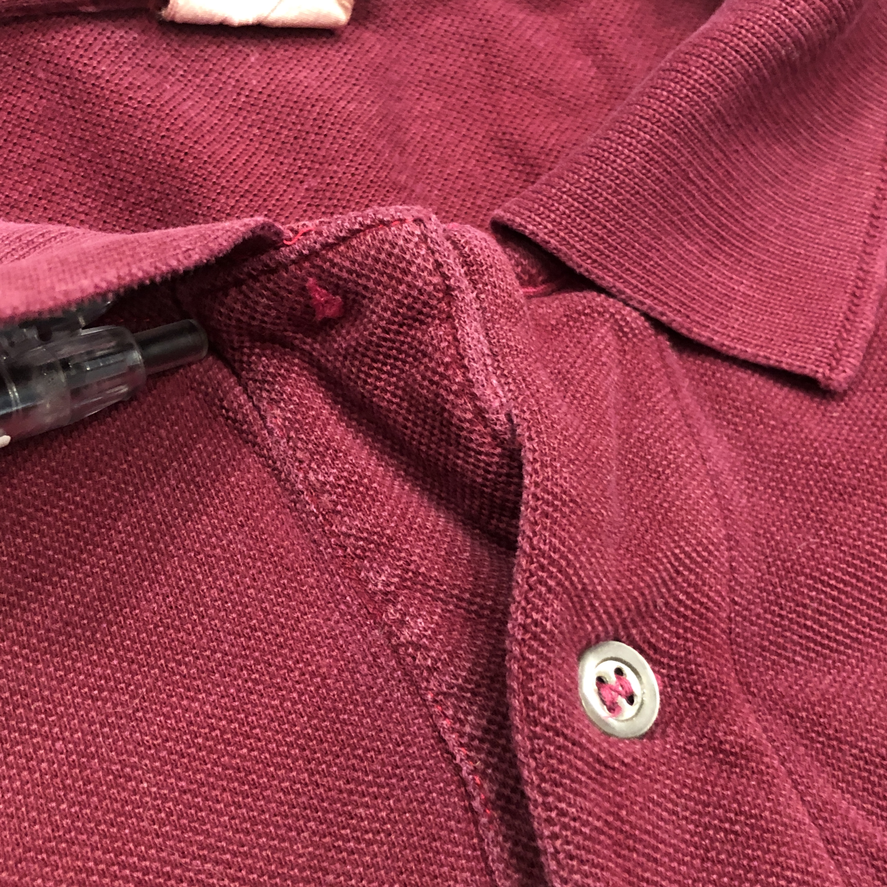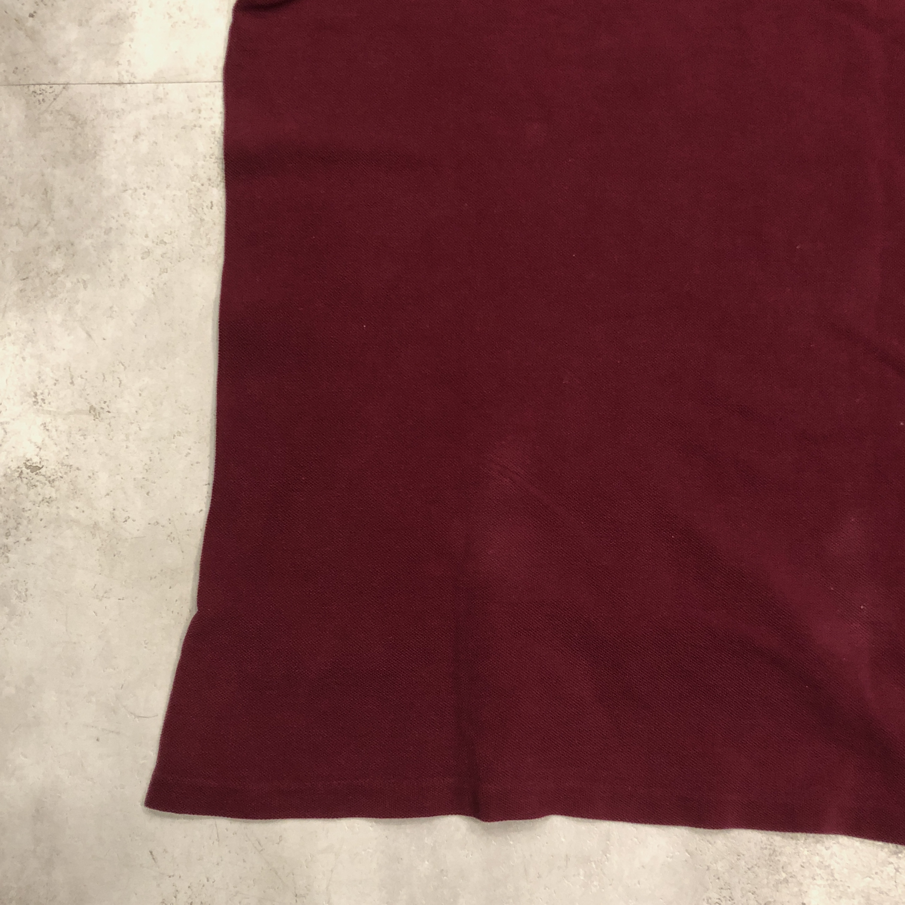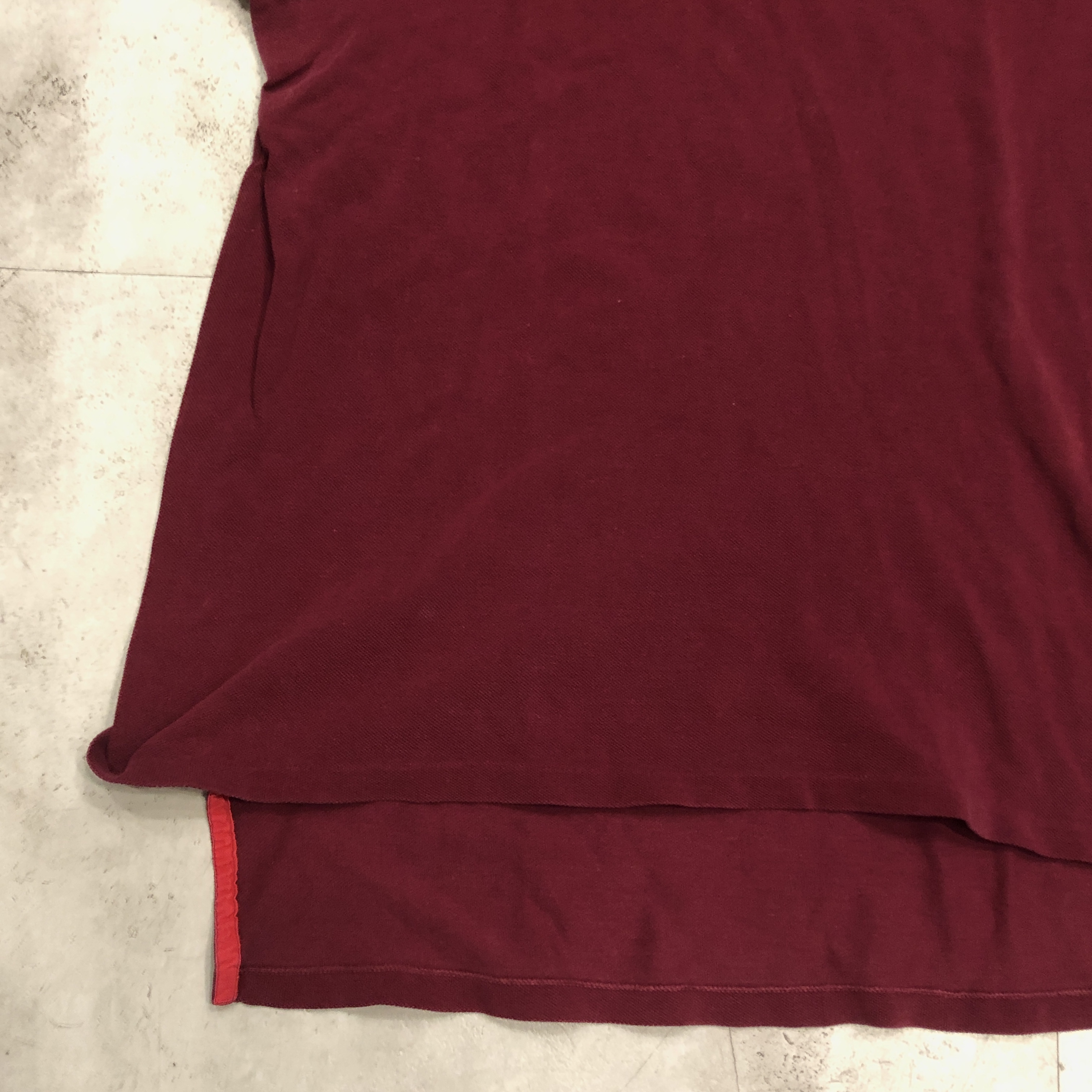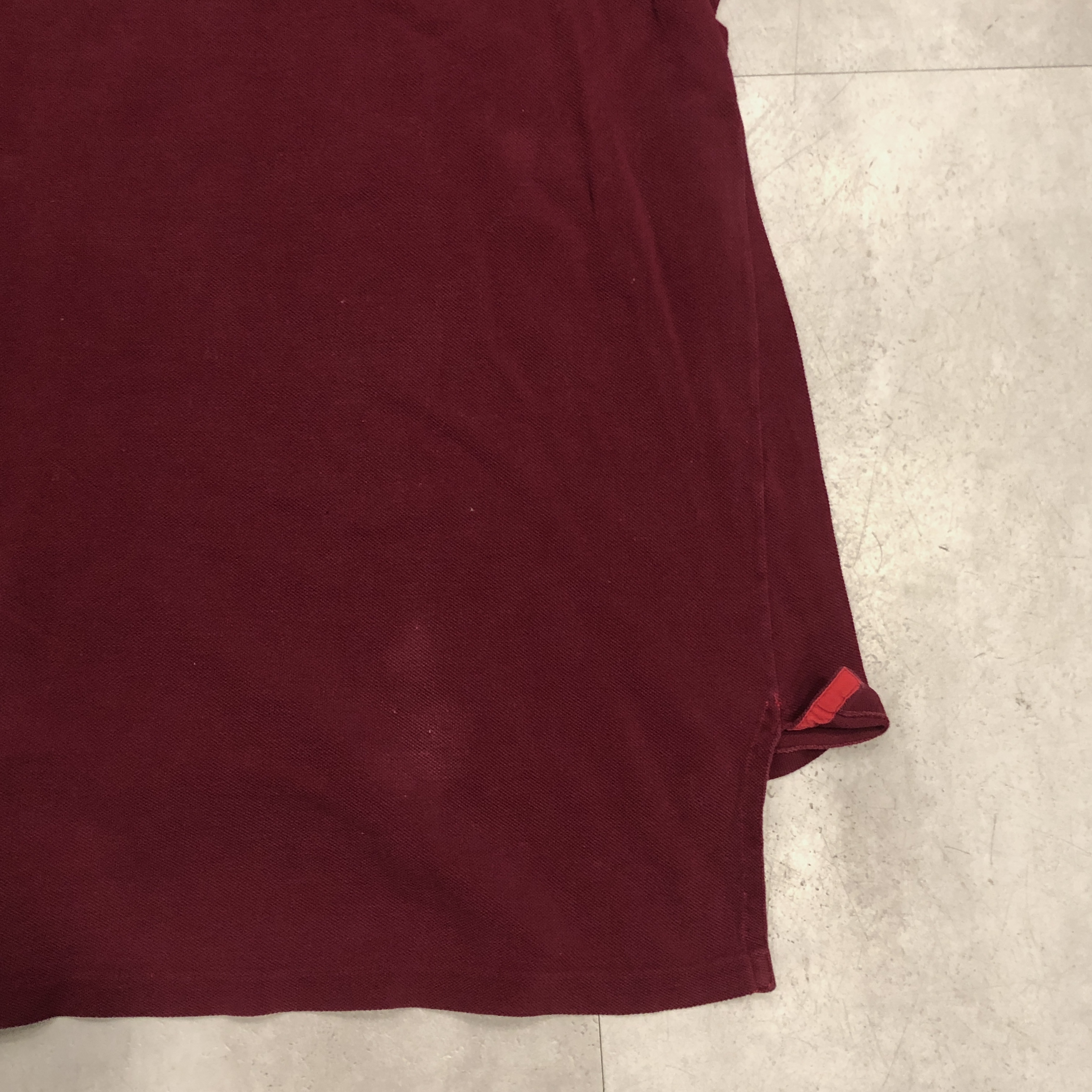 さらに内側には、素材を示す“100%COTON”タグ付き。柔らかな鹿の子編み地は、着用を重ねるごとに肌になじむ育て甲斐のある風合い。色味はやや褪せ感を伴ったバーガンディで、スポーティかつ洗練された佇まいを演出しています。