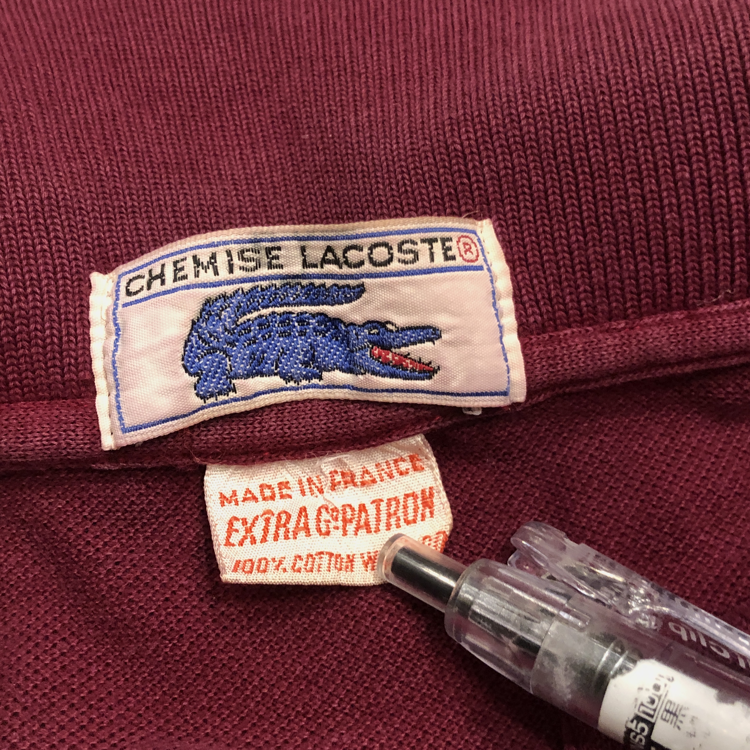 ワニロゴ下に「MADE IN FRANCE」「EXTRA G'PATRON 」と赤文字で並ぶタグ構成は、この年代の特徴的意匠。現行とは一線を画す刺繍バランスやボディシルエット、タグの質感まで、当時の職人気質が随所に漂います。