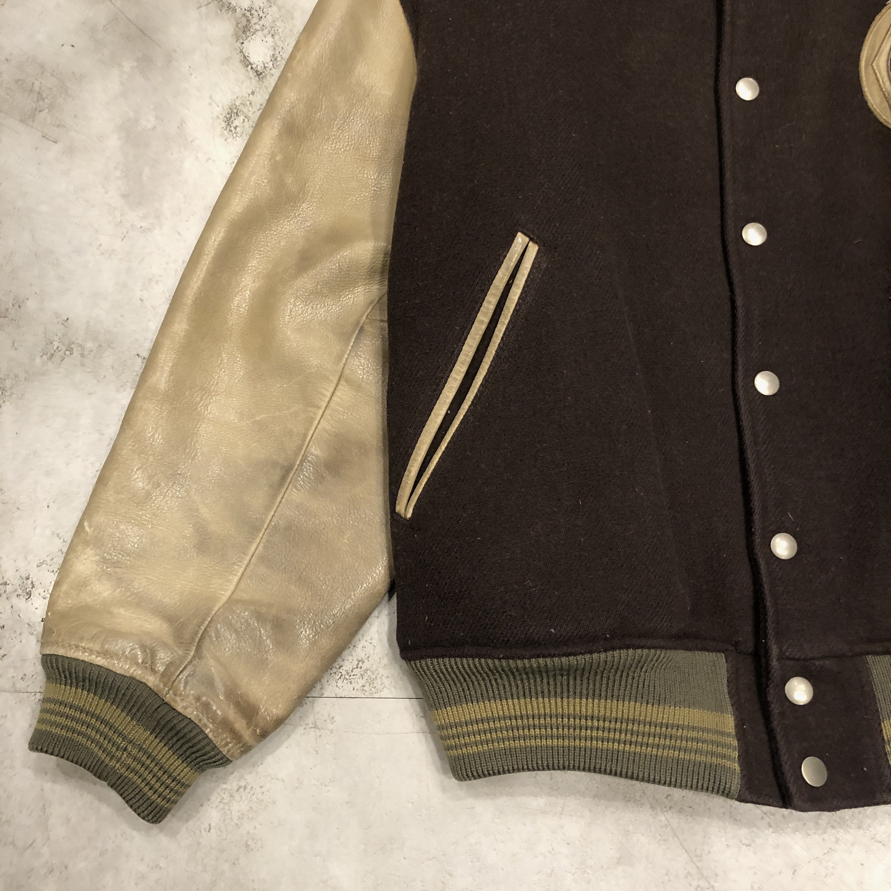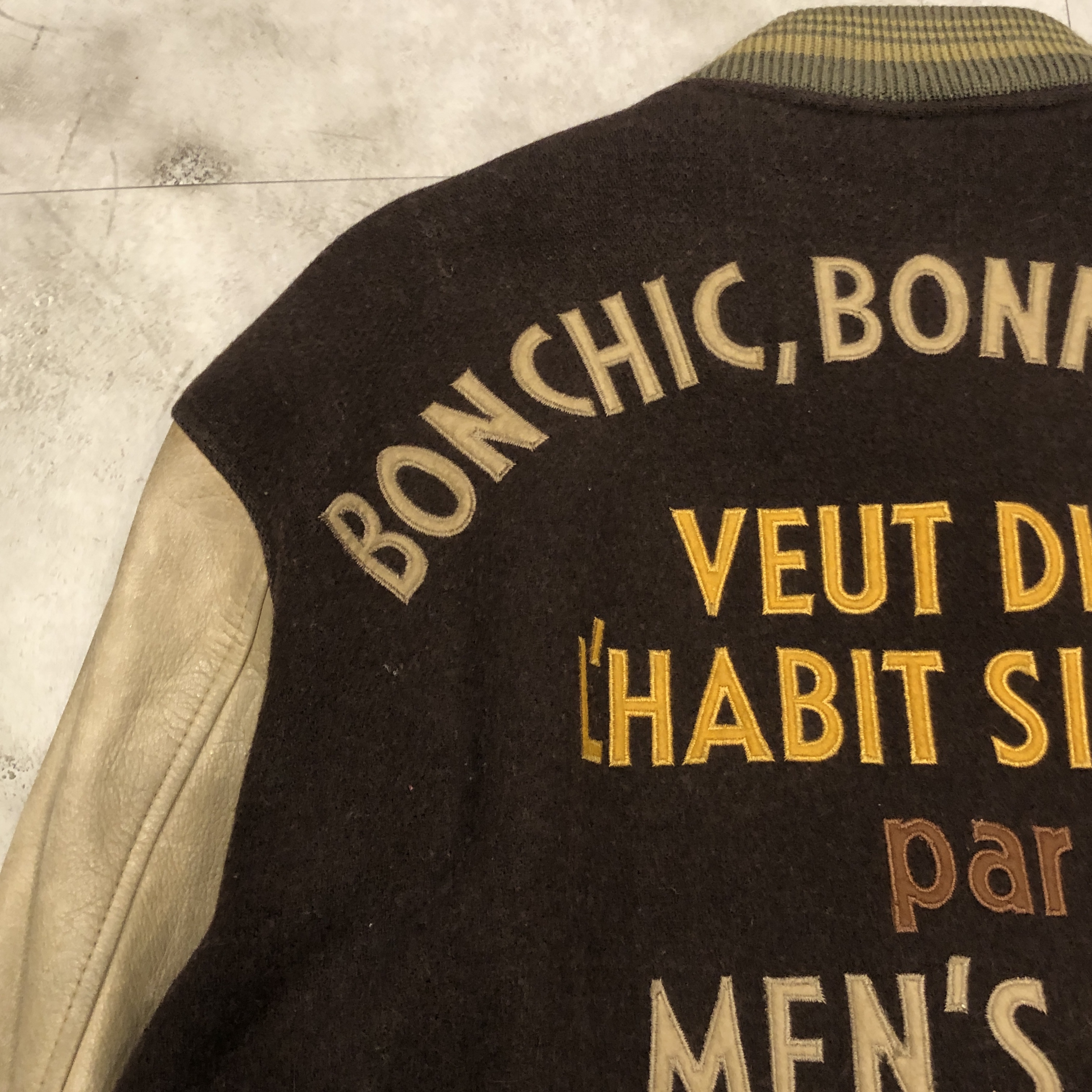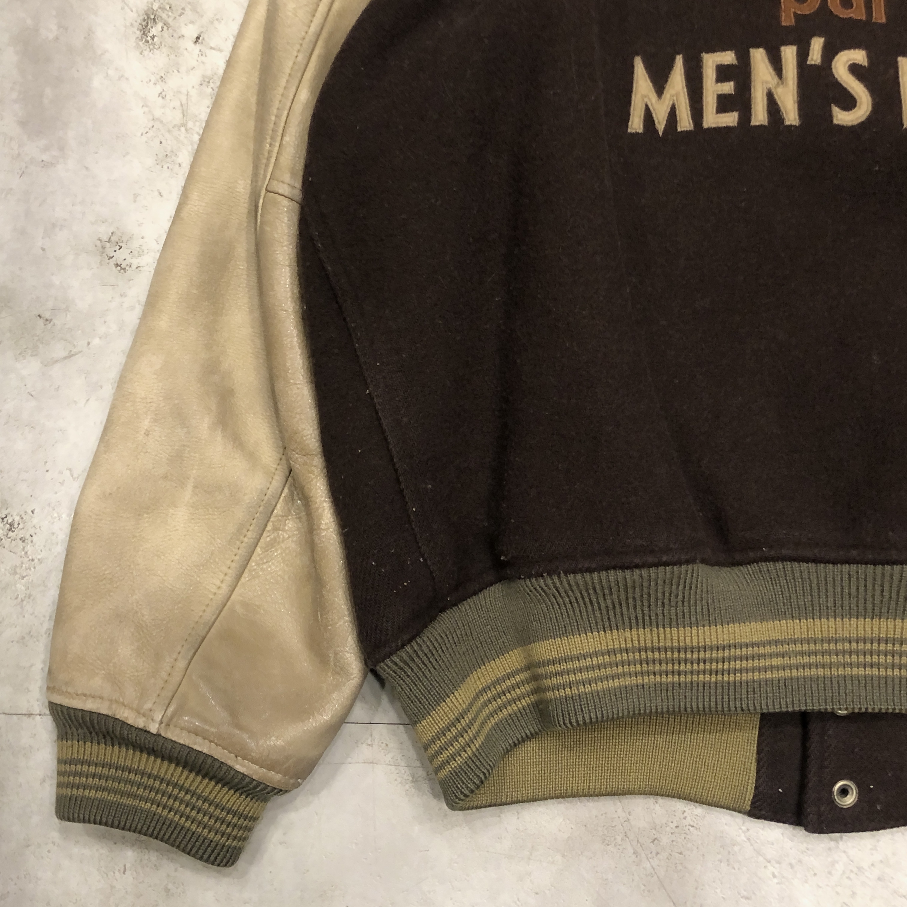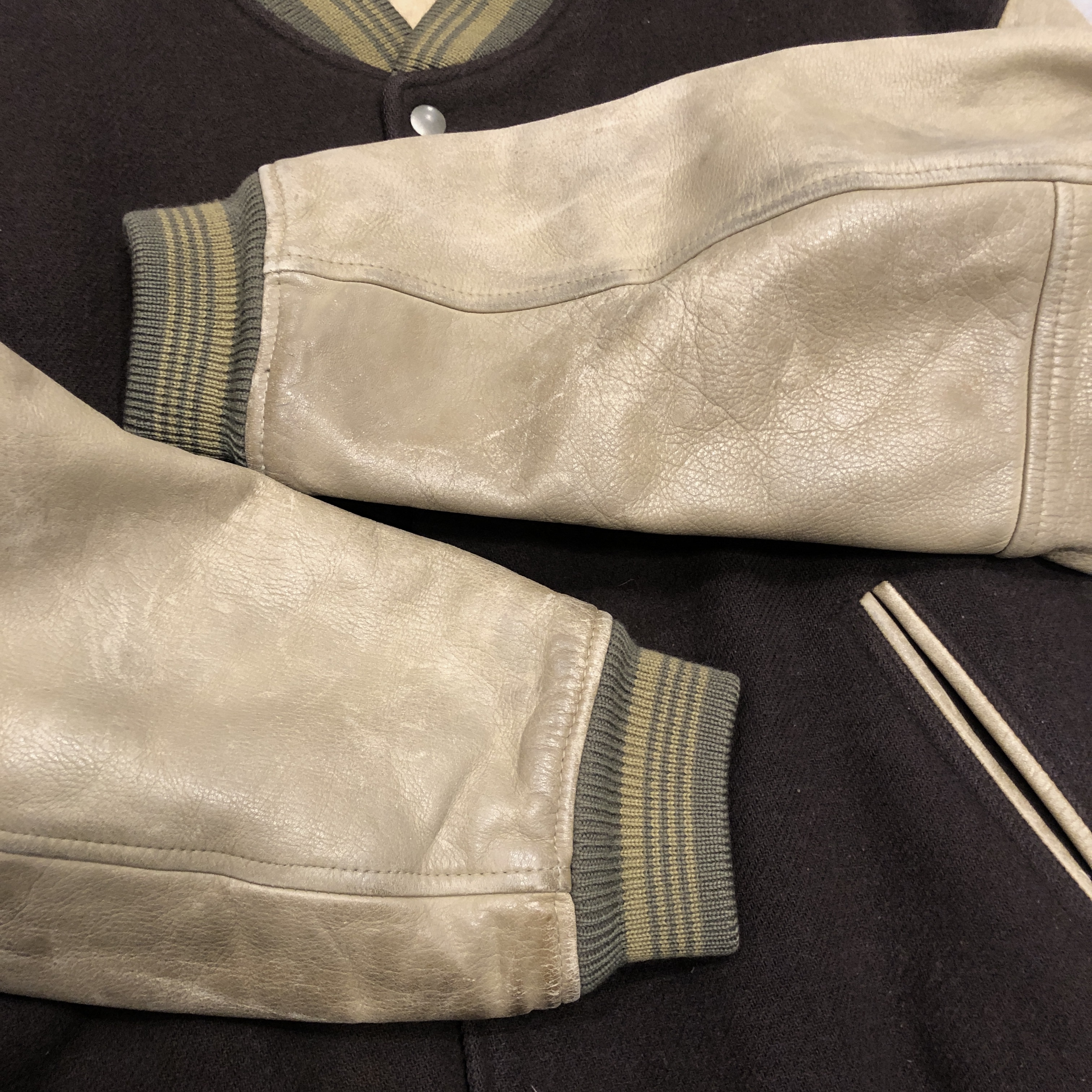 - 1980年代メンズビギ全盛期の空気をそのまま閉じ込めたような、迫力の“ブラウン×レザー”スタジアムジャケットが入荷しました。重厚なウールメルトンに、品のある艶を宿すブラウンの本革スリーブという、当時のビギらしい都会的エッジとクラシックなアメカジ要素が絶妙に同居した一着。胸にはデザインラベルを大胆に配し、バックにはスペイン語で刺繍された、80s〜90sのビギ黄金期を象徴するアイコニックな背面メッセージが圧倒的存在感を放っています。ライニングは光沢のあるキルティングサテンで防寒性も高く、袖リブ・裾リブはライン入りのオリジナル仕様。袖レザーの経年の馴染みなど、ヴィンテージとしての魅力も十分。今ではアーカイブ性の高い“ビギのスタジャン”、ストリートにもモードにも振れる万能な一本です。