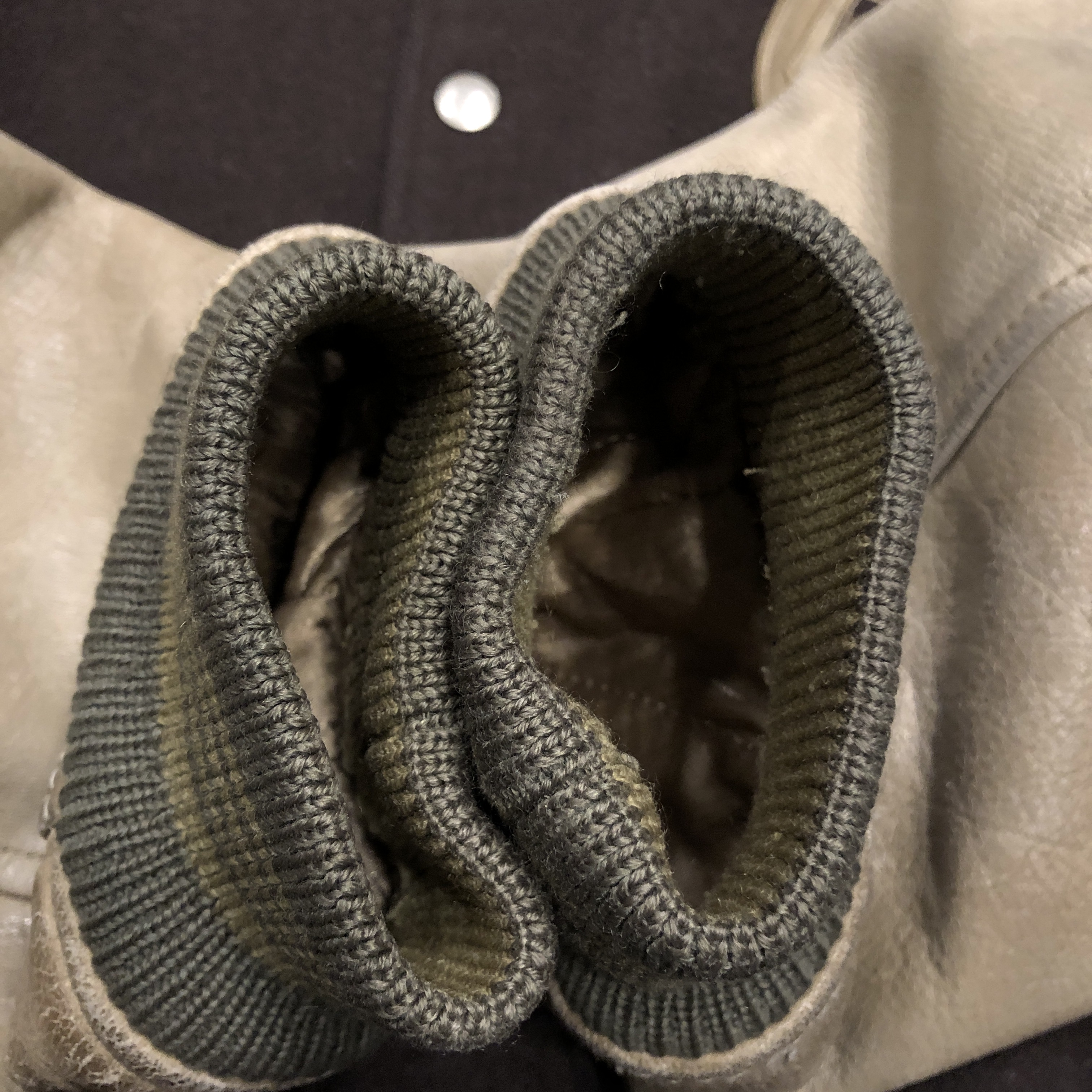 - 年代相応の着用感、ボタンのくすみ、レザー部分のスレや汚れ、毛玉等がそれぞれ画像の様にございますが、古着慣れされている方でしたら問題なくお使いいただける範囲です。