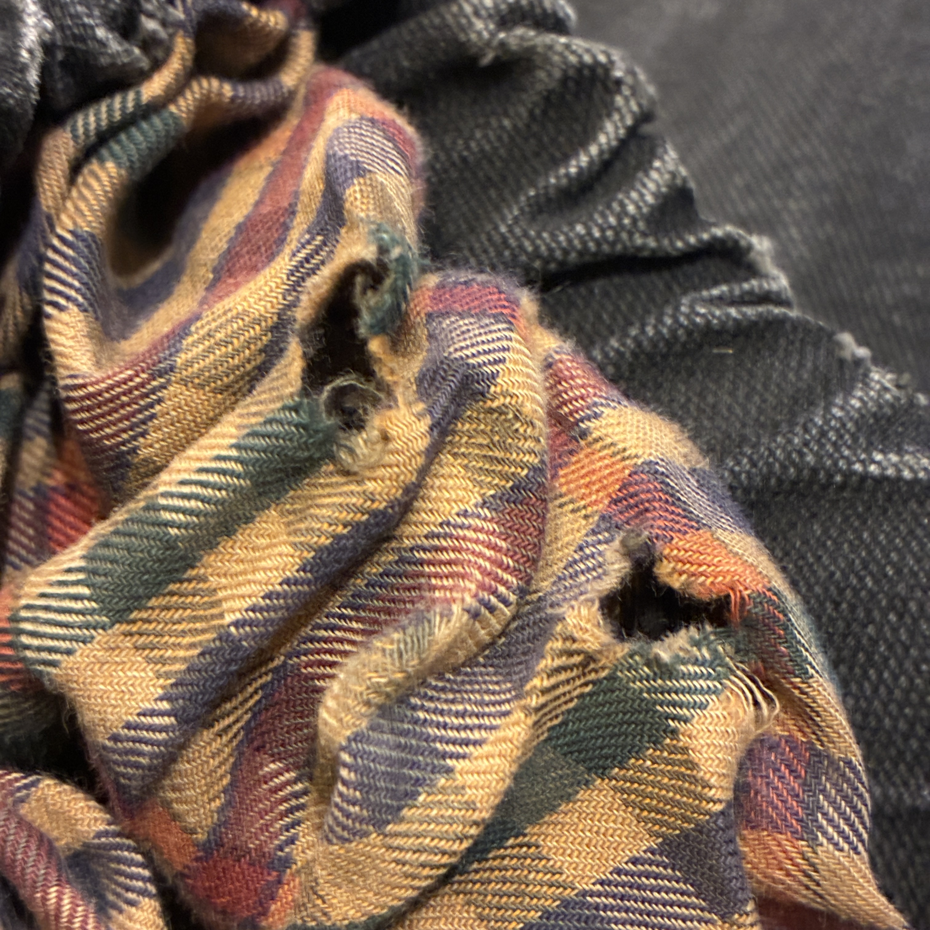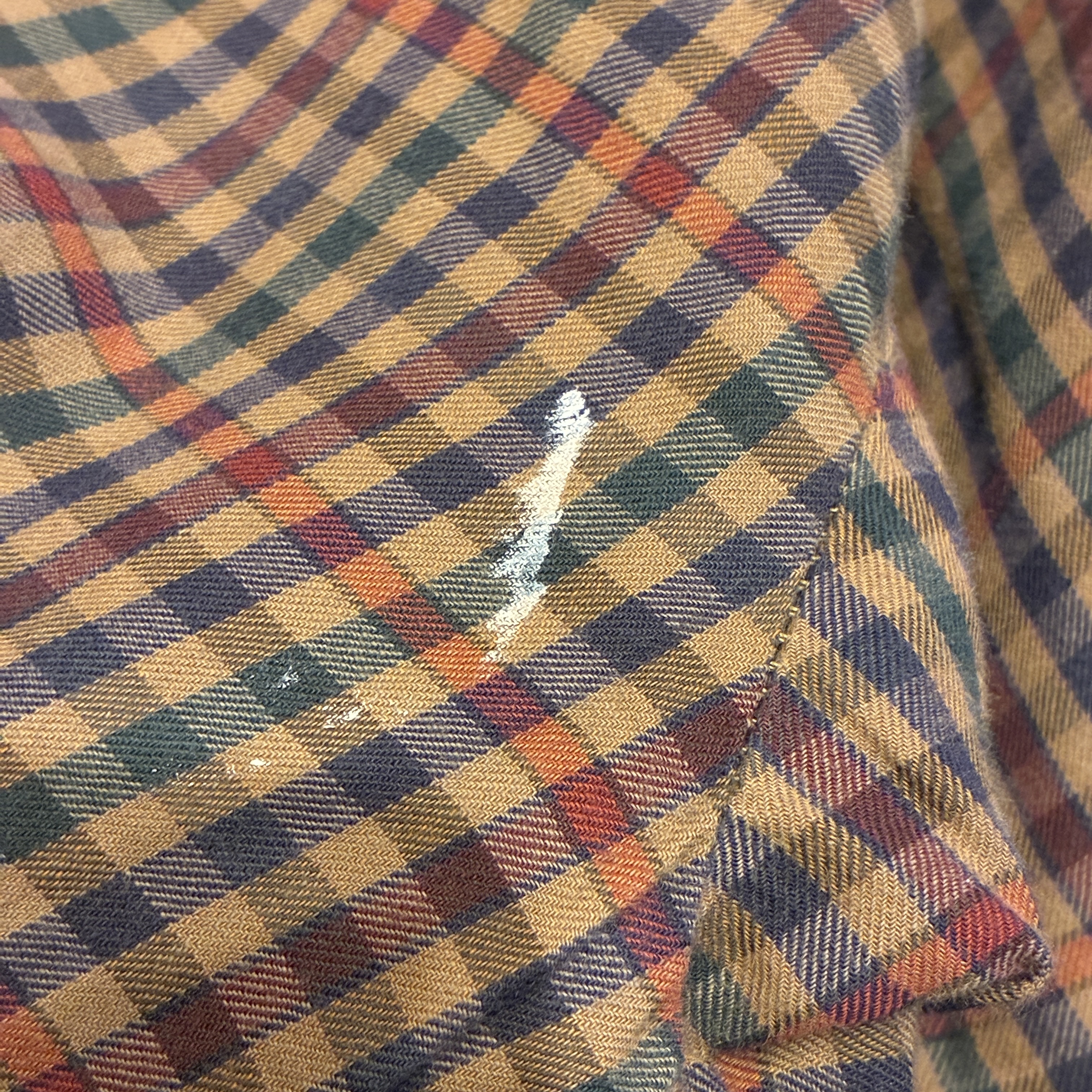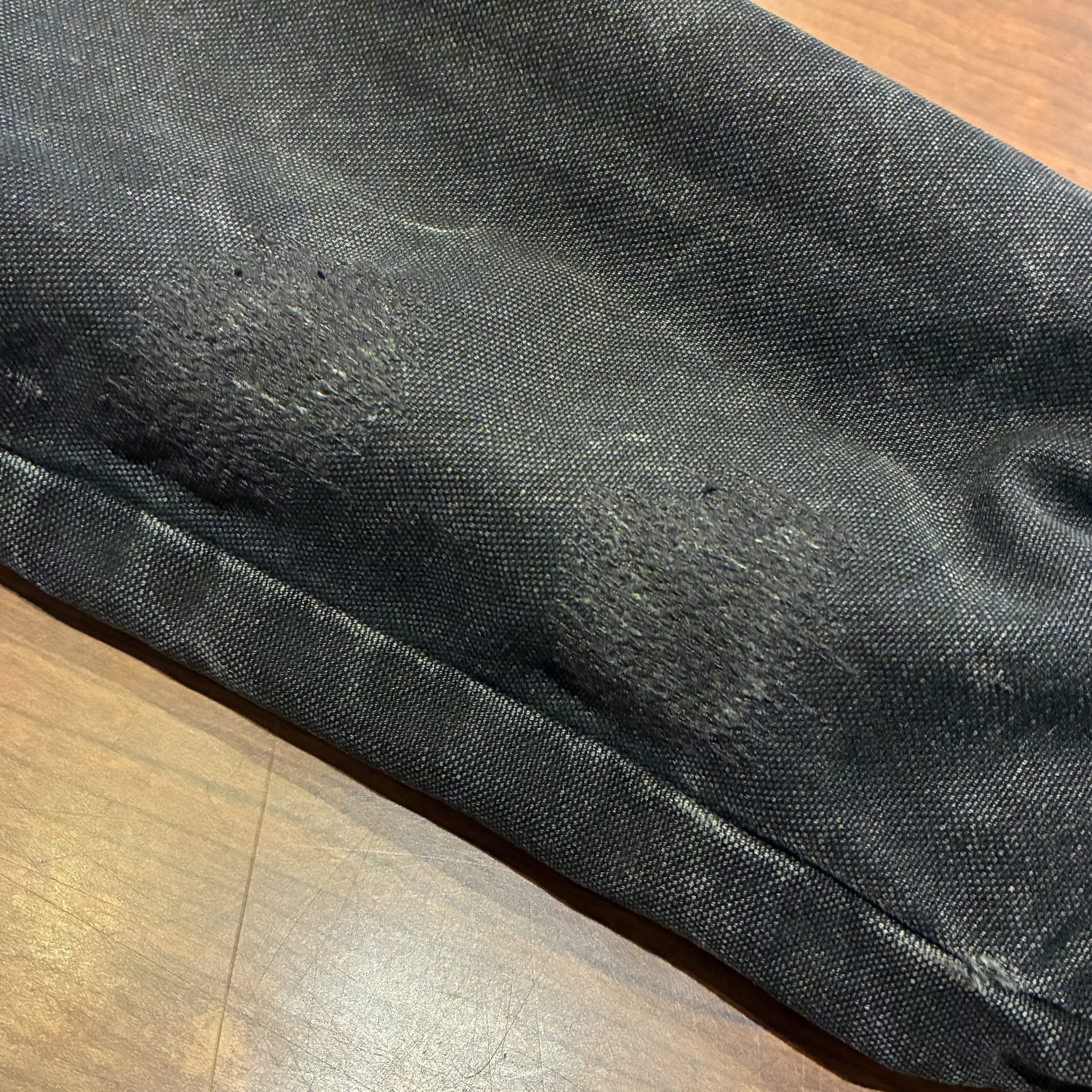 - 右袖に補修跡、袖口と裾に擦れやダメージ、全体にアタリと所々にペンキ汚れがございます。