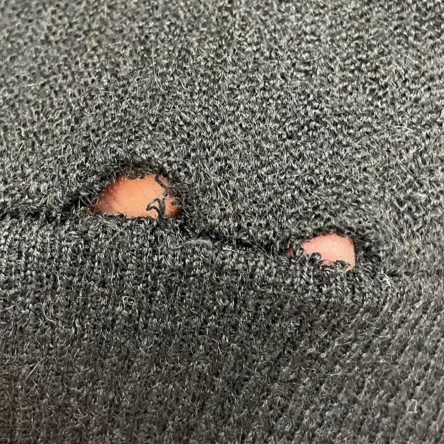 - 画像のように、袖、裾リブ切り替え部分等数か所に穴等のダメージがございます。
