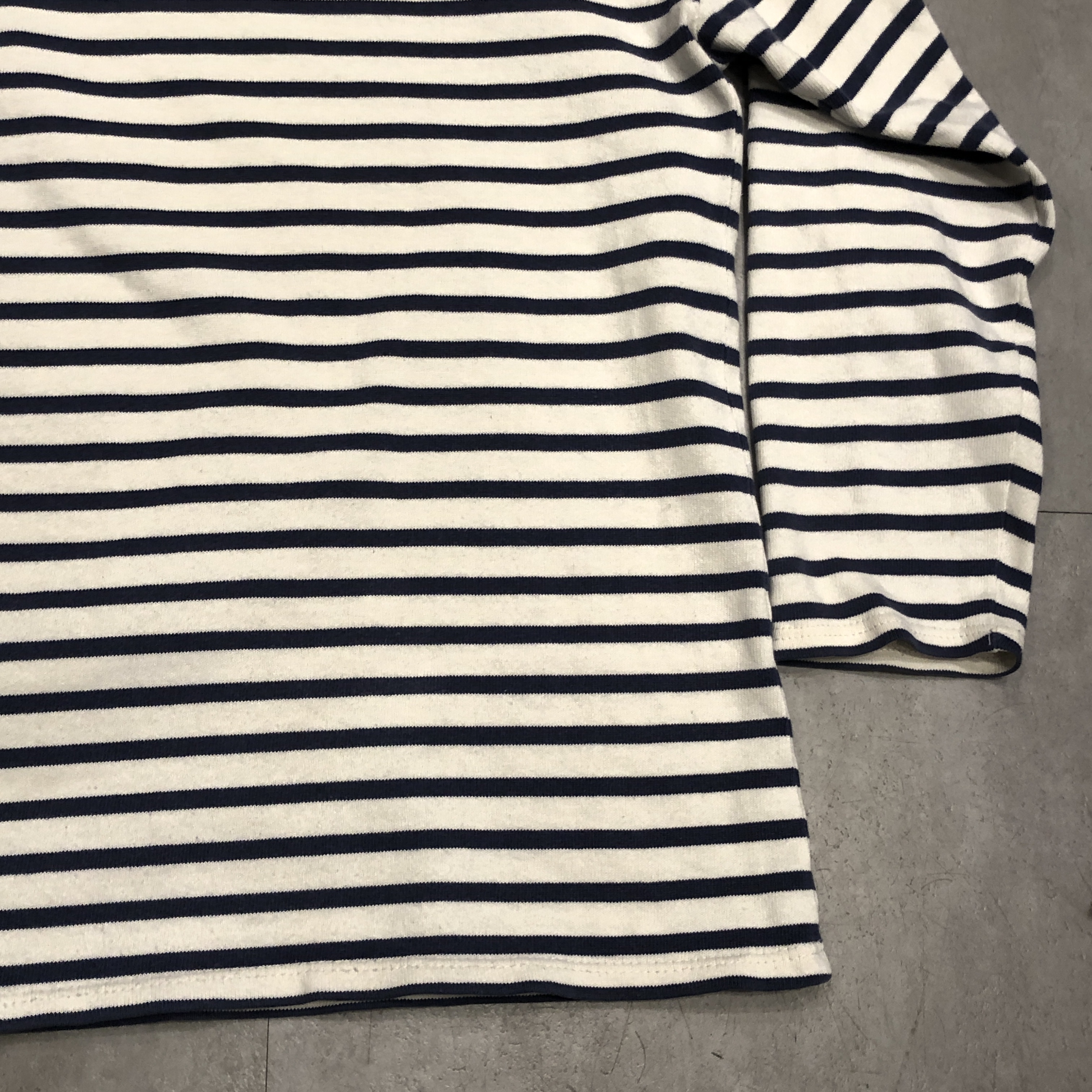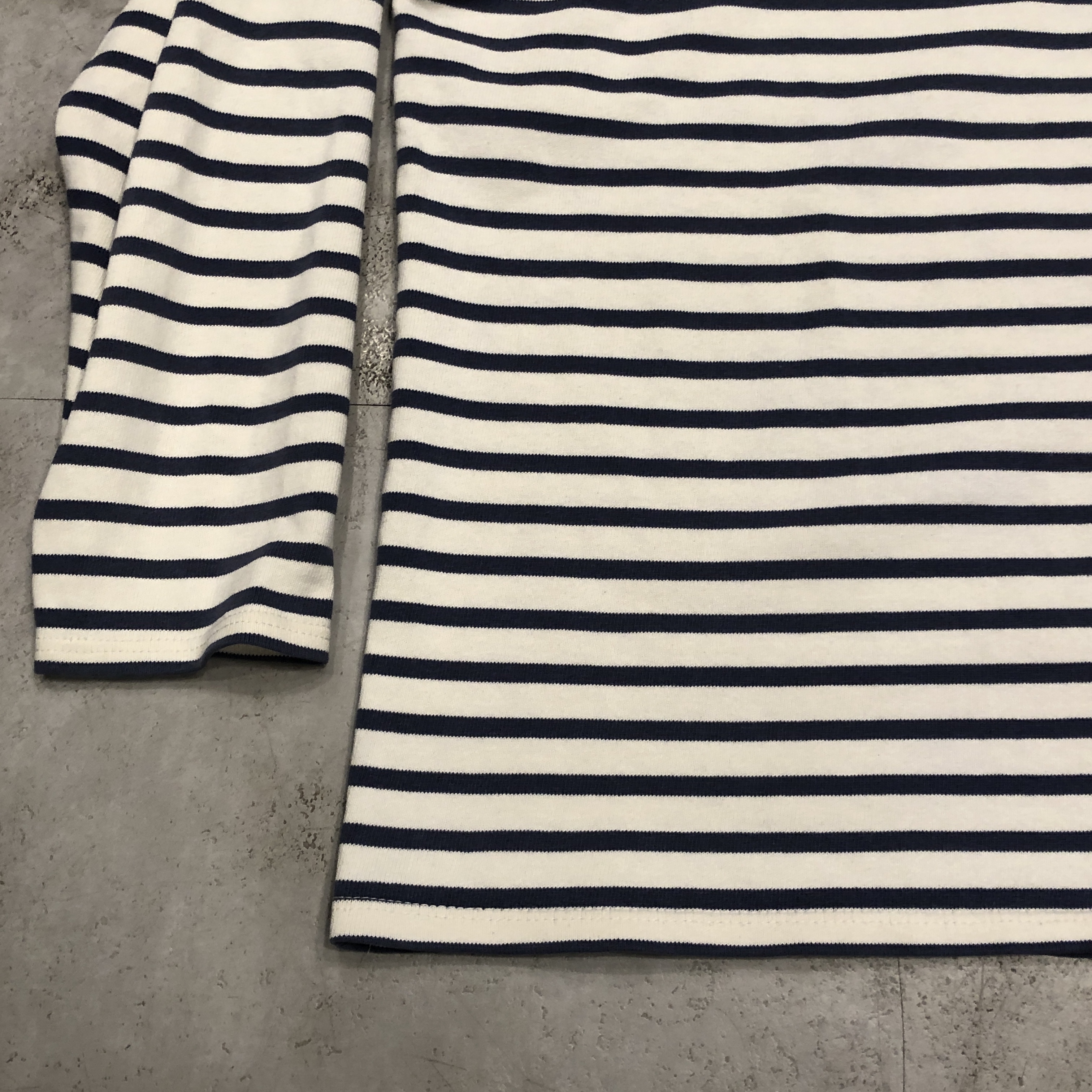 今回ご紹介するのは永遠の定番、落ち着いたネイビー/ ホワイトのボーダーカラー。ミリタリーやワークスタイルにも馴染み、カジュアルからシックまで幅広く対応します。素材は100%コットンの目の詰まった天竺生地。着始めはしっかりとした張り感があり、洗い込むことで徐々に柔らかく、肌馴染みの良い風合いへと育っていきます。