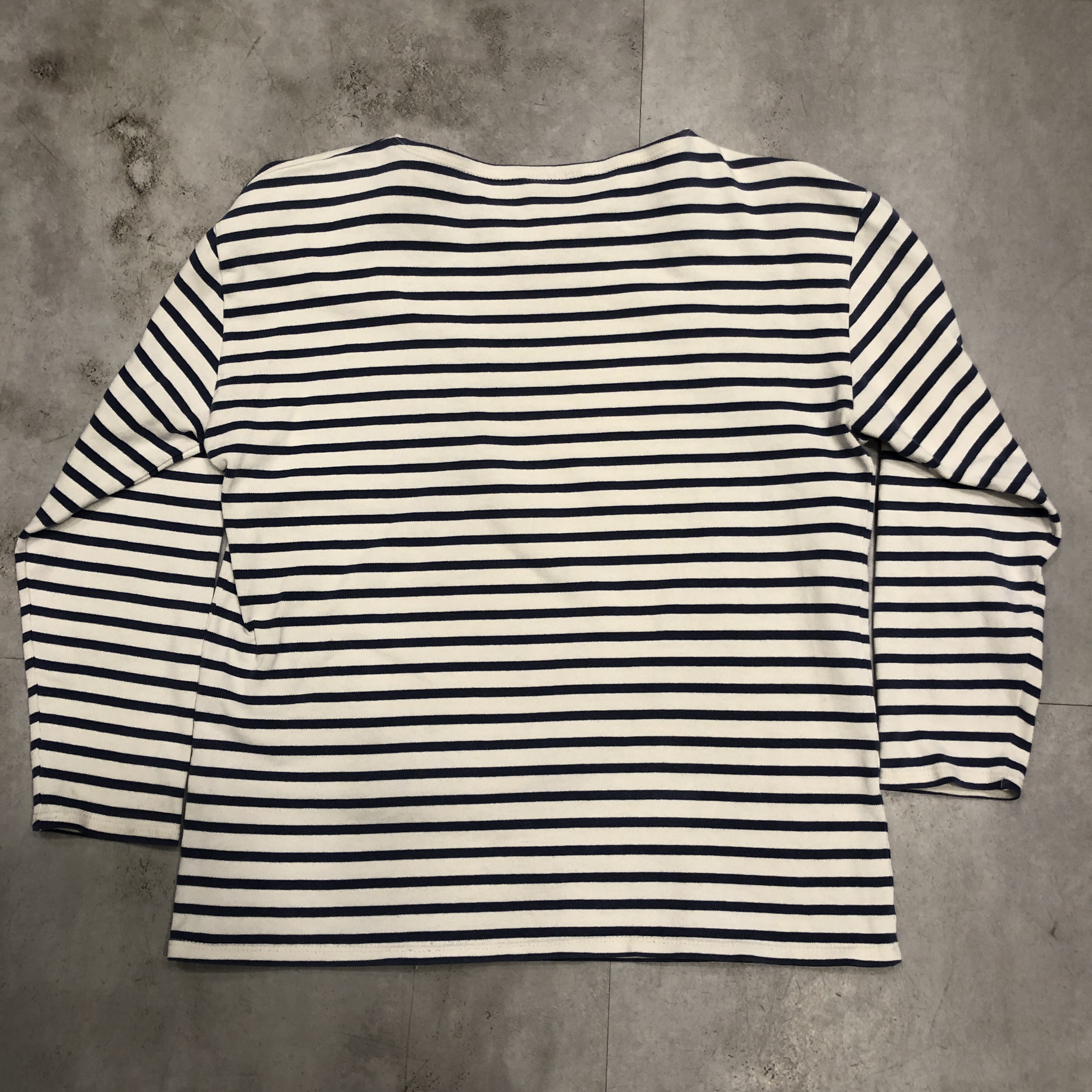クラシックなボートネックと肩線の落ちたストレートなパターンは、重ね着にも最適。袖口にはブランドロゴのネームパッチを控えめに配置。製造はもちろんフランス自社工場で行われ、サイズはフランス表記6(国際サイズL)で、男女問わずゆとりあるシルエットを楽しめます。