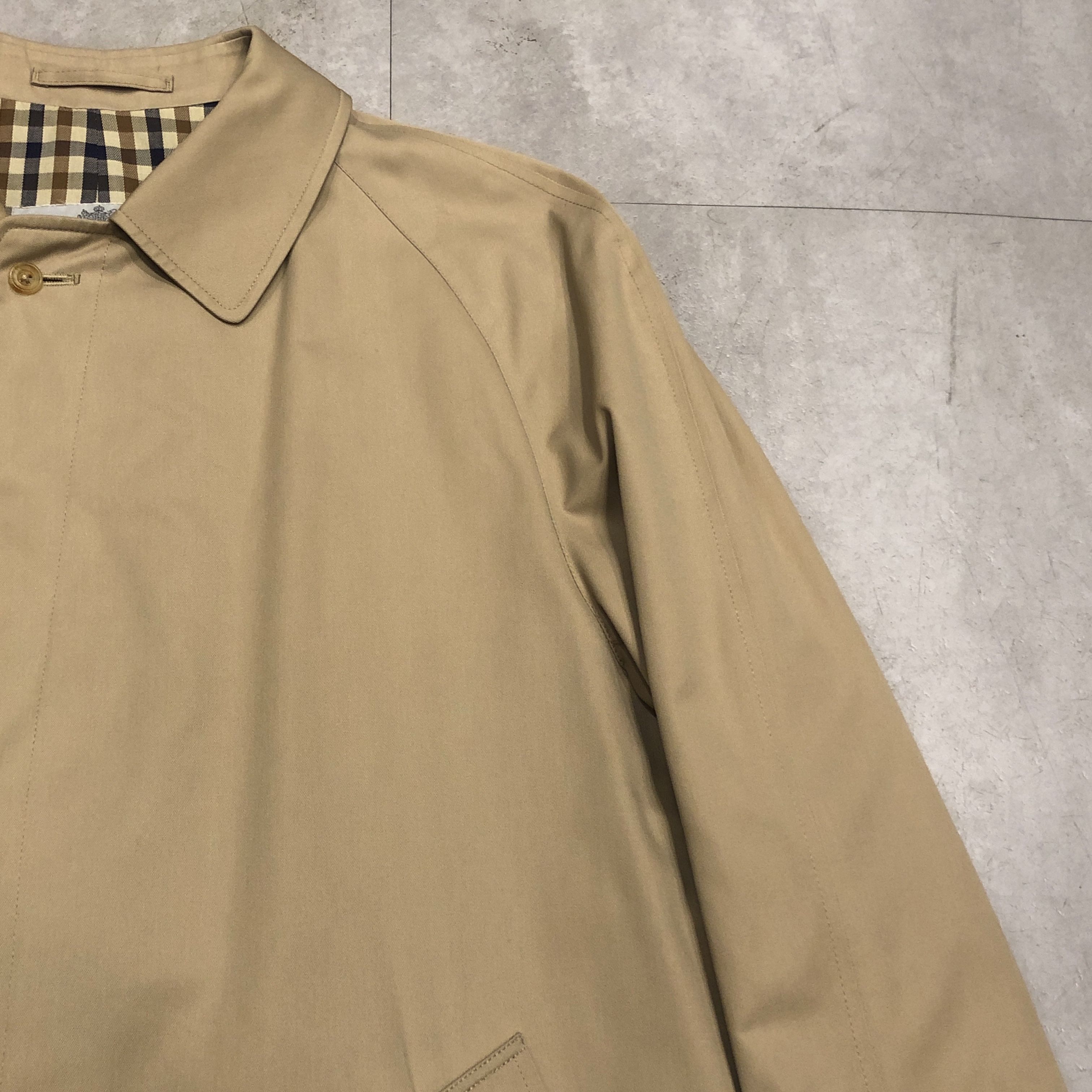 - 英国クラシックの真骨頂。Aquascutumによる、バルマカーンコートのご紹介です。オーセンティックなラグランスリーブに、比翼仕立てのミニマルな面構え、まさに往年のブリティッシュ・テーラリングが息づいています。たっぷりとしたAラインに流れるようなドレープが美しく、まとうだけで空気感が変わるような一着です。まさに「育てる」ために手にしたい逸品。