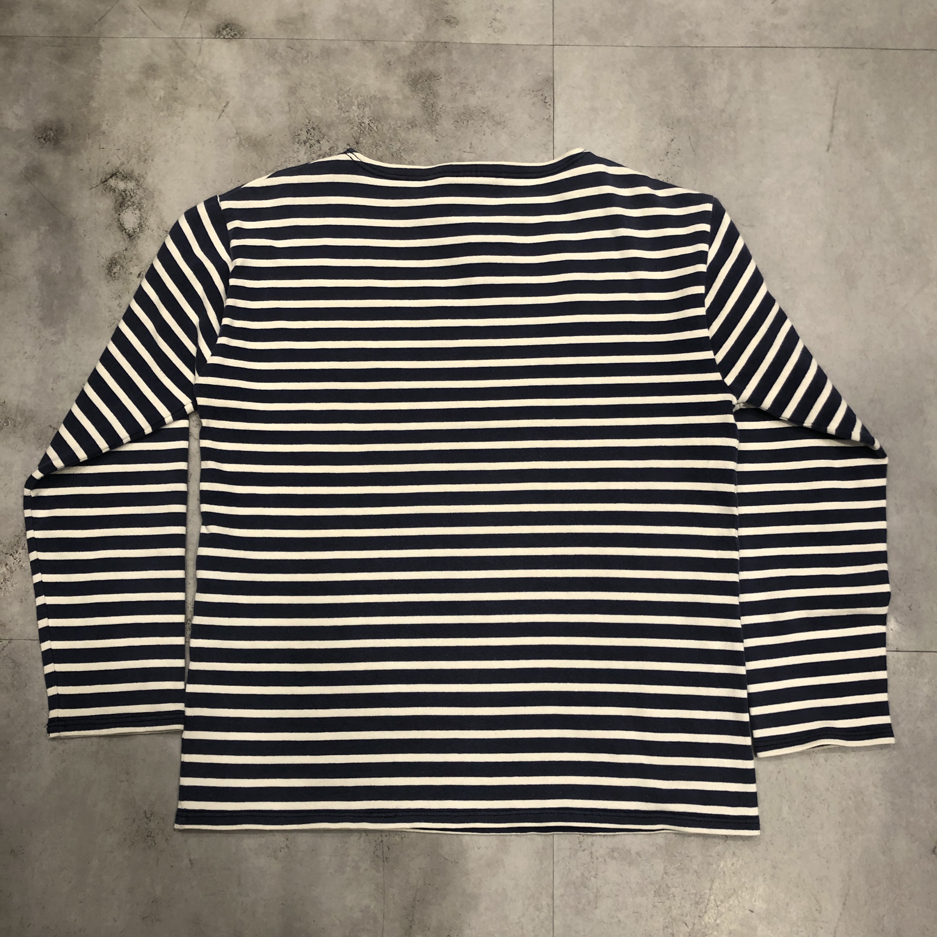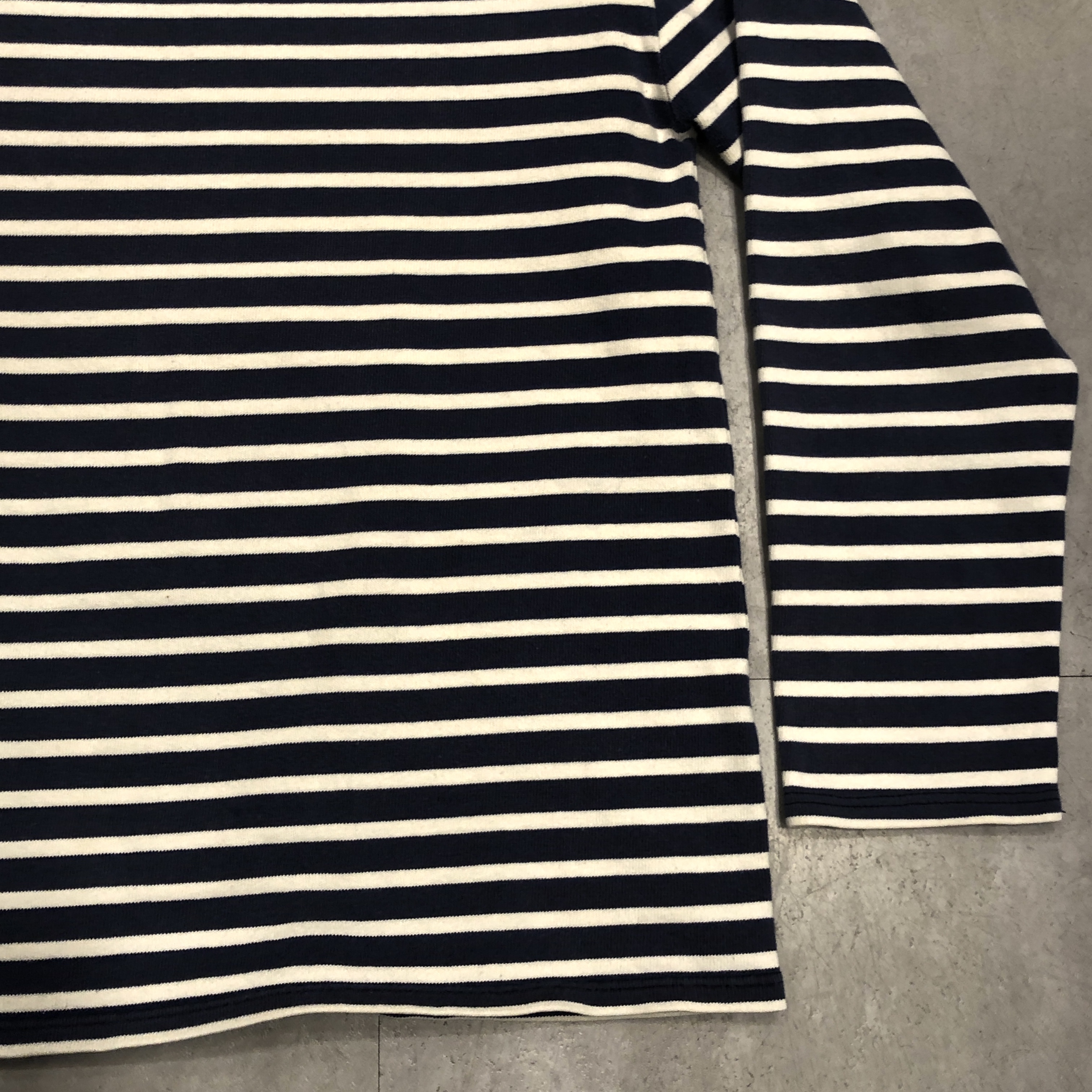 クラシックなボートネックと肩線の落ちたストレートなパターンは、重ね着にも最適。袖口にはブランドロゴのネームパッチを控えめに配置。製造はもちろんフランス自社工場で行われ、サイズはフランス表記5(国際サイズML)で、男女問わずゆとりあるシルエットを楽しめます。