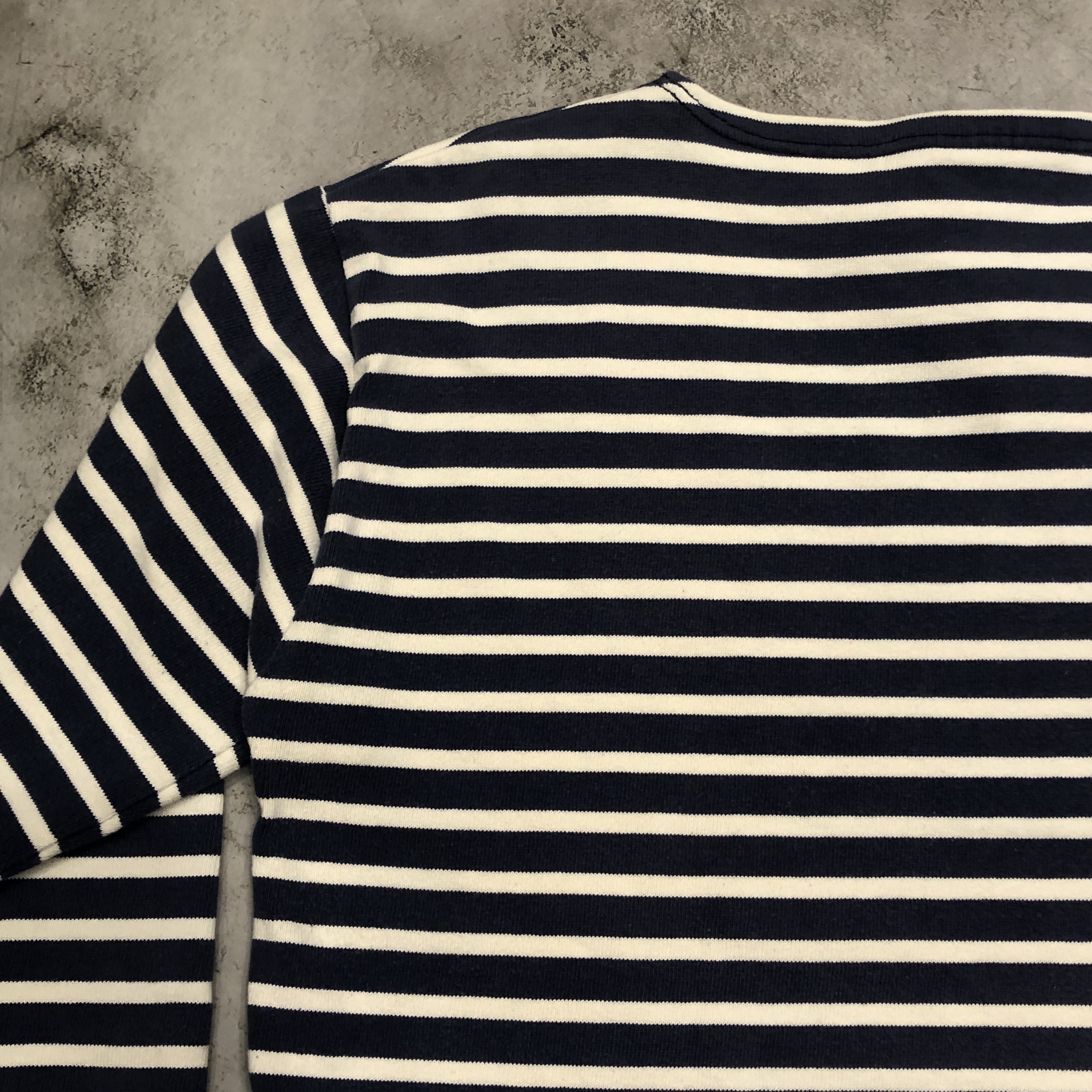 今回ご紹介するのは永遠の定番、落ち着いたネイビー/ ホワイトのボーダーカラー。ミリタリーやワークスタイルにも馴染み、カジュアルからシックまで幅広く対応します。素材は100%コットンの目の詰まった天竺生地。着始めはしっかりとした張り感があり、洗い込むことで徐々に柔らかく、肌馴染みの良い風合いへと育っていきます。