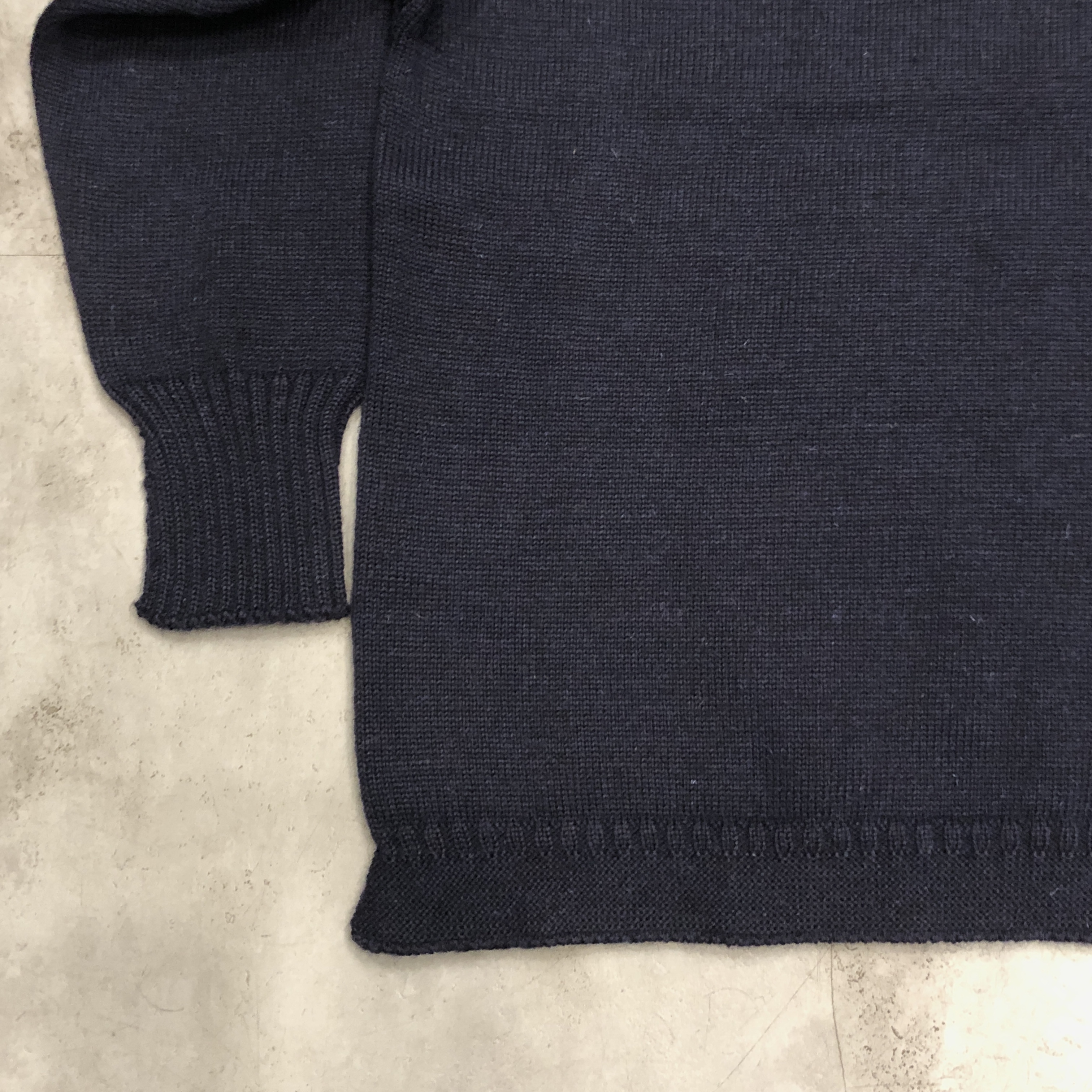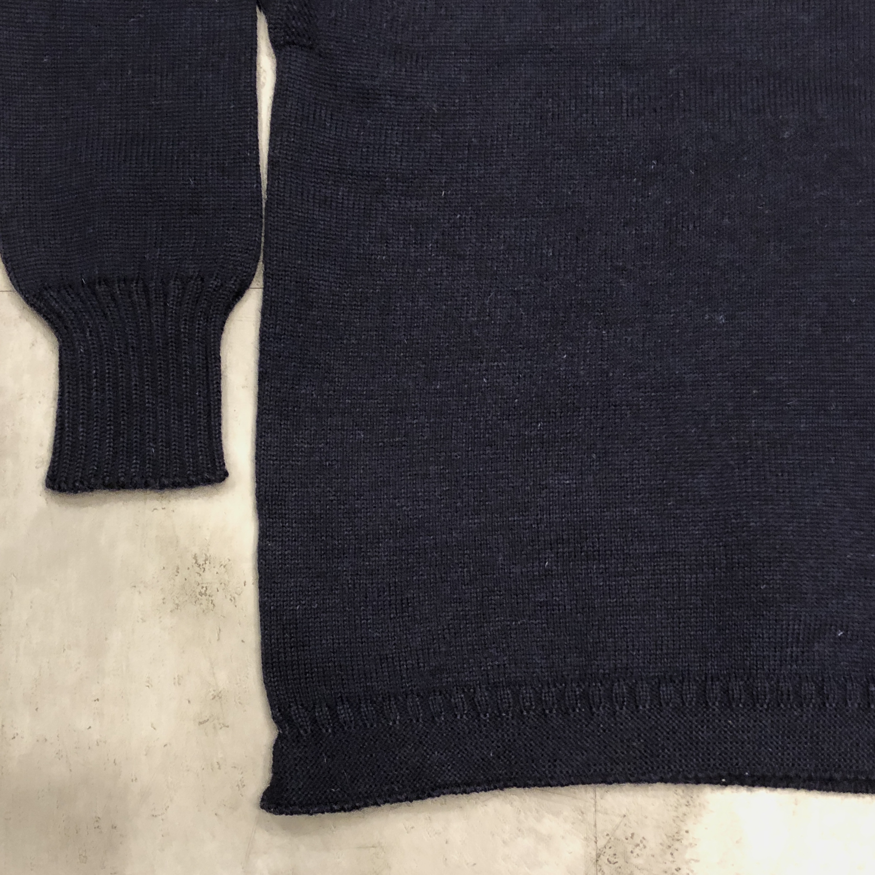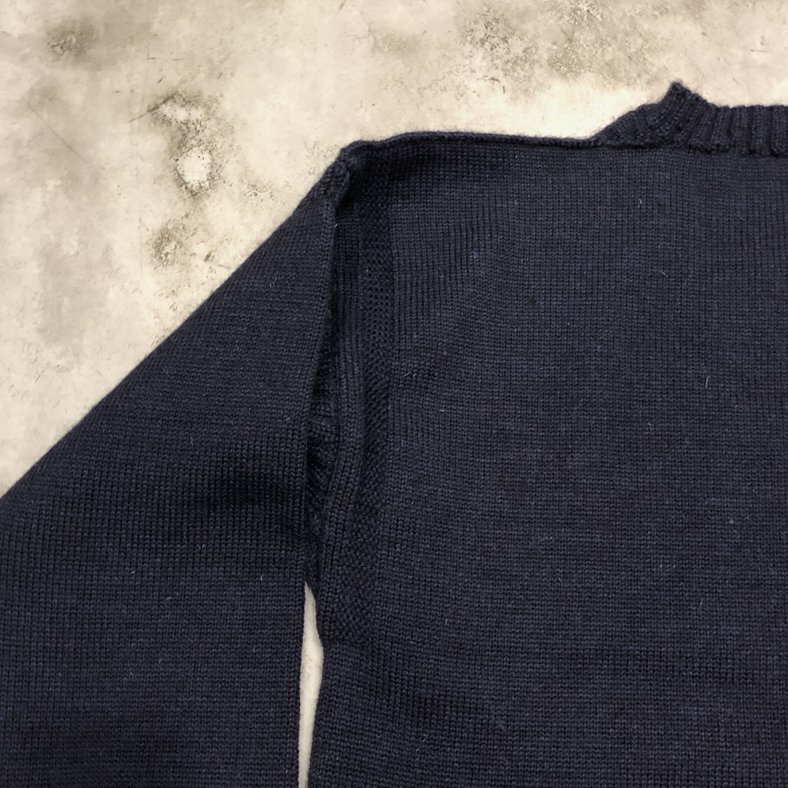 こちらの個体──ネイビーカラーのガンジーは“通好みのカラー”。ファッションではなく生活の道具として生まれたニットが、結果的にモードにすら見えてしまうという、ガンジーならではの魅力が際立ちます。