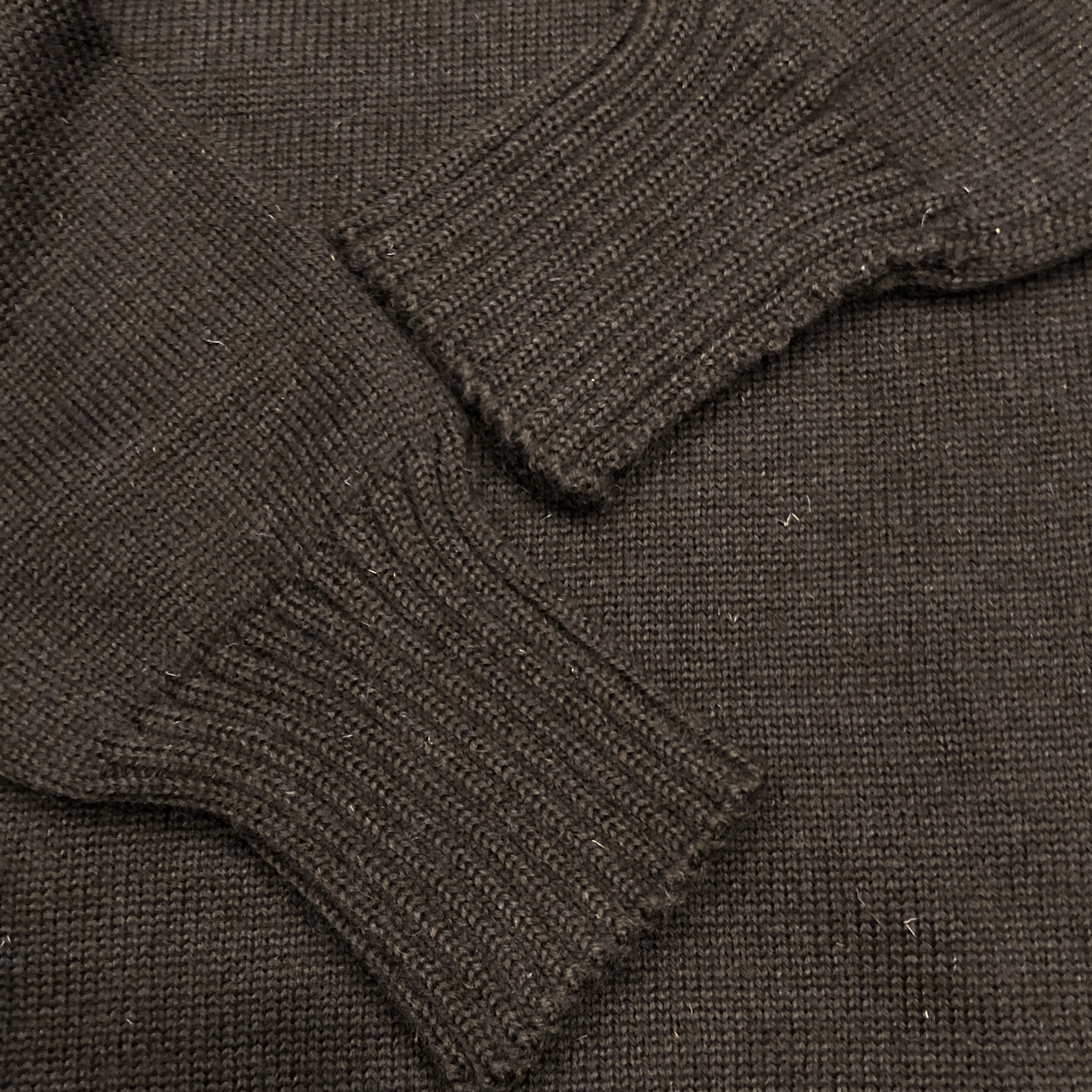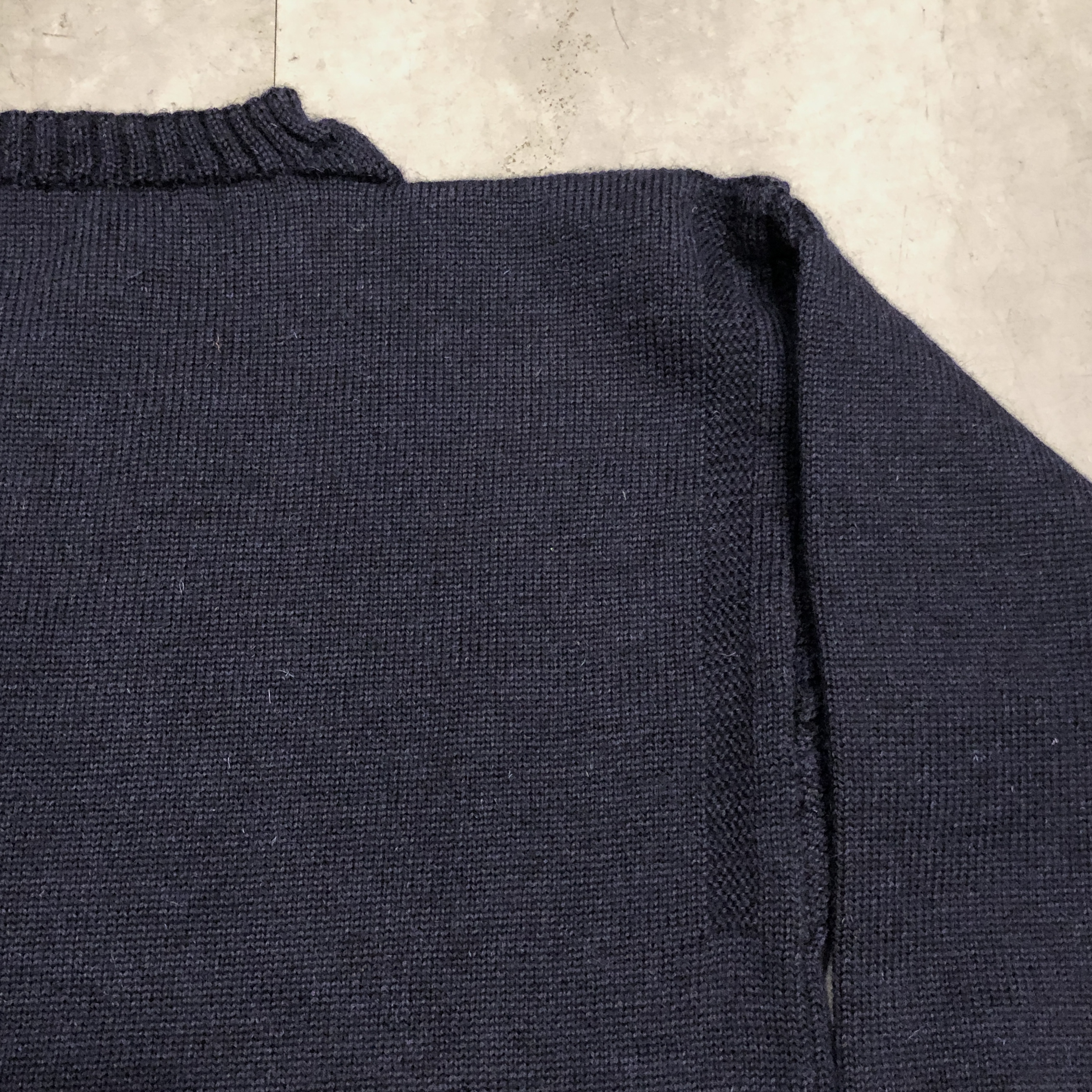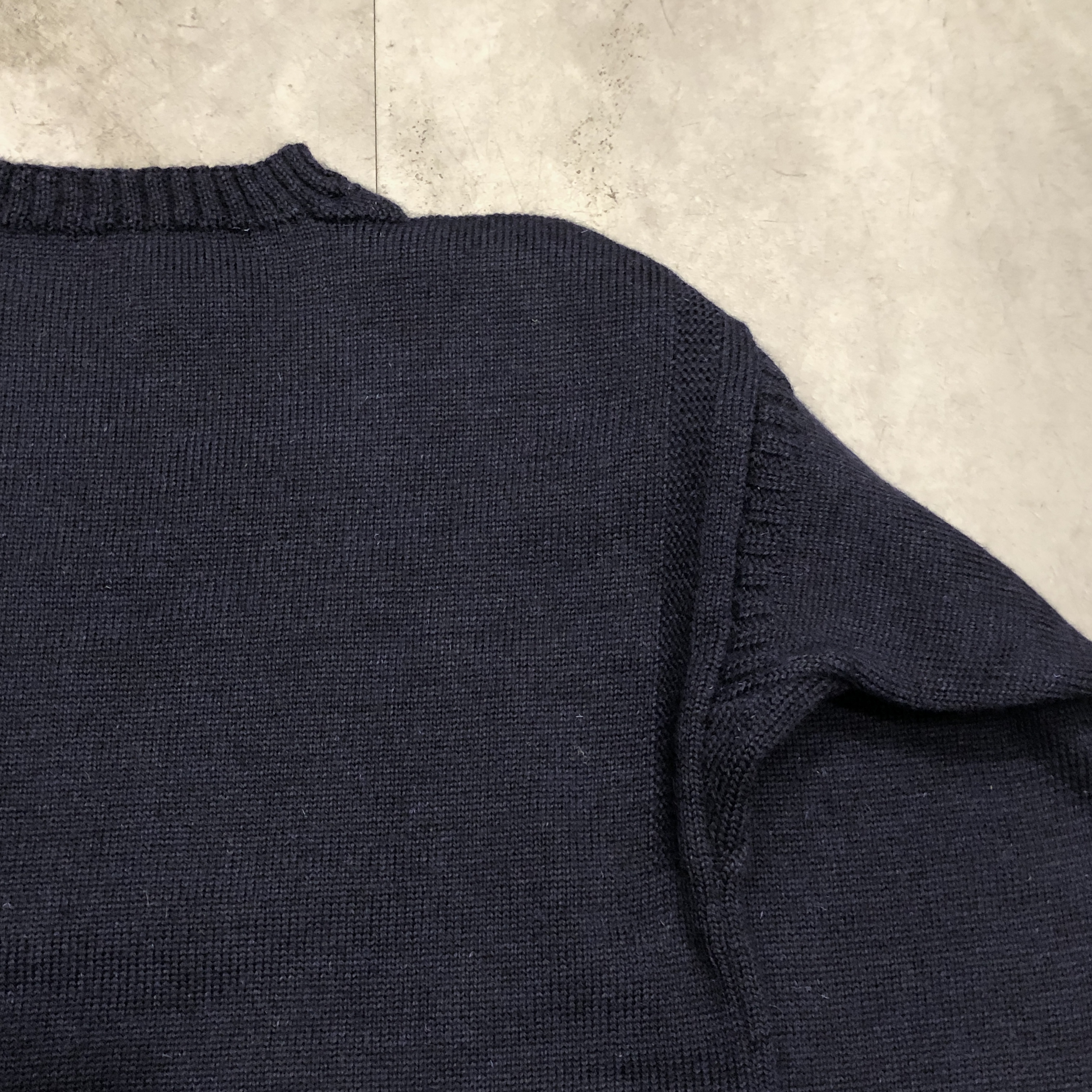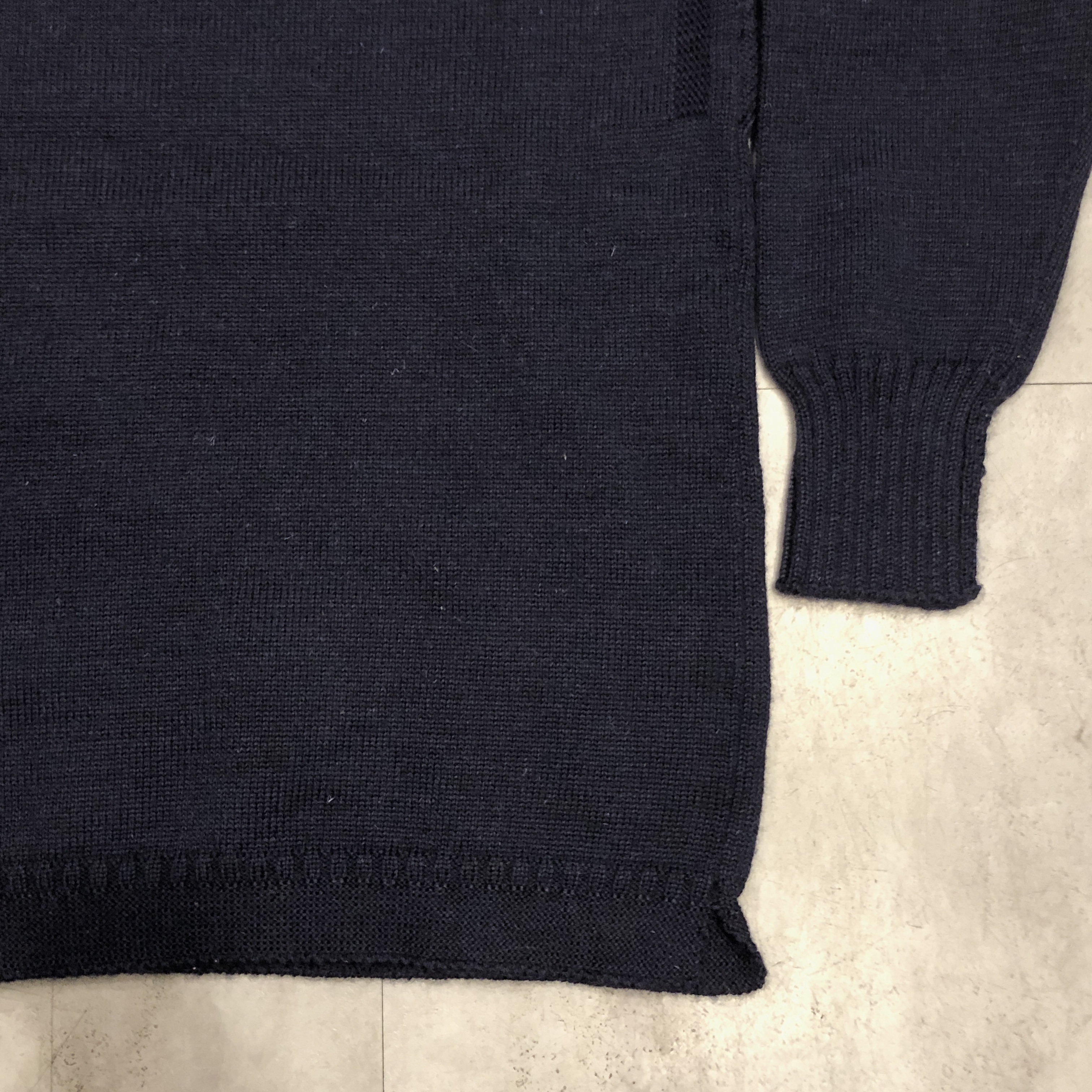 こちらの個体──ネイビーカラーのガンジーは“通好みのカラー”。ファッションではなく生活の道具として生まれたニットが、結果的にモードにすら見えてしまうという、ガンジーならではの魅力が際立ちます。