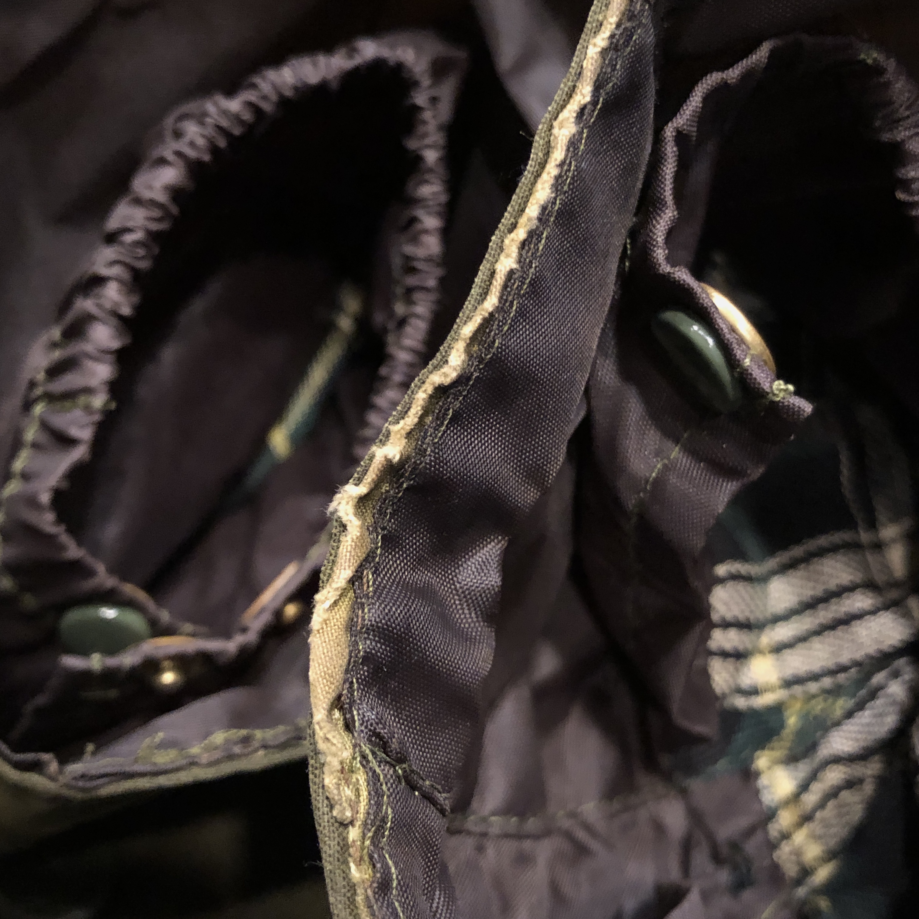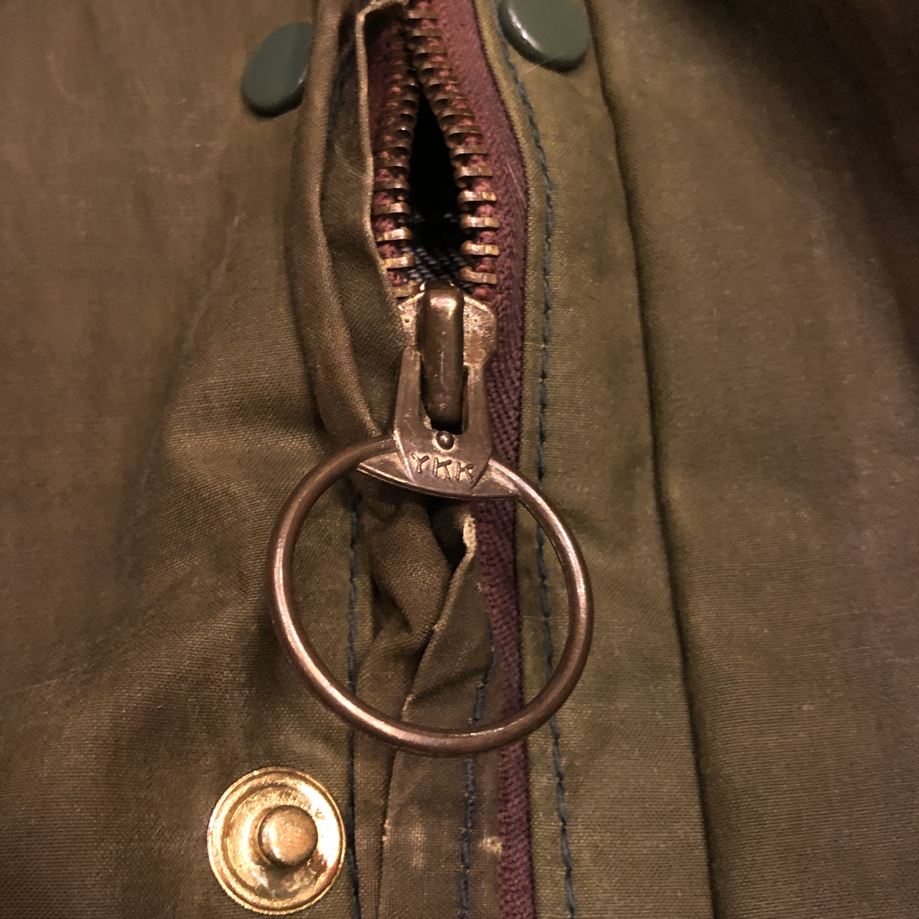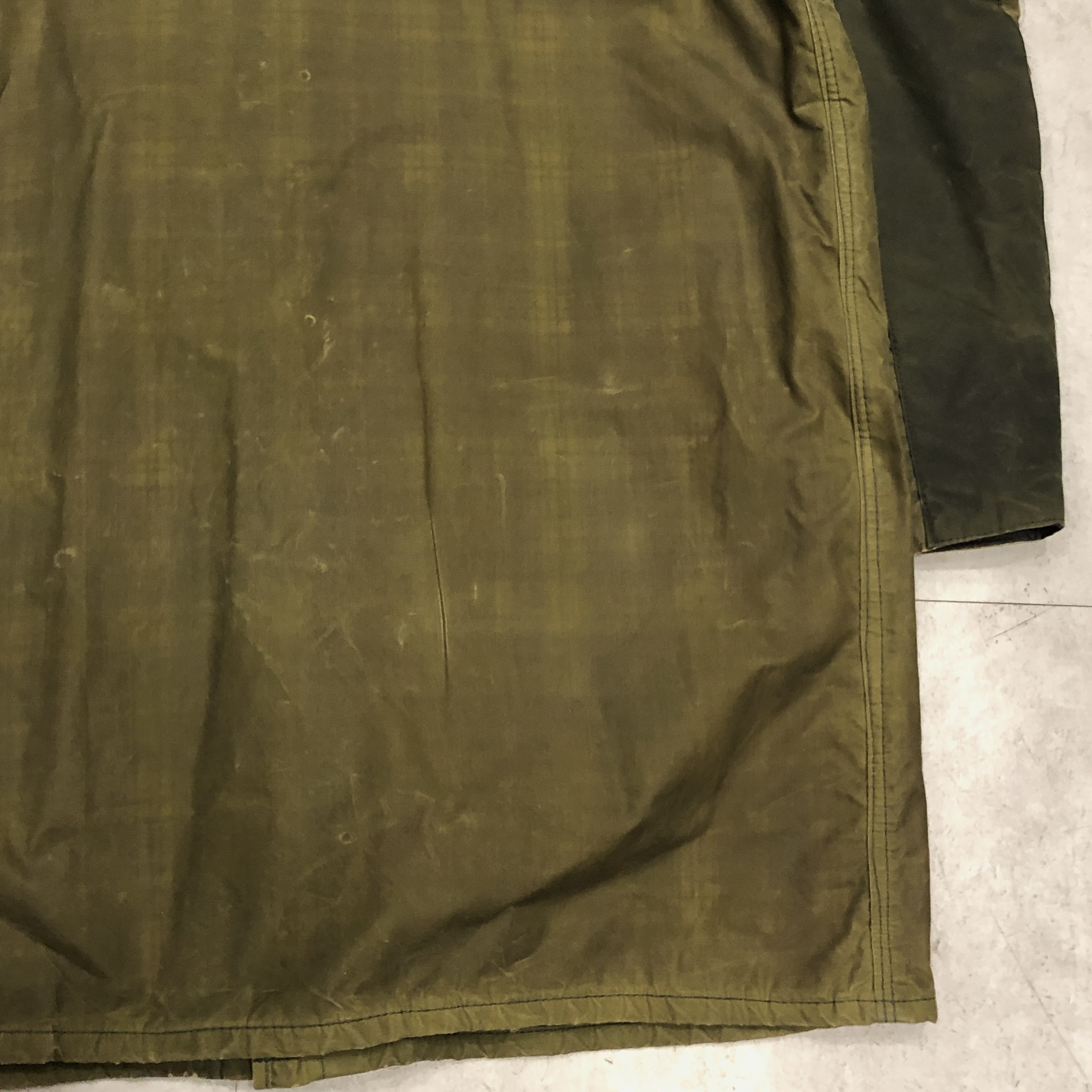 - 年代相応の着用感、生地特有のスレ、アタリ、1箇所スナップボタン表面の剥がれ、両腕のリペア跡、袖口と裾部分、ポケット縁のダメージ等がそれぞれ画像の様にございますが、古着慣れされている方でしたら問題なくお使いいただける範囲です。