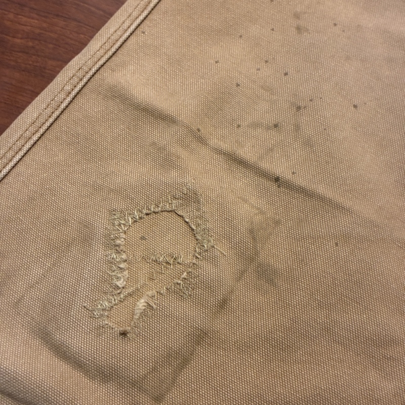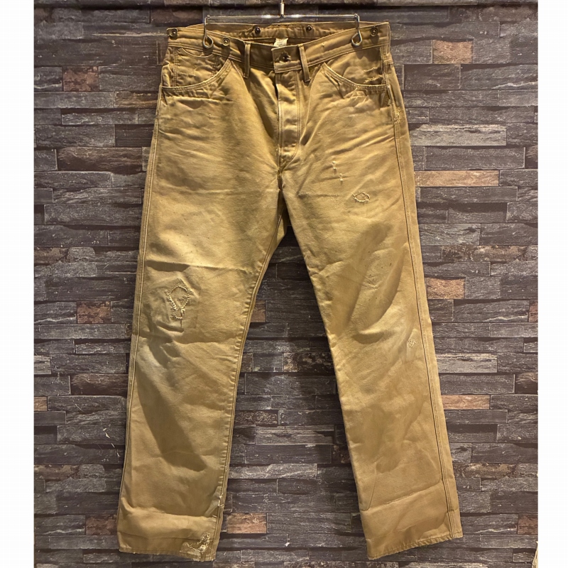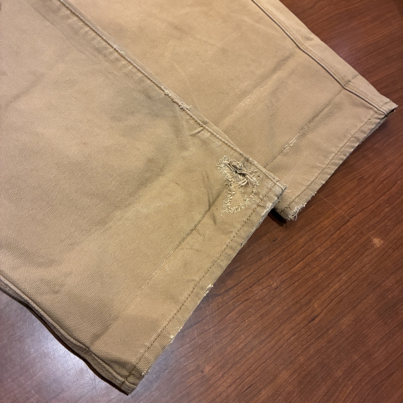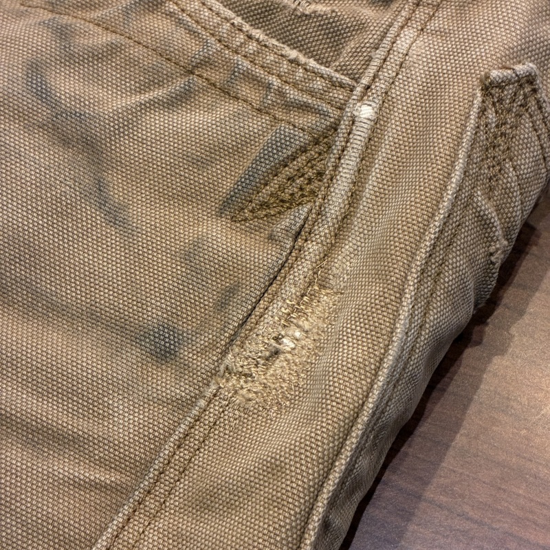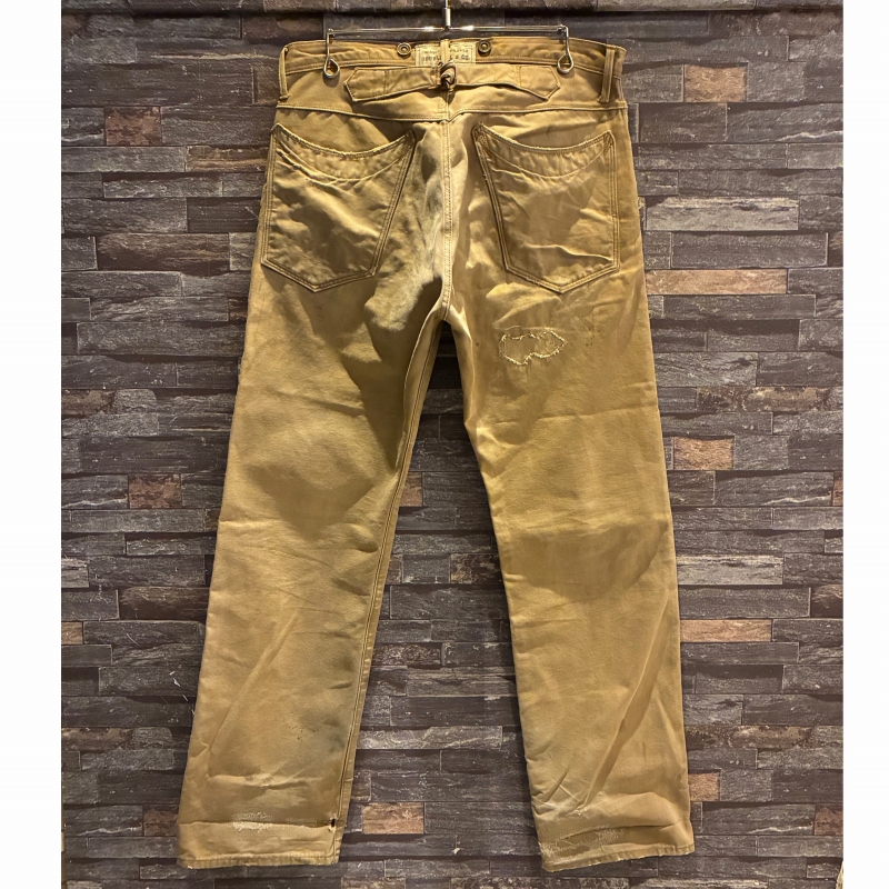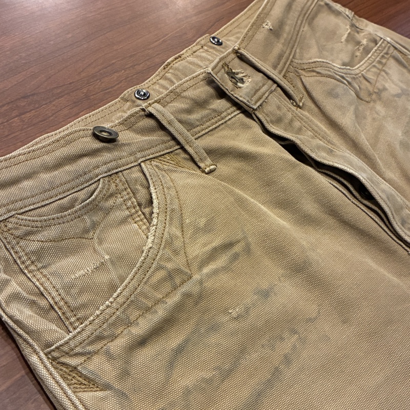左ポケット付近にタタキリペア跡(画像6枚目)や股部分や裾に着用によるダメージがございます。