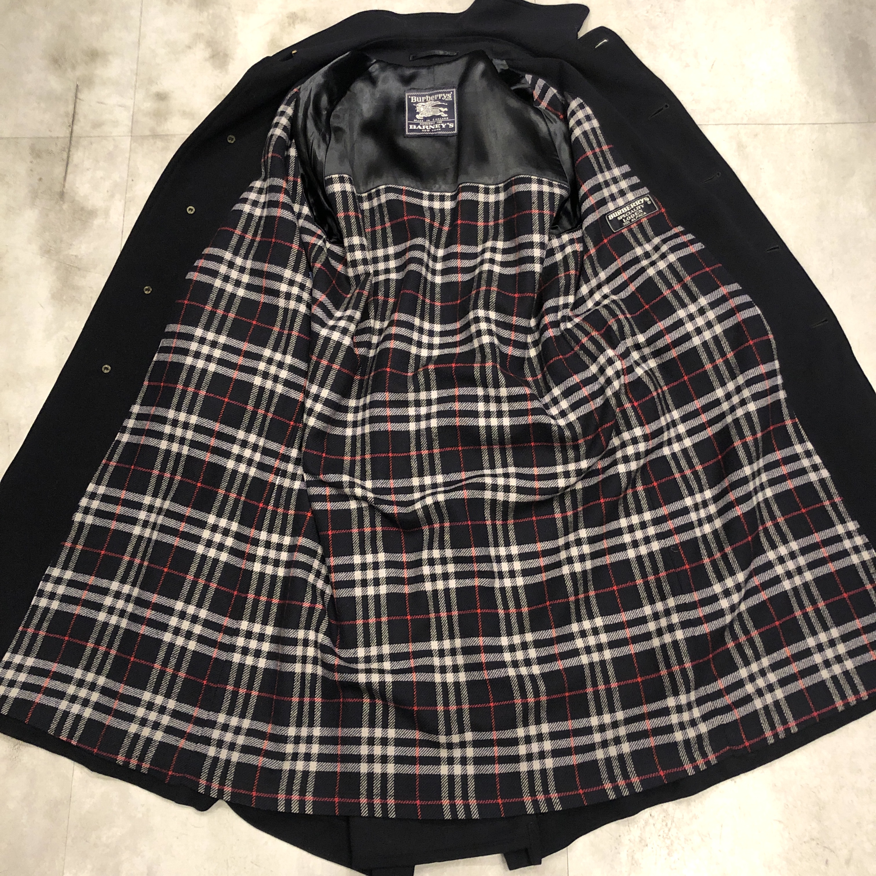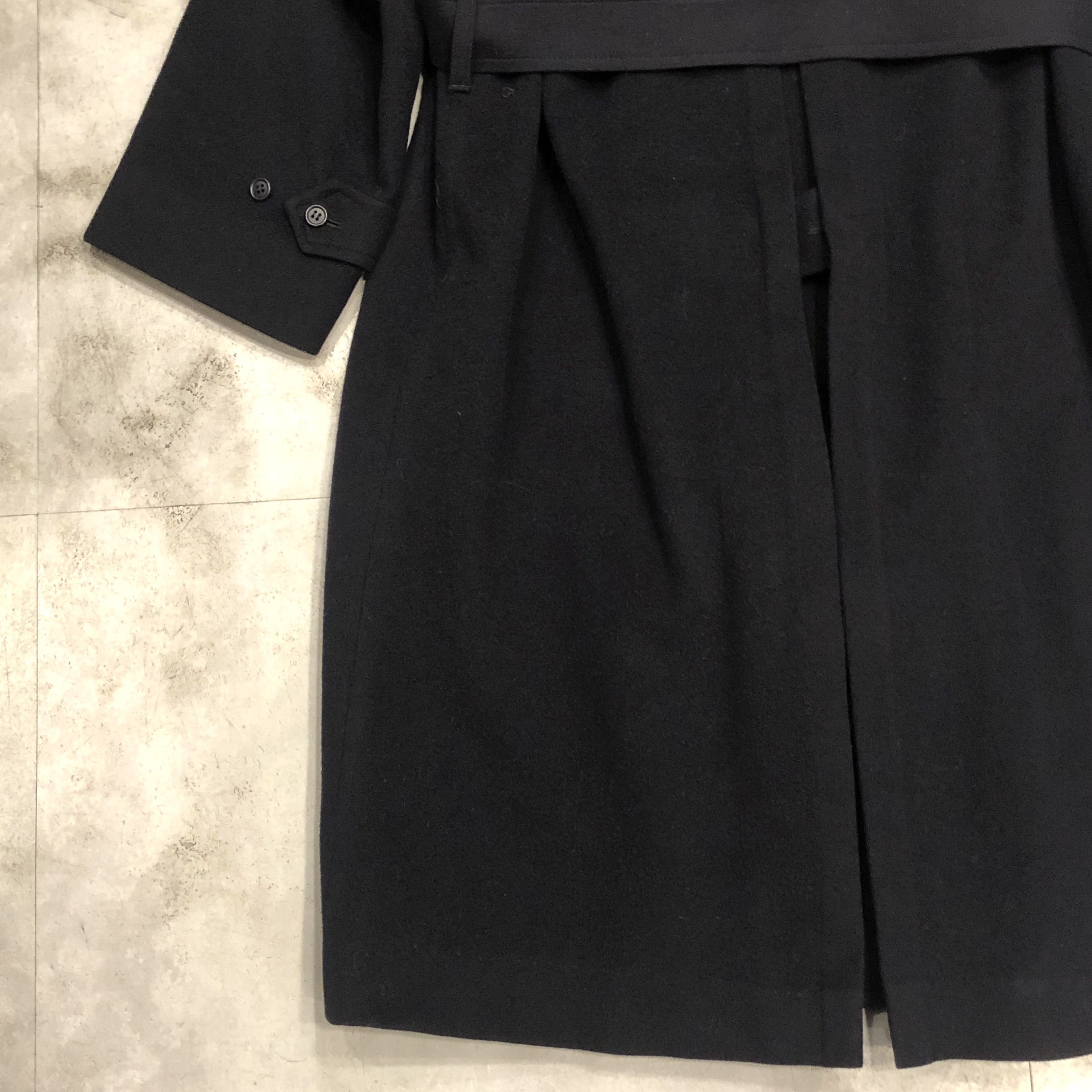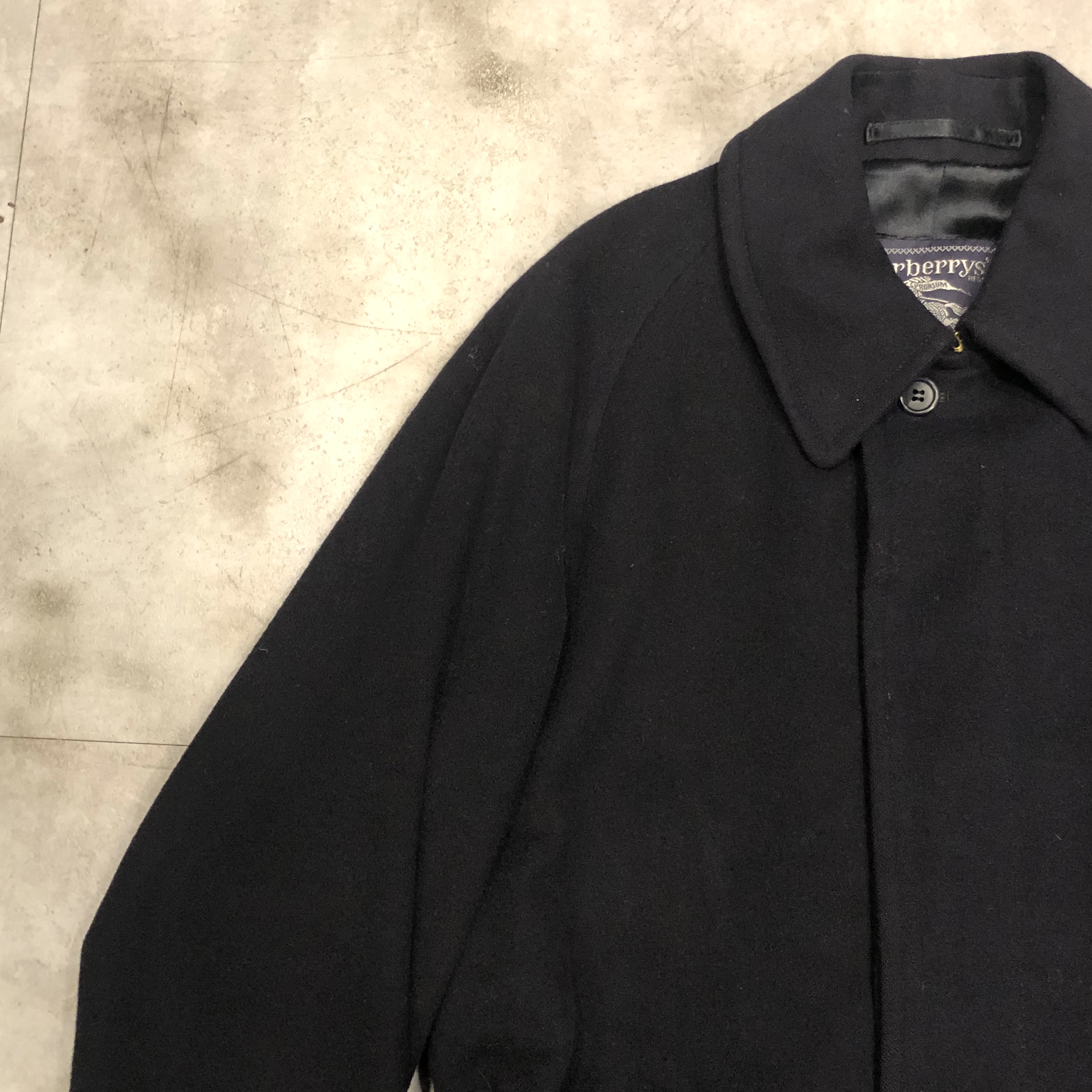 - 近年お探しの方が急増している1枚袖仕様のウールコートですが、その中でも“ただのウール”では終わらないのが当時のBurberrys。こちらはウール80%・アルパカ20%の“SPECIALITY LODEN”を贅沢に使用した一枚袖のスペシャルモデル。見た瞬間にわかるあの独特の起毛感、アルパカ混ならではの柔らかさと軽さが共存した極上の生地感で、Burberrys特有の発色と織りの妙を感じます。内側を覗けば総裏はお馴染みのチェック柄、脱いだ時にこそ映える“裏の色気”も完備。シルエットはもちろん一枚袖のAラインで、肩は落ち、裾に向かってふわりと広がる最高にエレガントなフォルム。付属のベルトでぎゅっと縛ればまるでタイロッケンのようにも着られ、無造作に垂らしてラフに羽織るだけでも絵になる万能さ。デニムや軍パンはもちろん、スラックスの上からさらっと羽織るだけで“出来る大人”の雰囲気に仕上げてくれます。サイズ表記は46 RL、ゴールデンサイズと言って差し支えない抜群のバランス。このあたりの希少個体は年々海外流出が進んでおり、今後さらに入手困難になることは間違いありませんので、ピンときた方はぜひこの機会に。