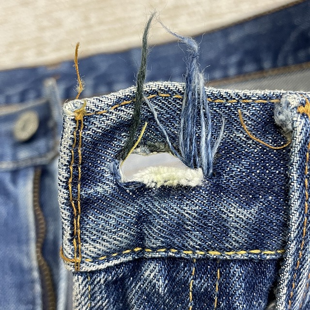 ウエストボタンホールにホツレがあり、左膝裏付近に糸ツレがございます。
