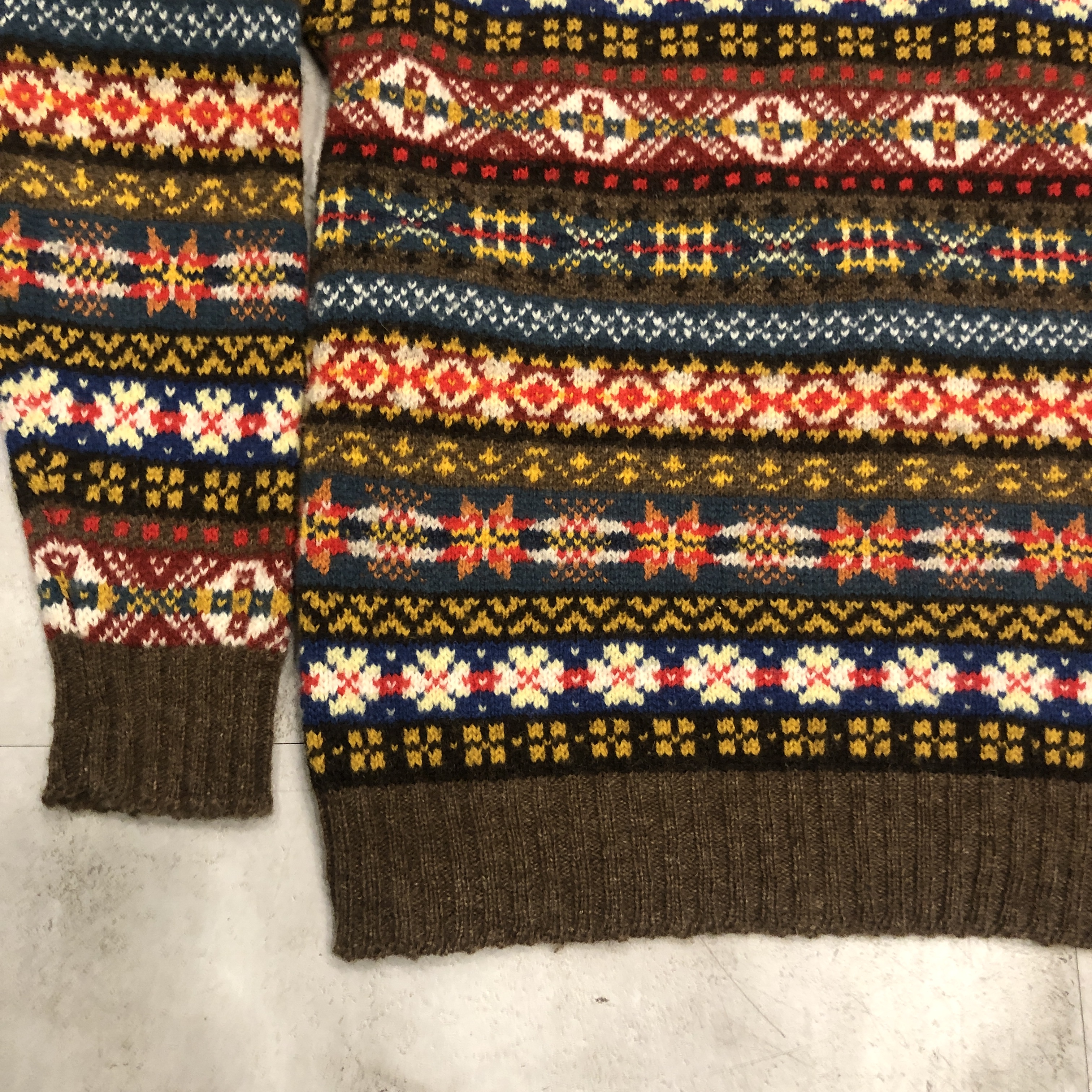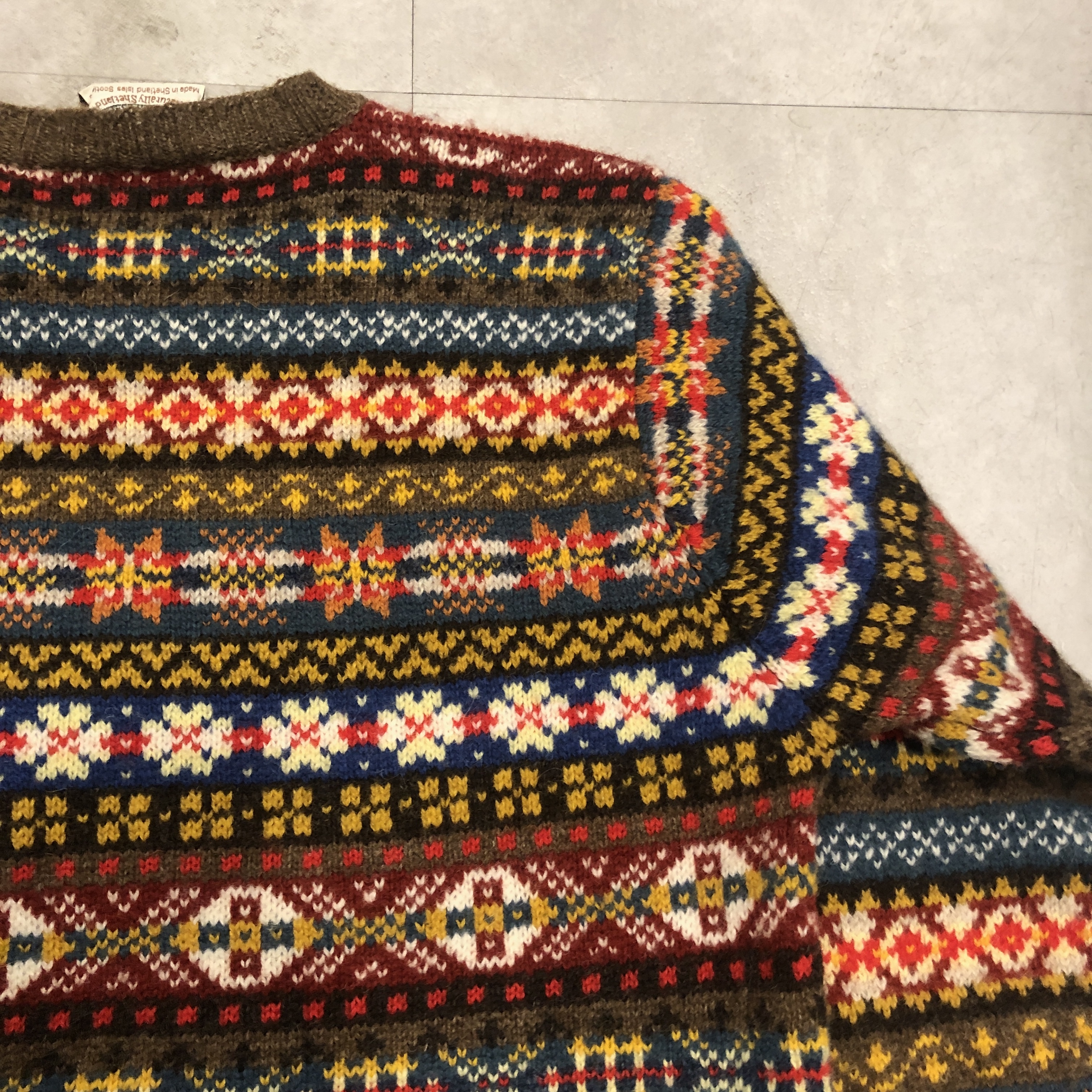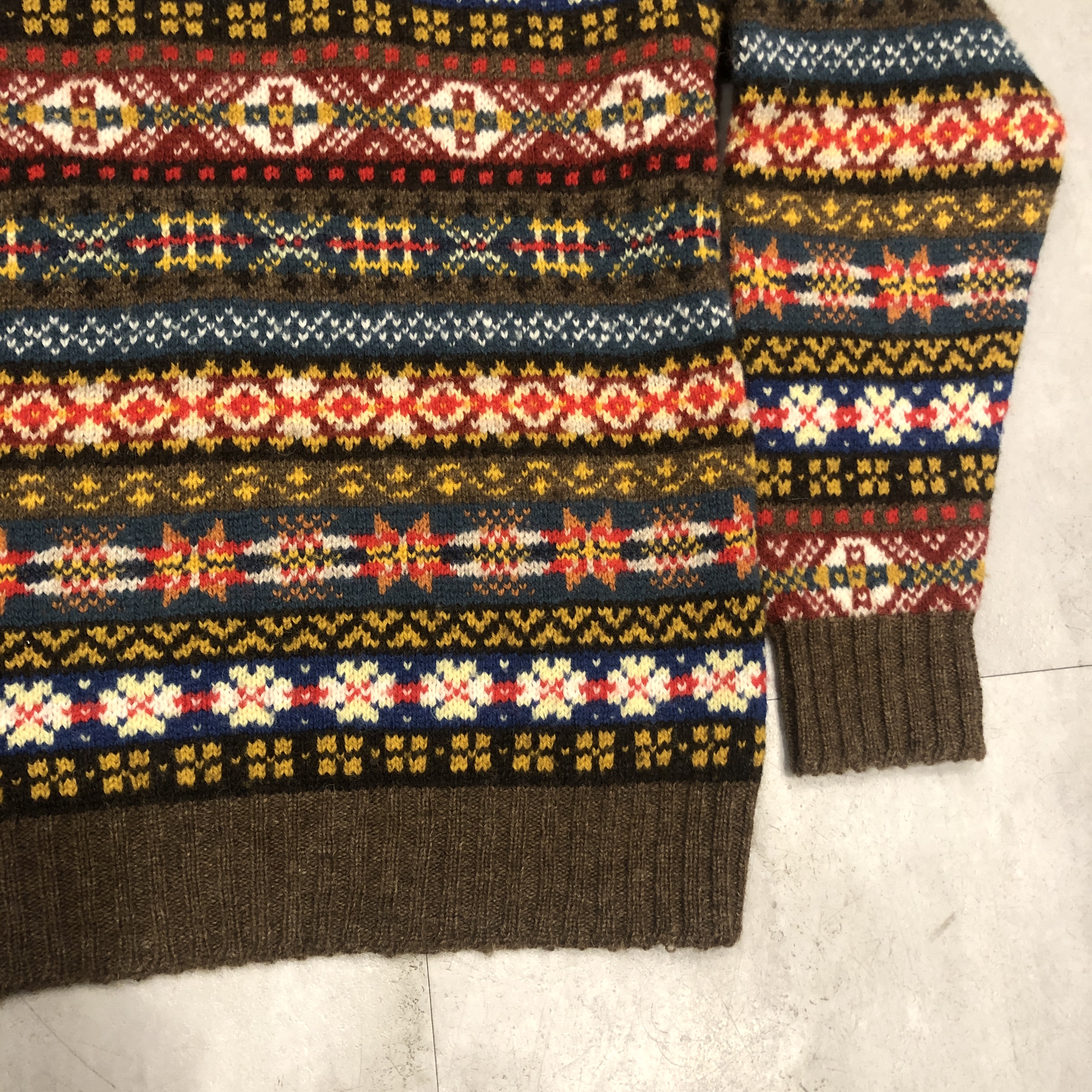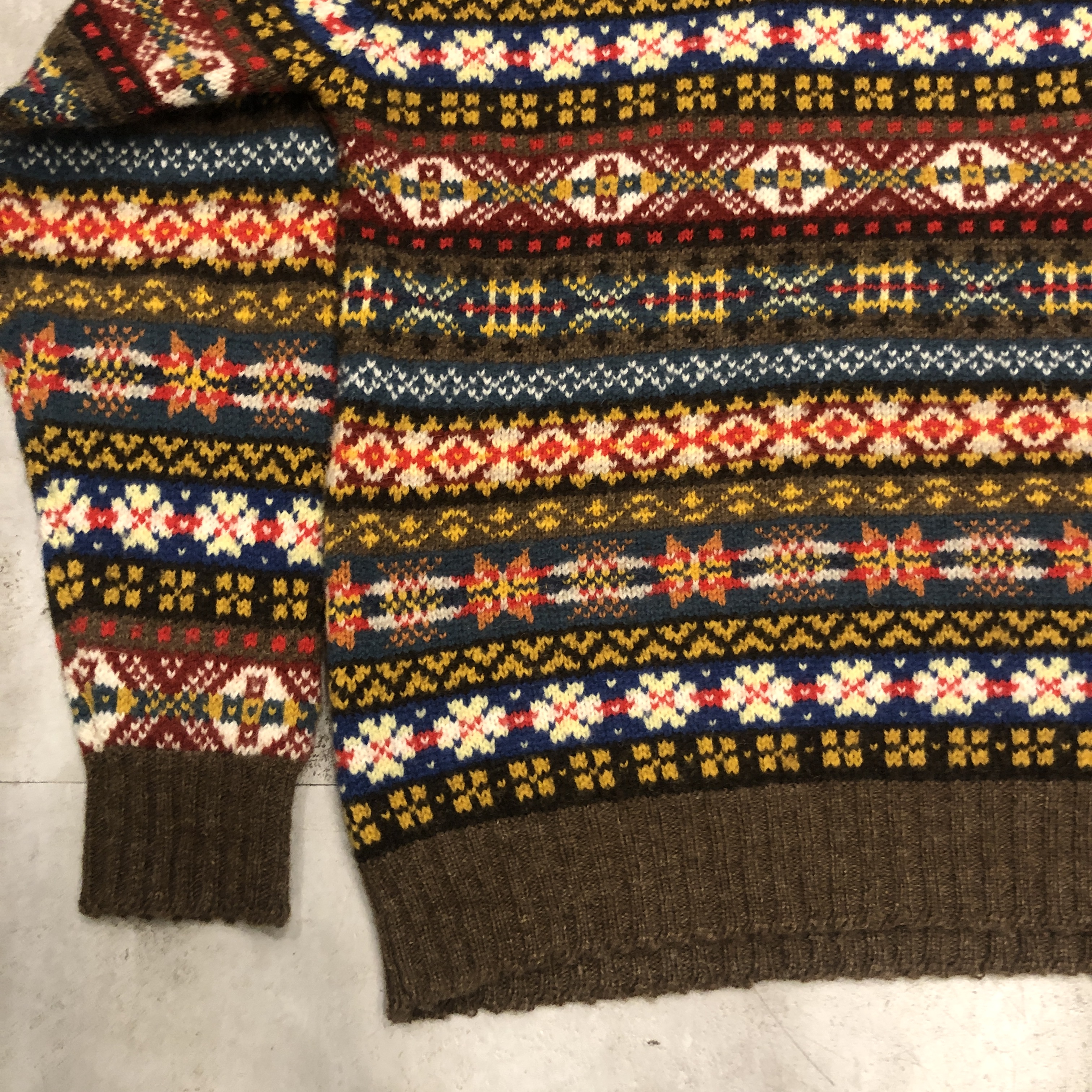 柄は伝統的なフェアアイルパターンで、ブラウンをベースにブルーやレッド、イエローなどの強いトーンを絶妙に配色。クラシックでありながらどこかモダンな印象を漂わせます。首元から肩にかけてのヨーク切り替えがリズムを生み、リブのテンションも程よく、着用時のバランスが秀逸です。