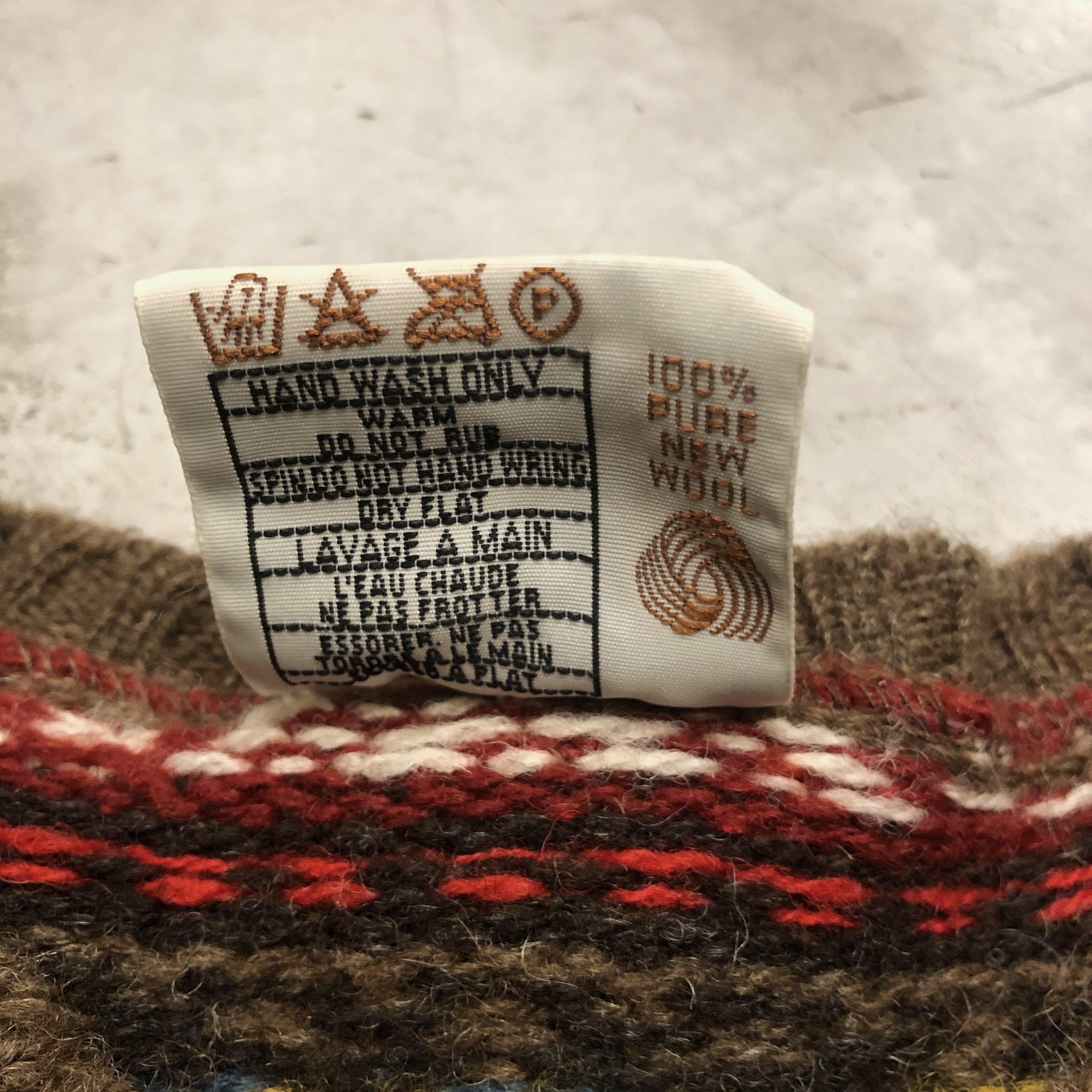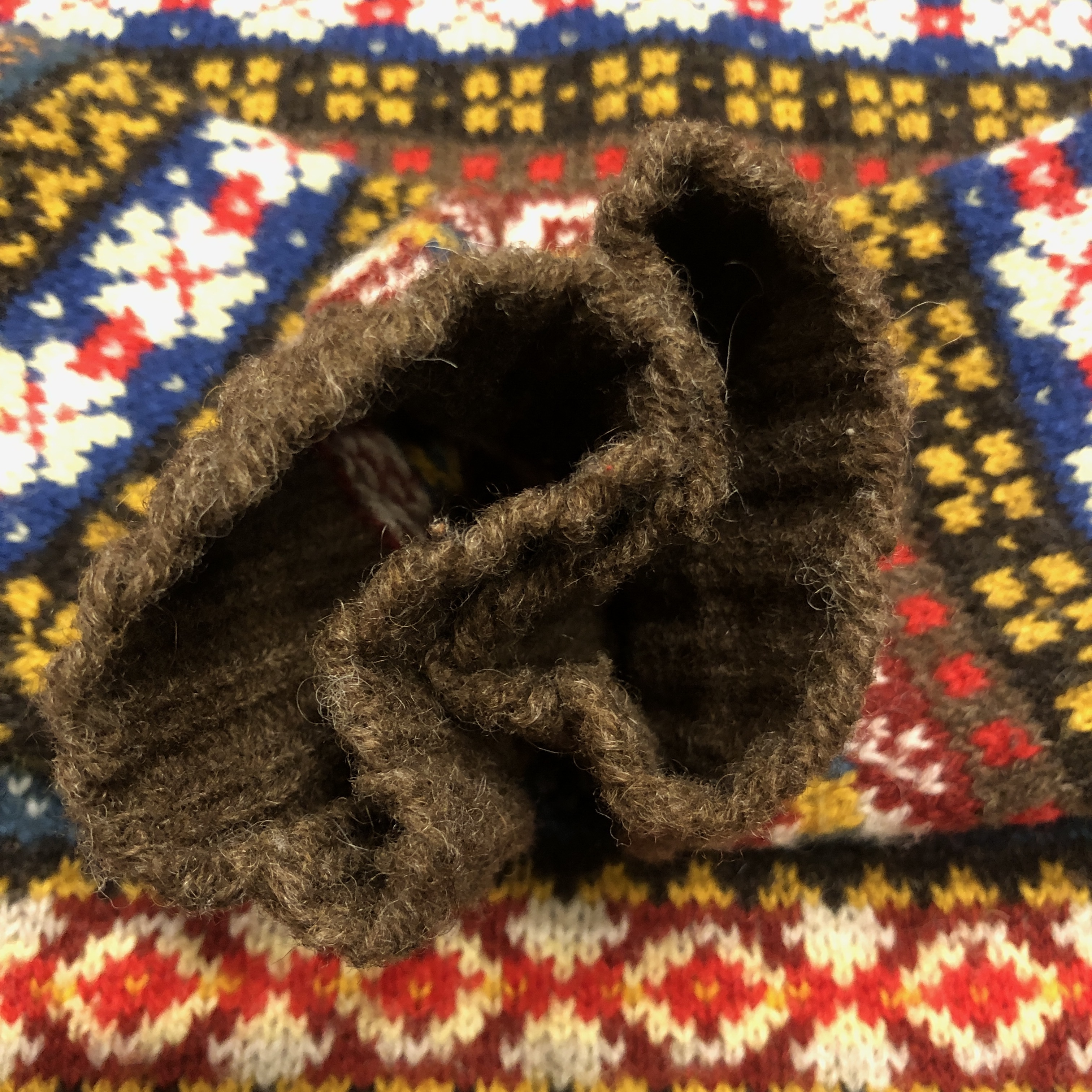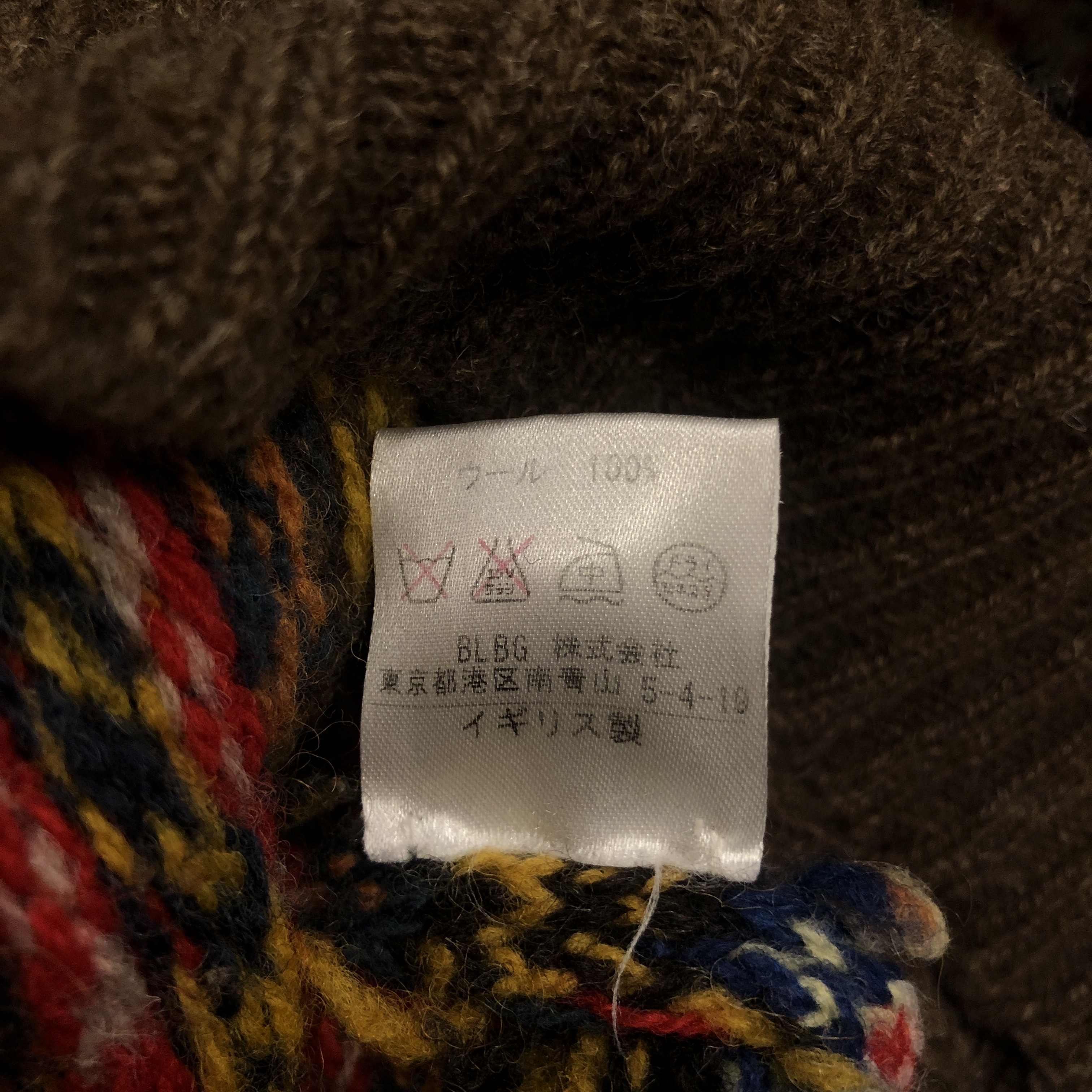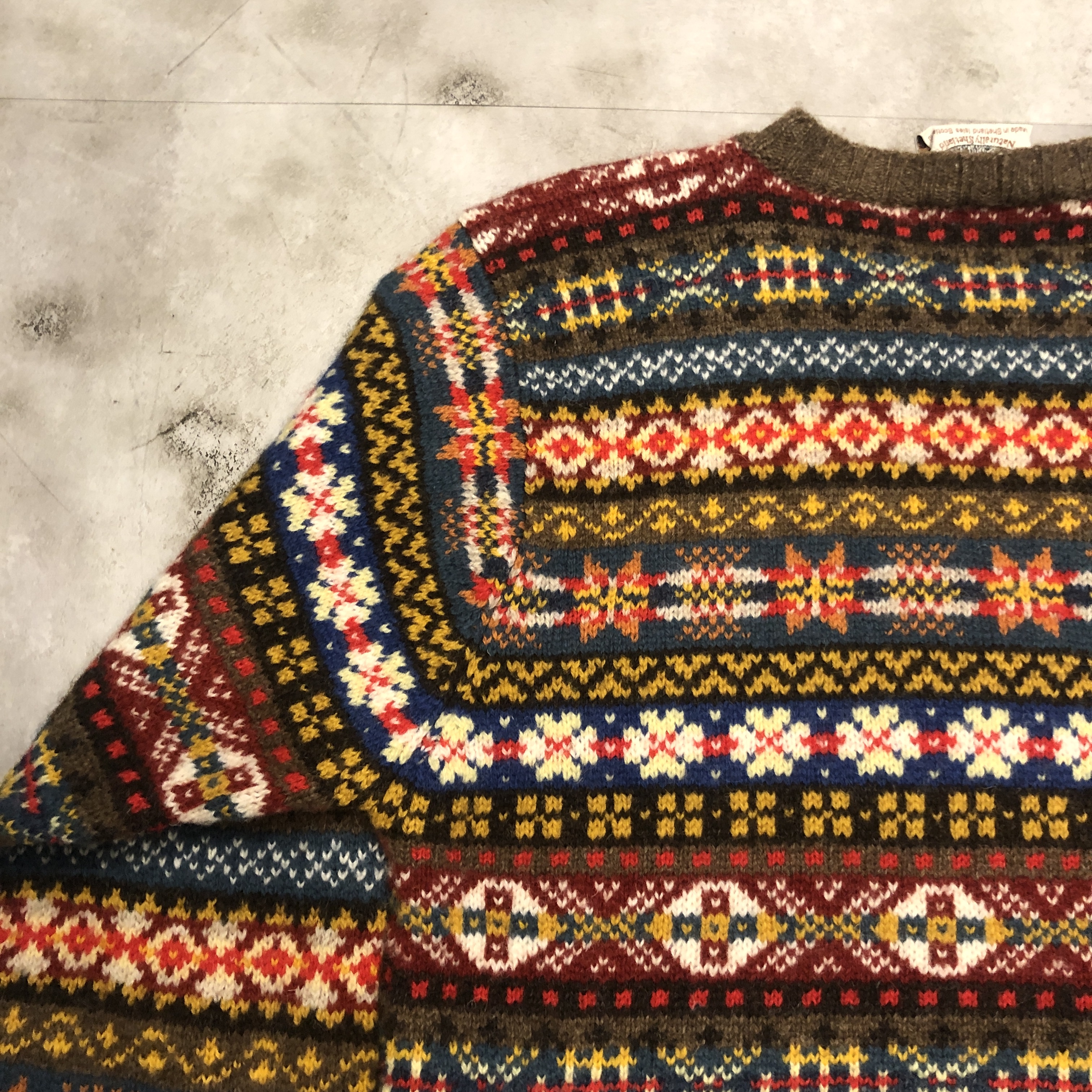 柄は伝統的なフェアアイルパターンで、ブラウンをベースにブルーやレッド、イエローなどの強いトーンを絶妙に配色。クラシックでありながらどこかモダンな印象を漂わせます。首元から肩にかけてのヨーク切り替えがリズムを生み、リブのテンションも程よく、着用時のバランスが秀逸です。