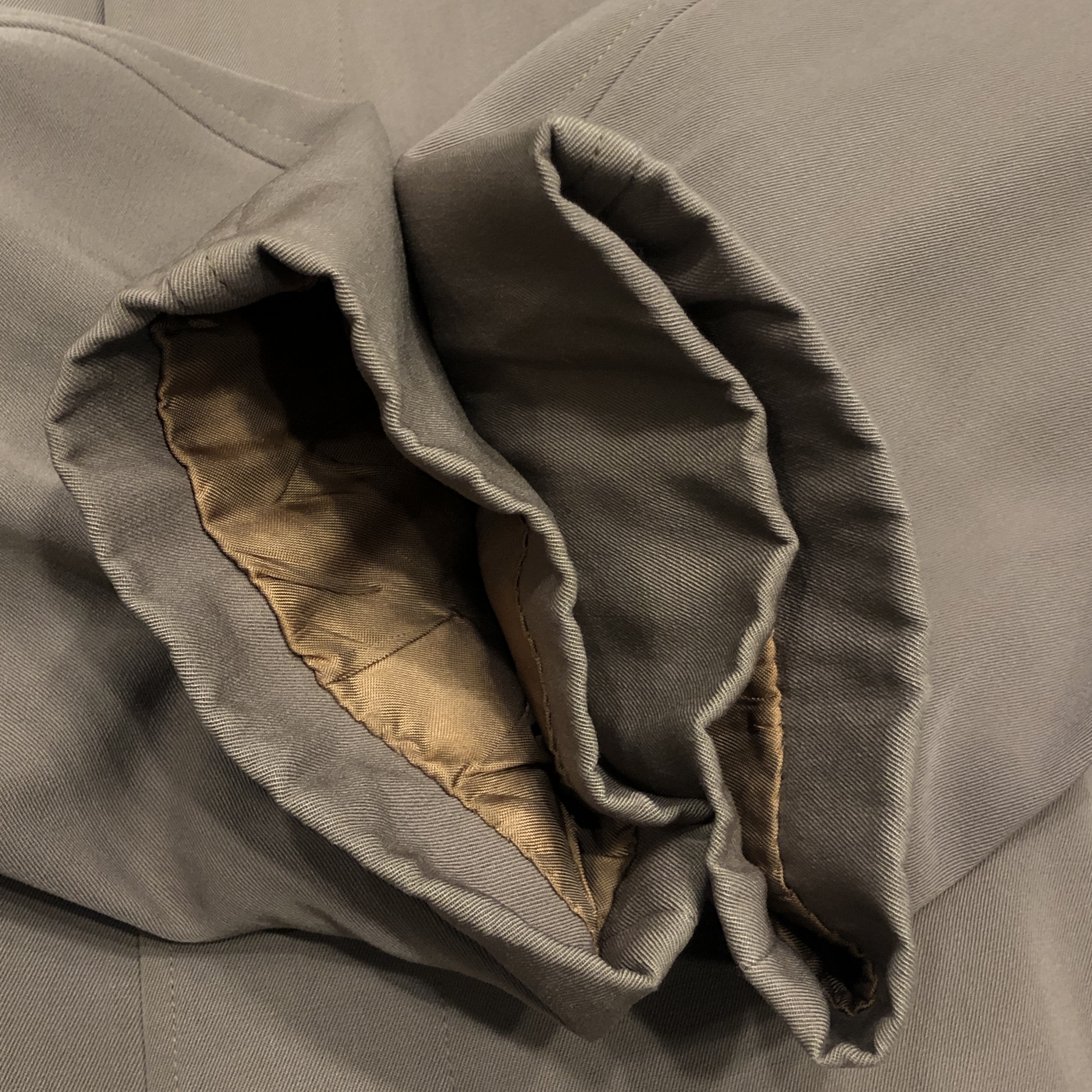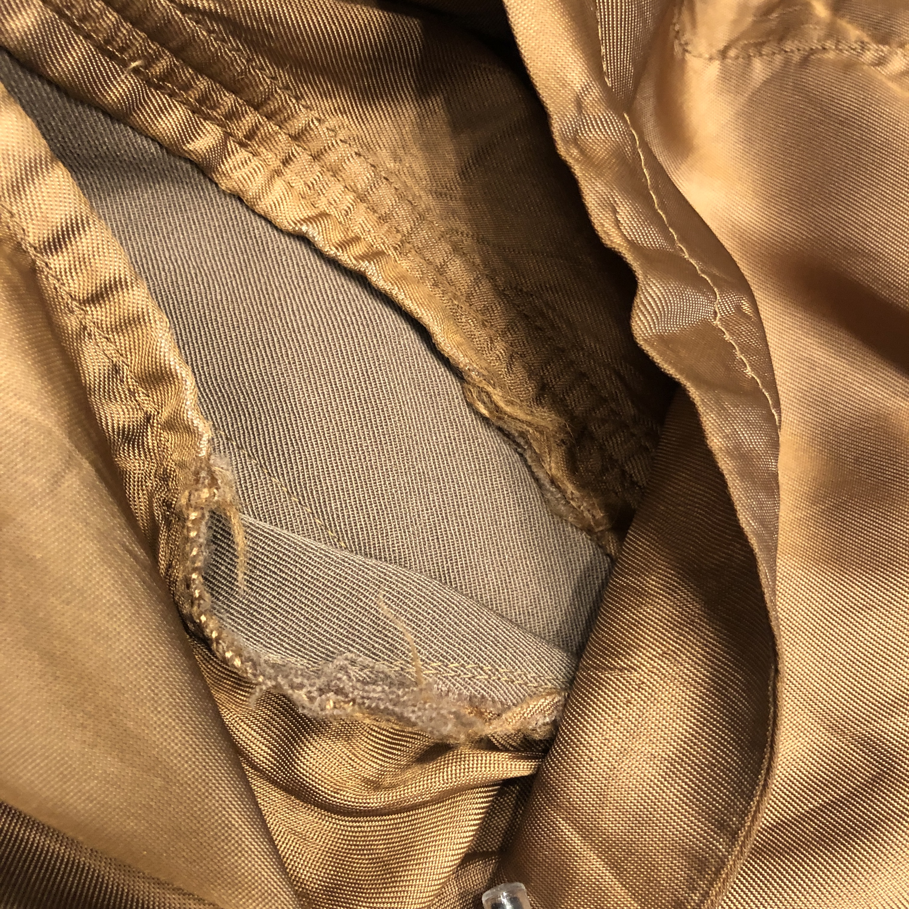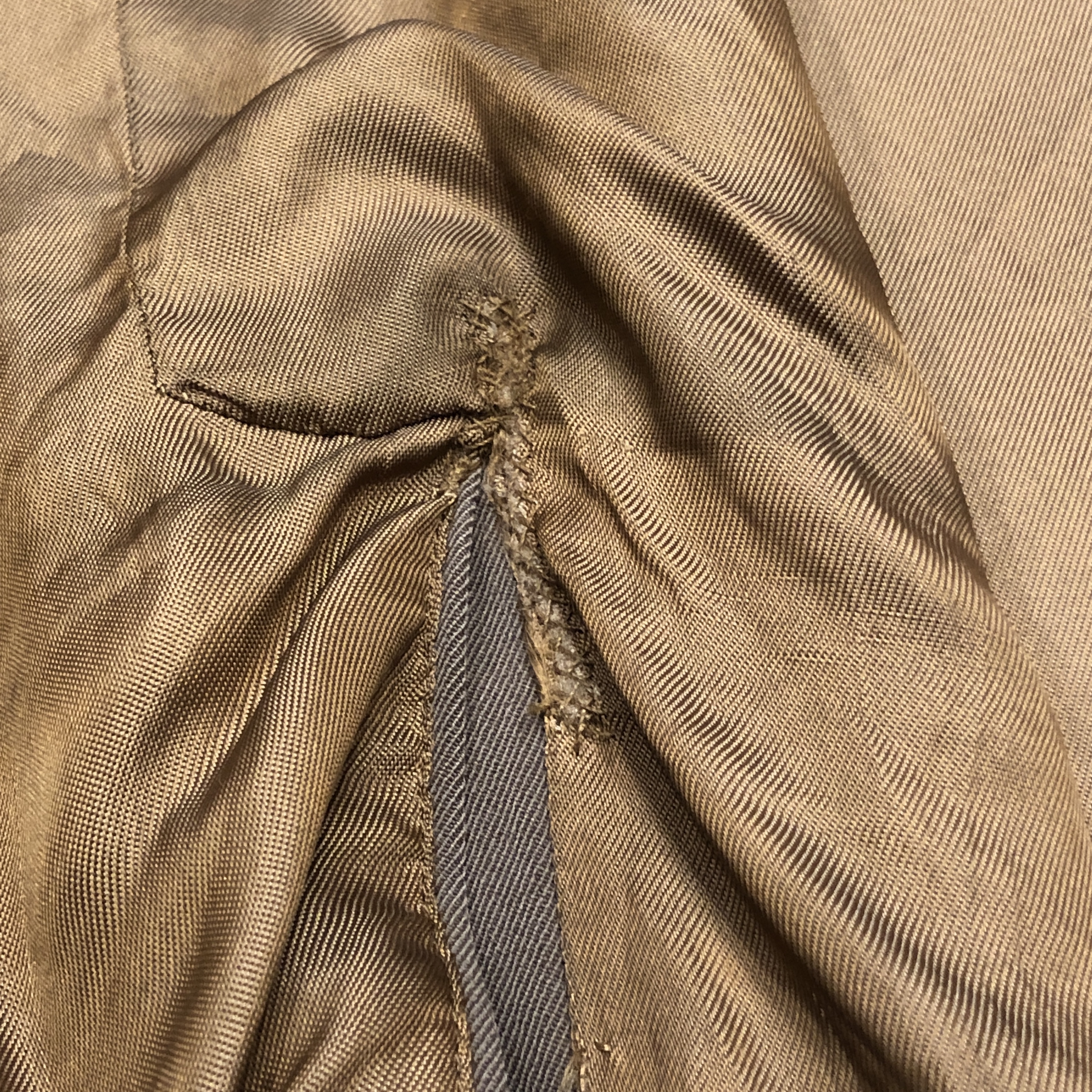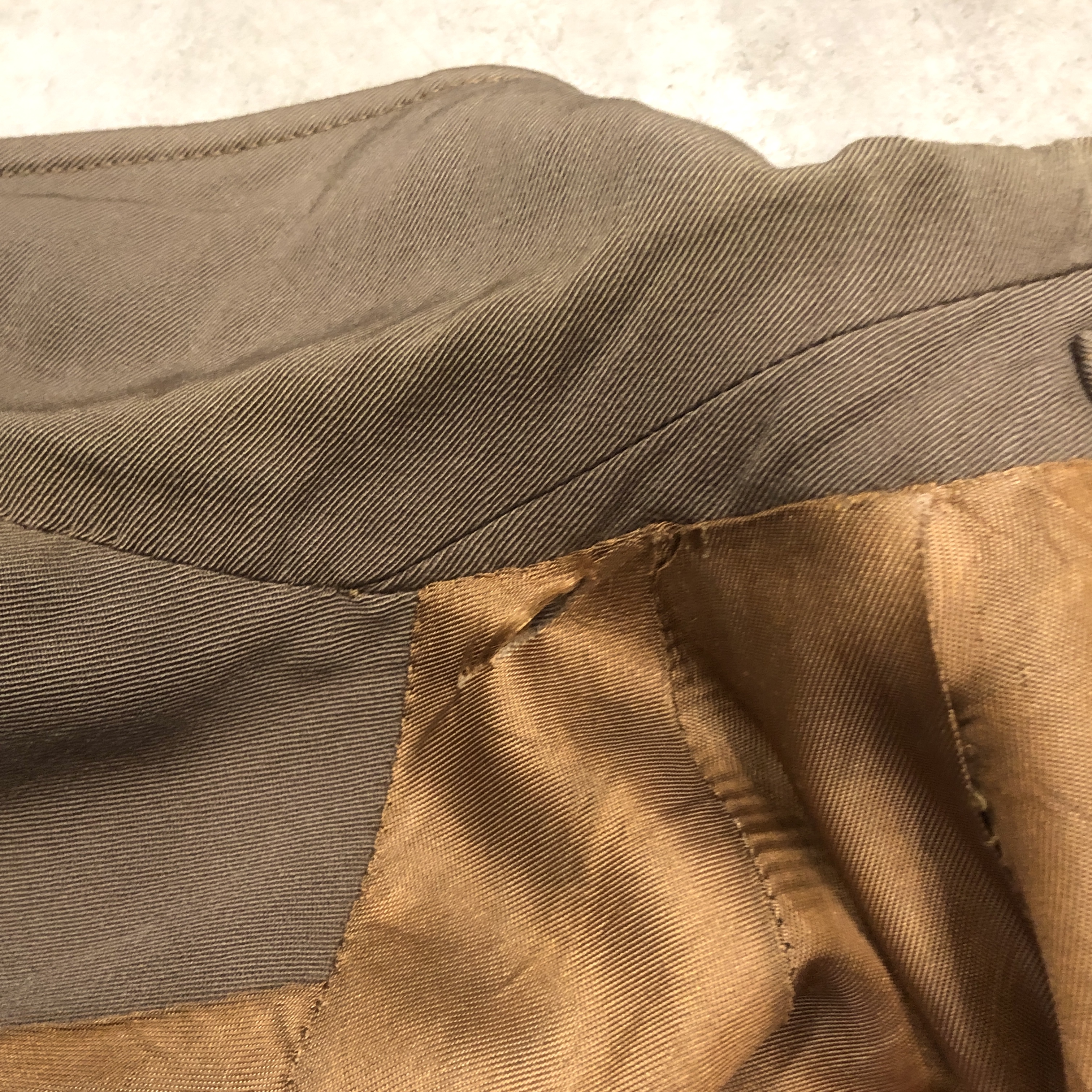 - 年代相応の着用感、背面の右脇付近の汚れやスレ、内側プリーツ部分のリペア跡、ポケット縁や襟部分のダメージ等がそれぞれ画像の様にございますが、古着慣れされている方でしたら問題なくお使いいただる範囲です。