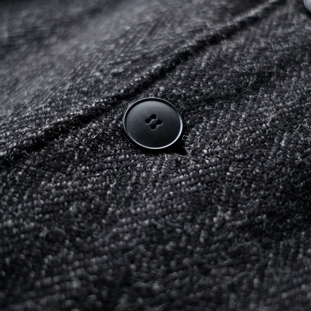 セットインスリーブで、美しいシルエット。ボタンの留め方で見せ方を変える事ができ、上部まで留めて着たときの雰囲気は圧巻です。