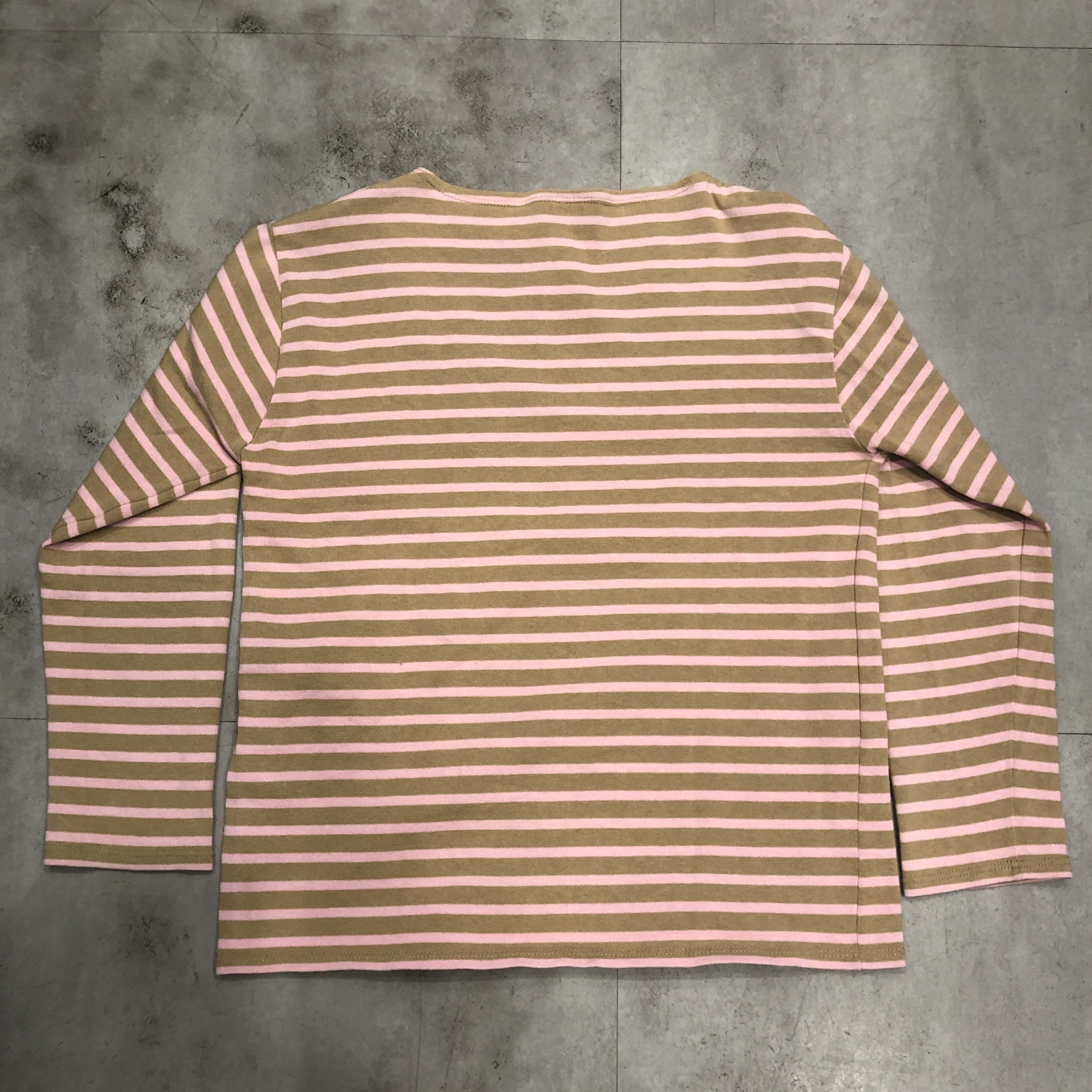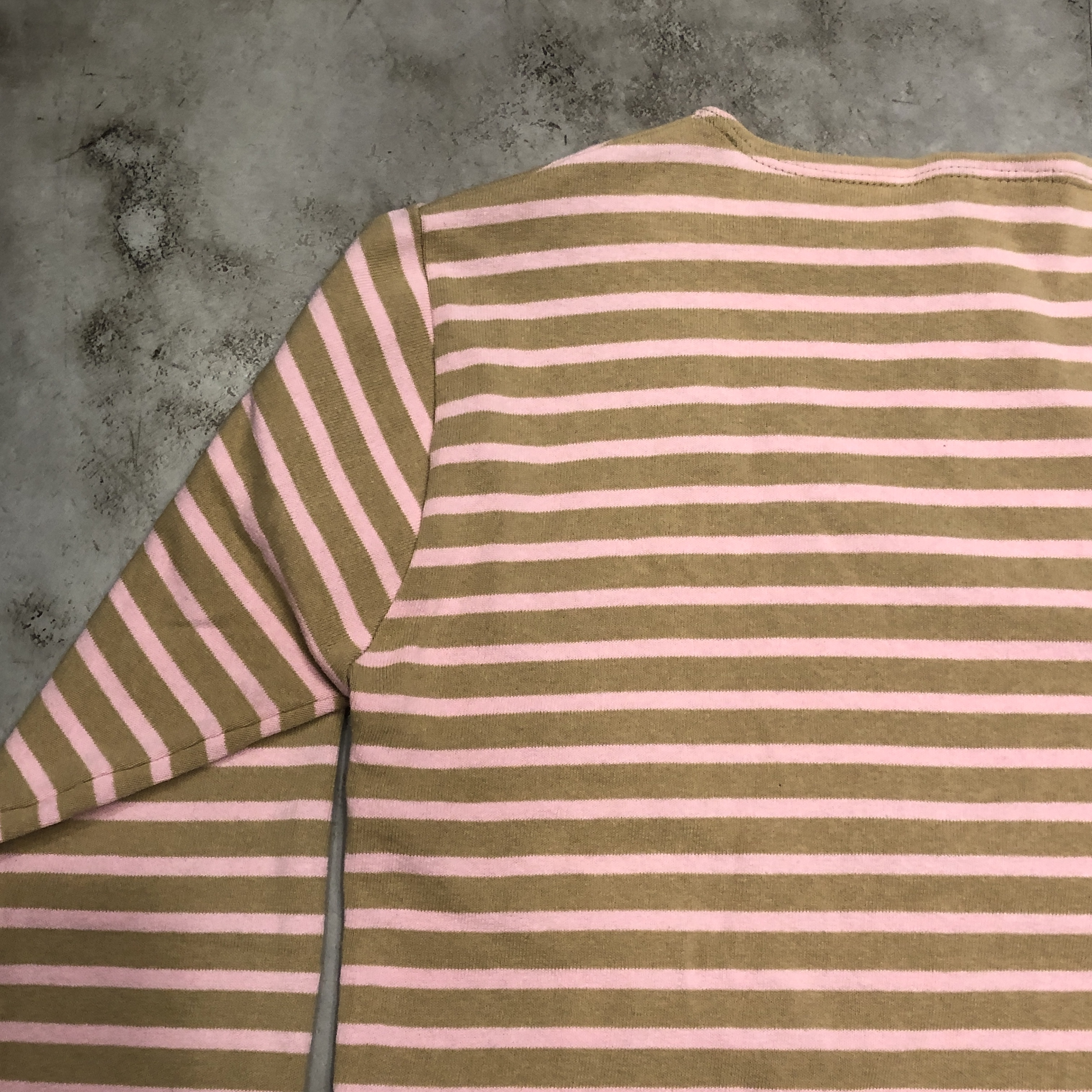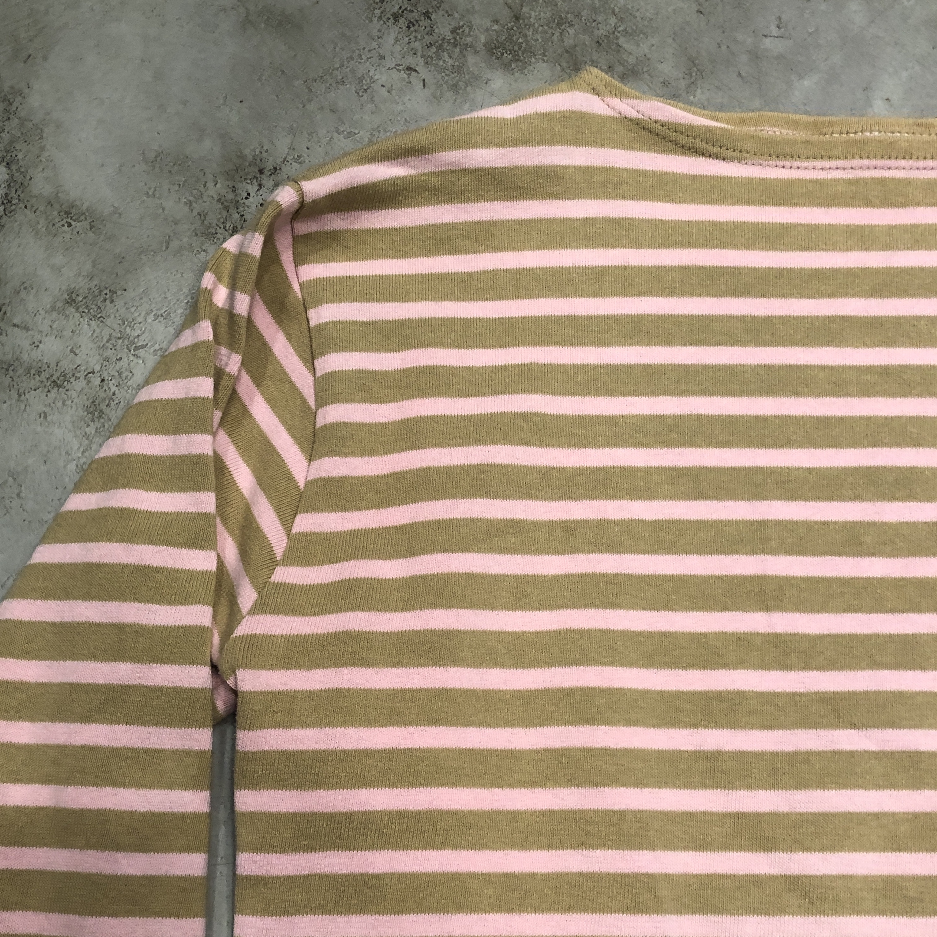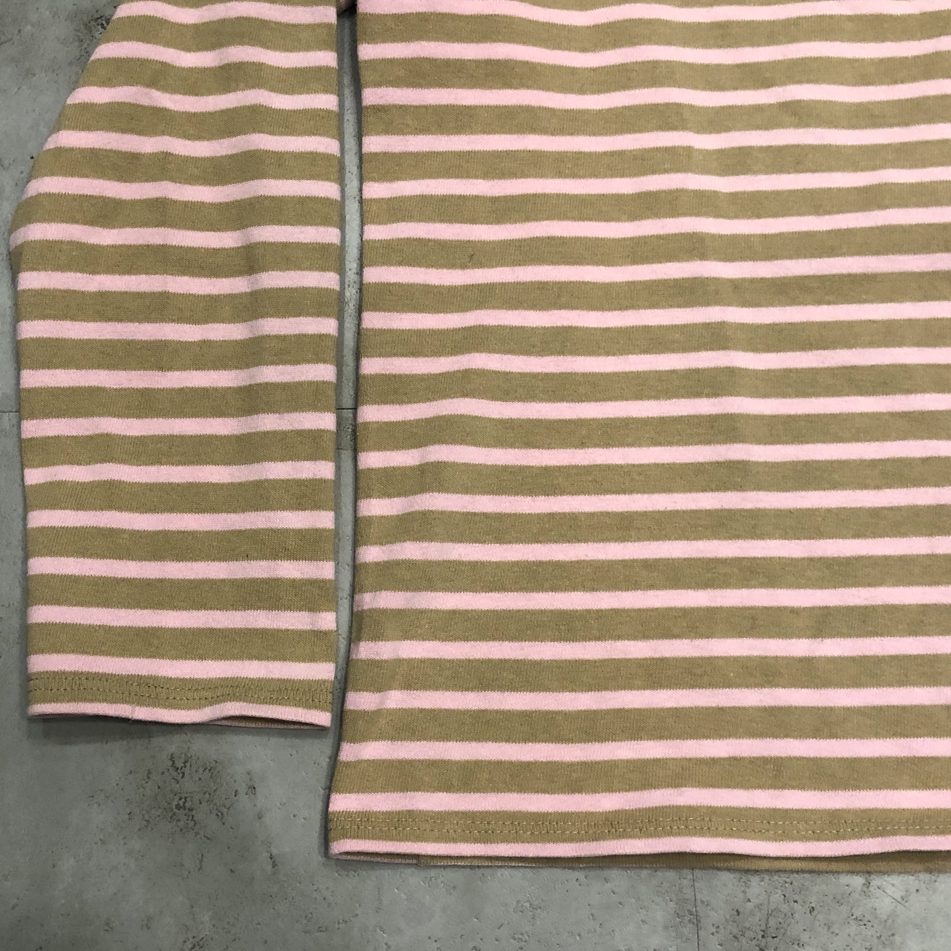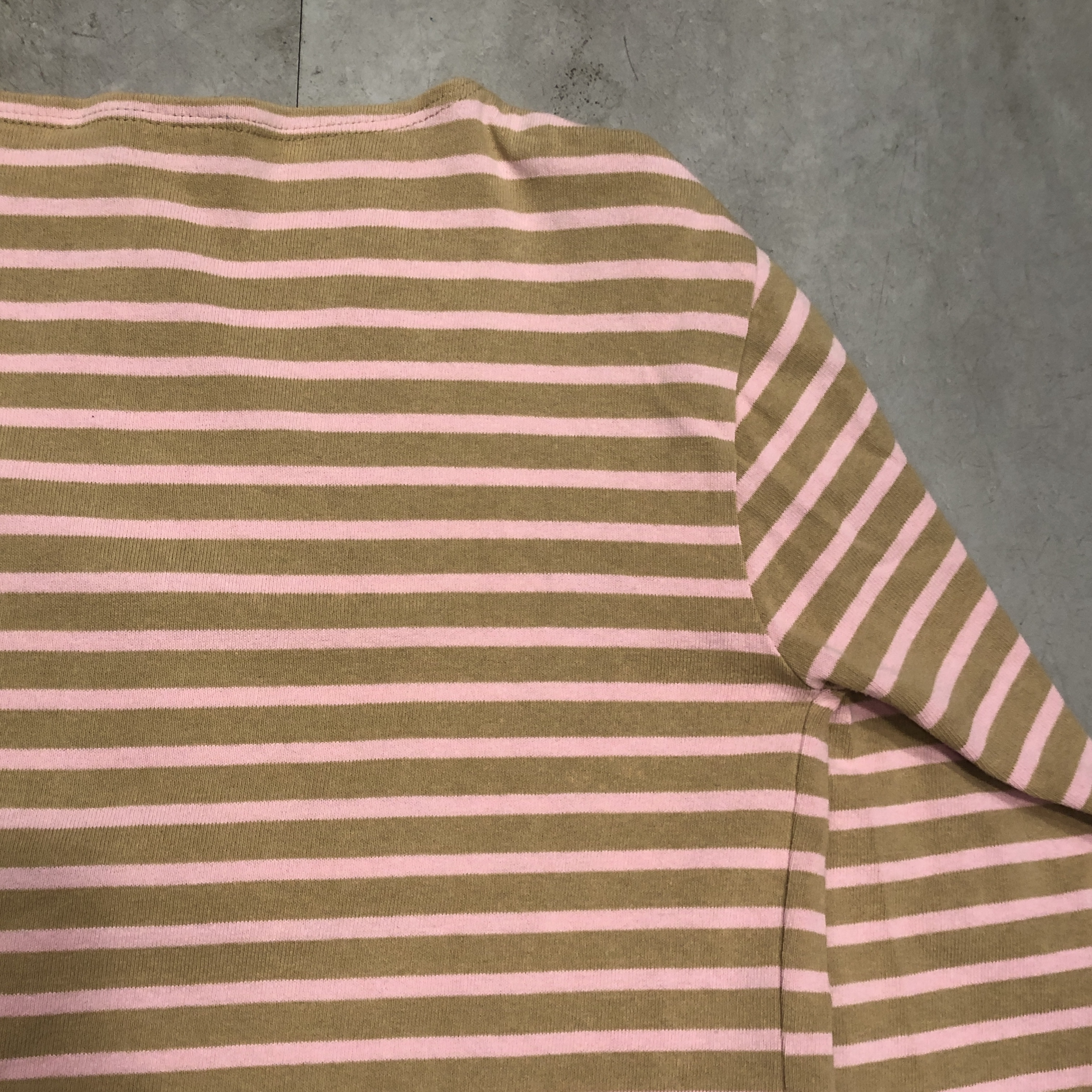 今回ご紹介するのは柔らかな印象のブラウン/ ピンクのボーダーカラー。ミリタリーやワークスタイルにも馴染み、カジュアルからシックまで幅広く対応します。素材は100%コットンの目の詰まった天竺生地。着始めはしっかりとした張り感があり、洗い込むことで徐々に柔らかく、肌馴染みの良い風合いへと育っていきます。