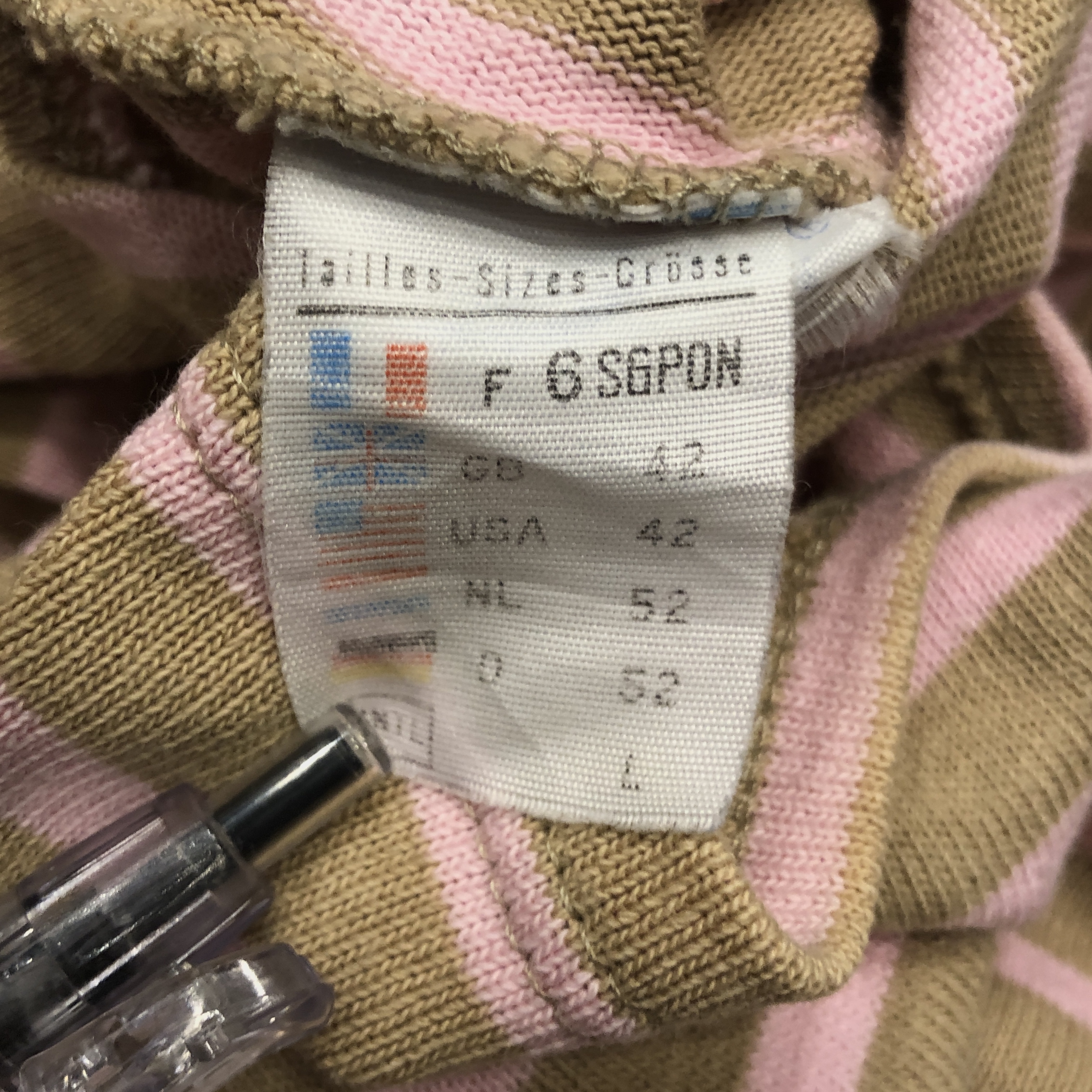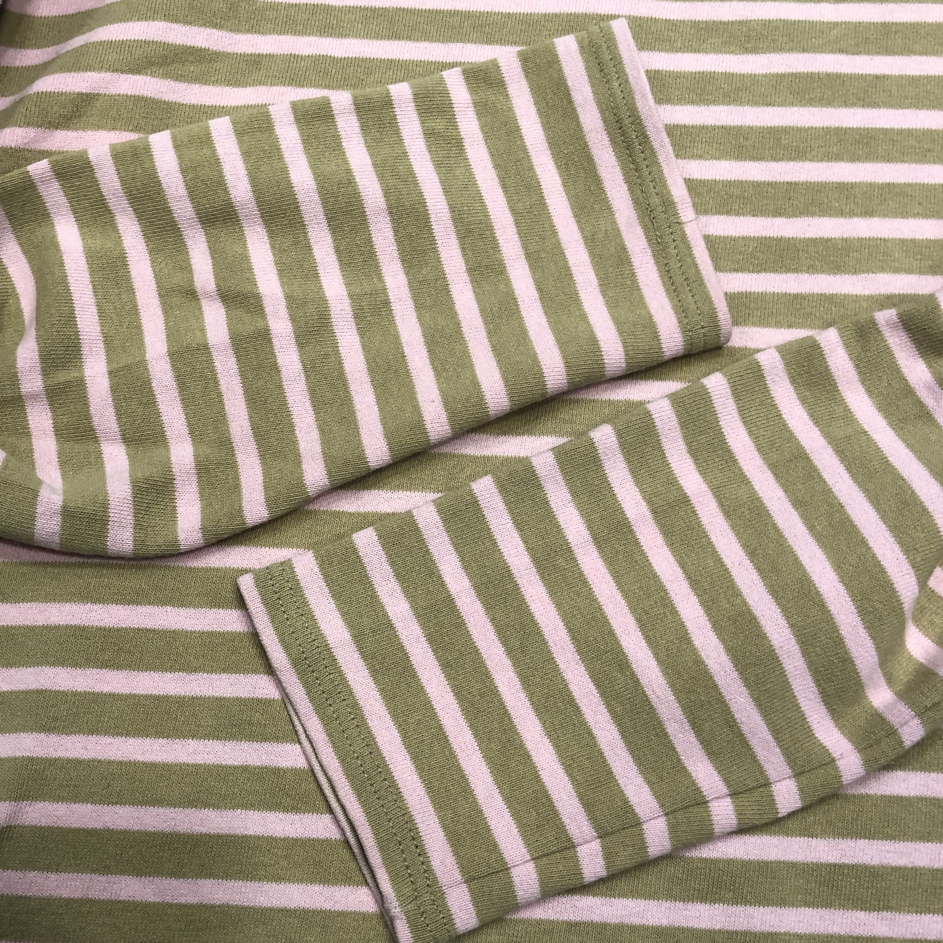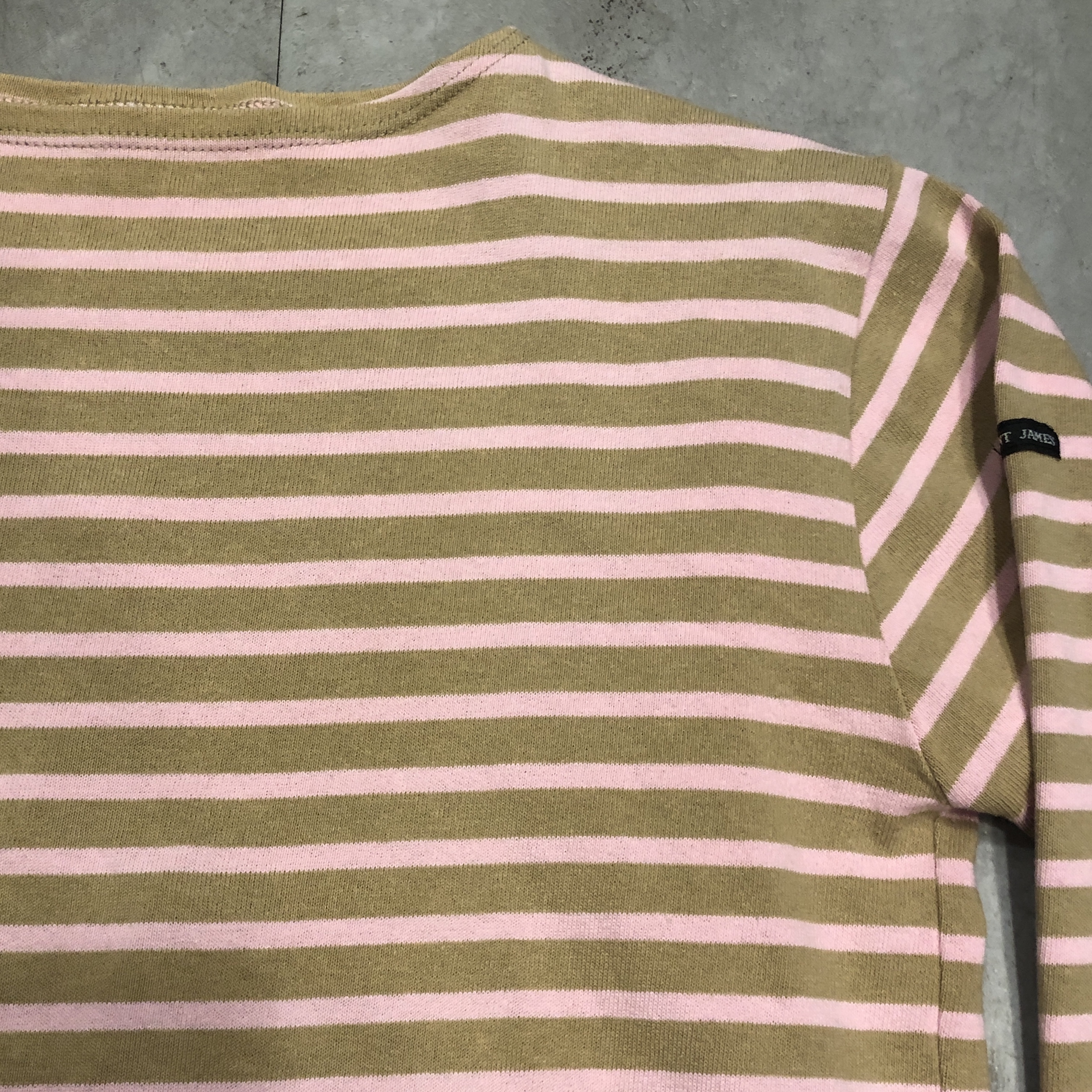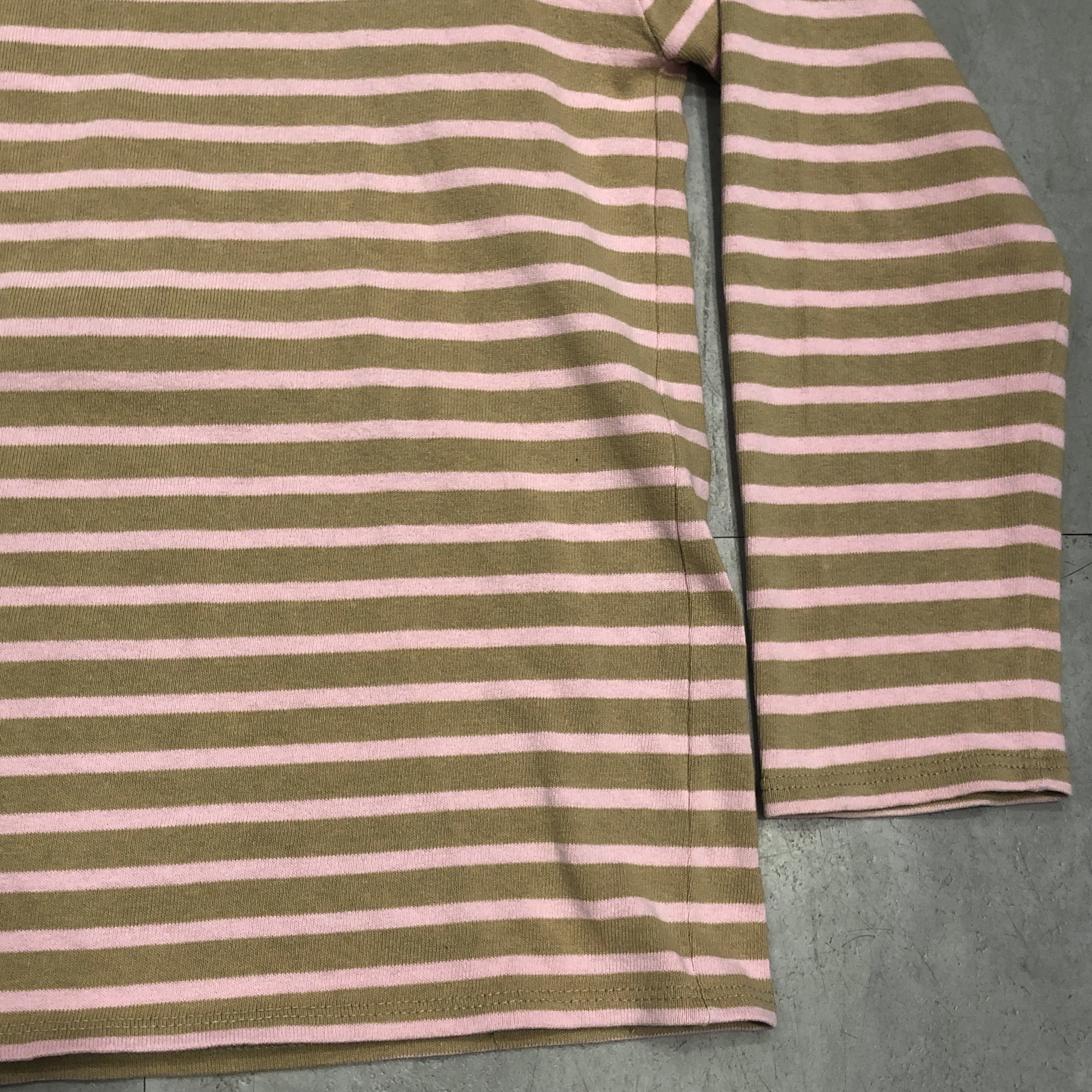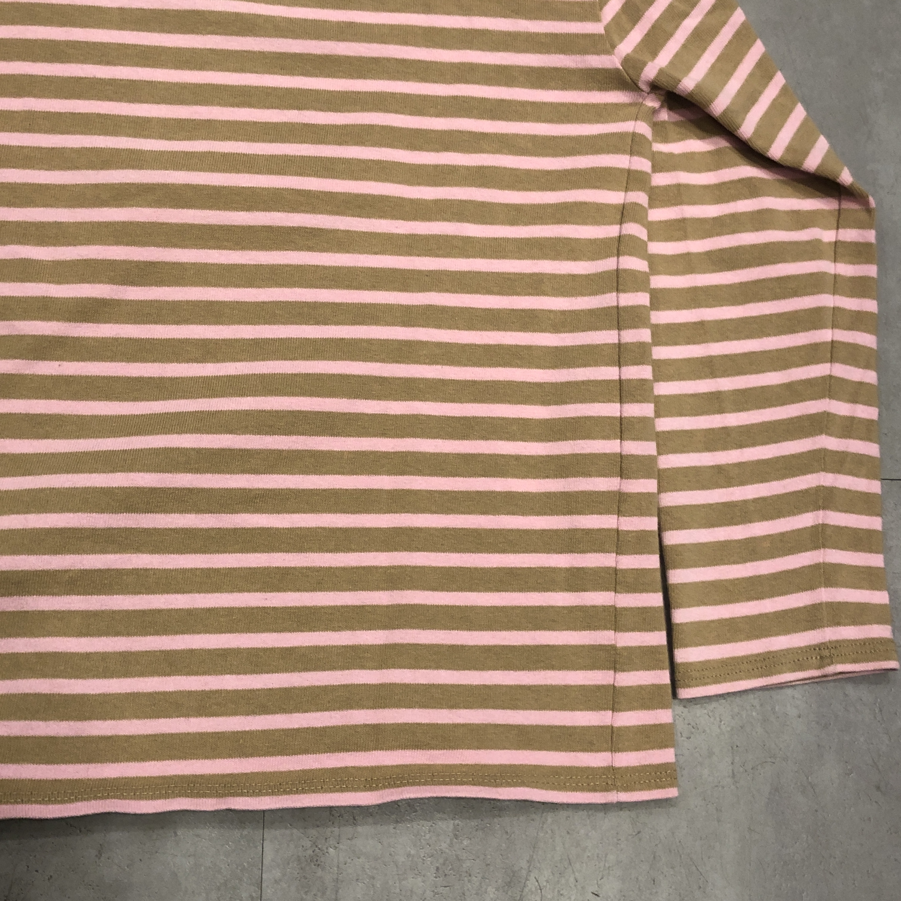 今回ご紹介するのは柔らかな印象のブラウン/ ピンクのボーダーカラー。ミリタリーやワークスタイルにも馴染み、カジュアルからシックまで幅広く対応します。素材は100%コットンの目の詰まった天竺生地。着始めはしっかりとした張り感があり、洗い込むことで徐々に柔らかく、肌馴染みの良い風合いへと育っていきます。