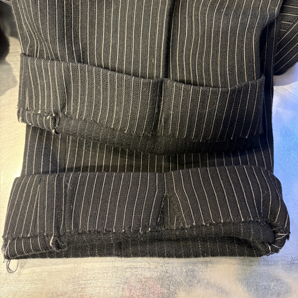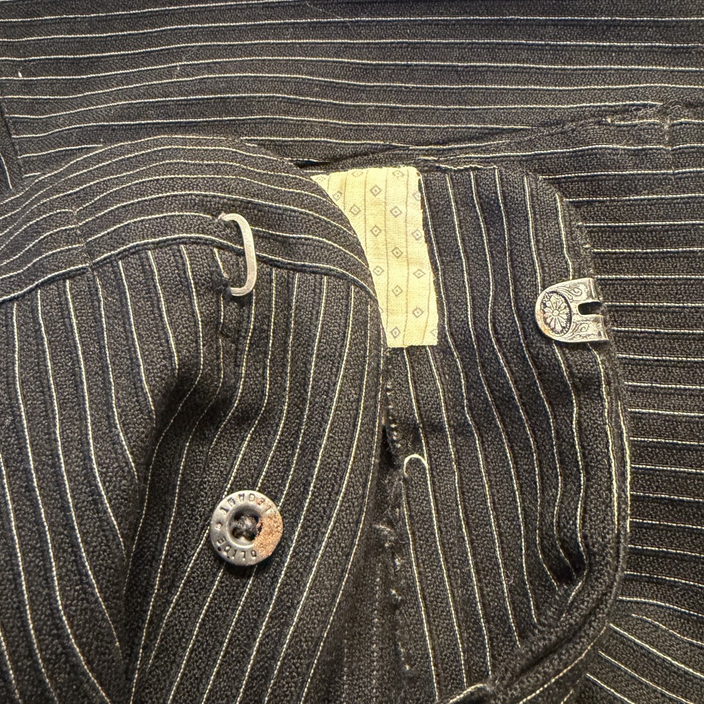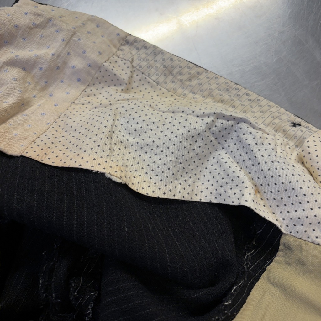 - ダメージや汚れが全体的にあり着用感ございます。ウエストバンドの部分が縫いなおされています。