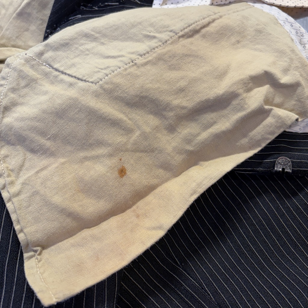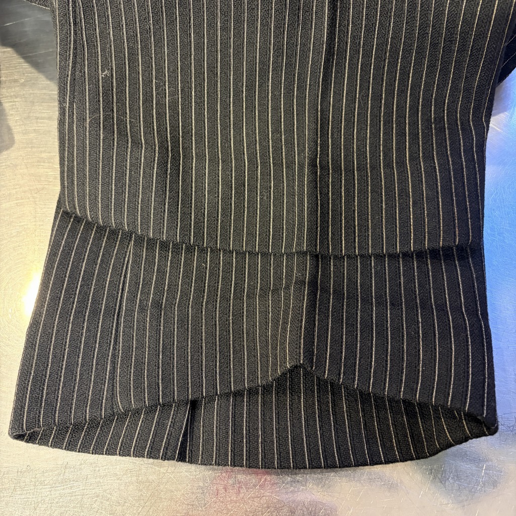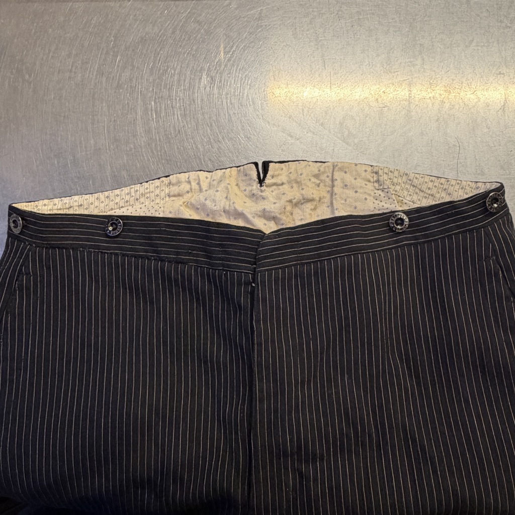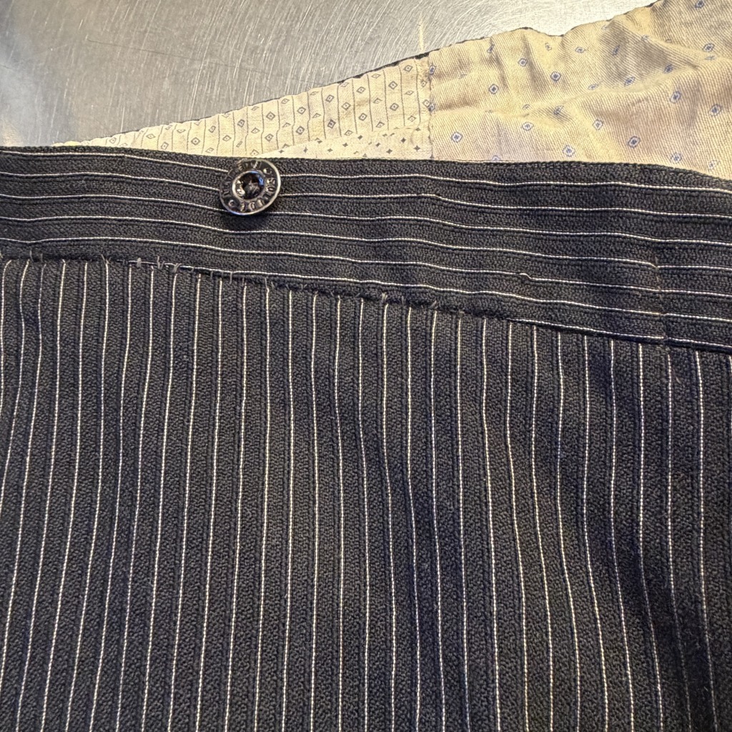 - ダメージや汚れが全体的にあり着用感ございます。ウエストバンドの部分が縫いなおされています。
