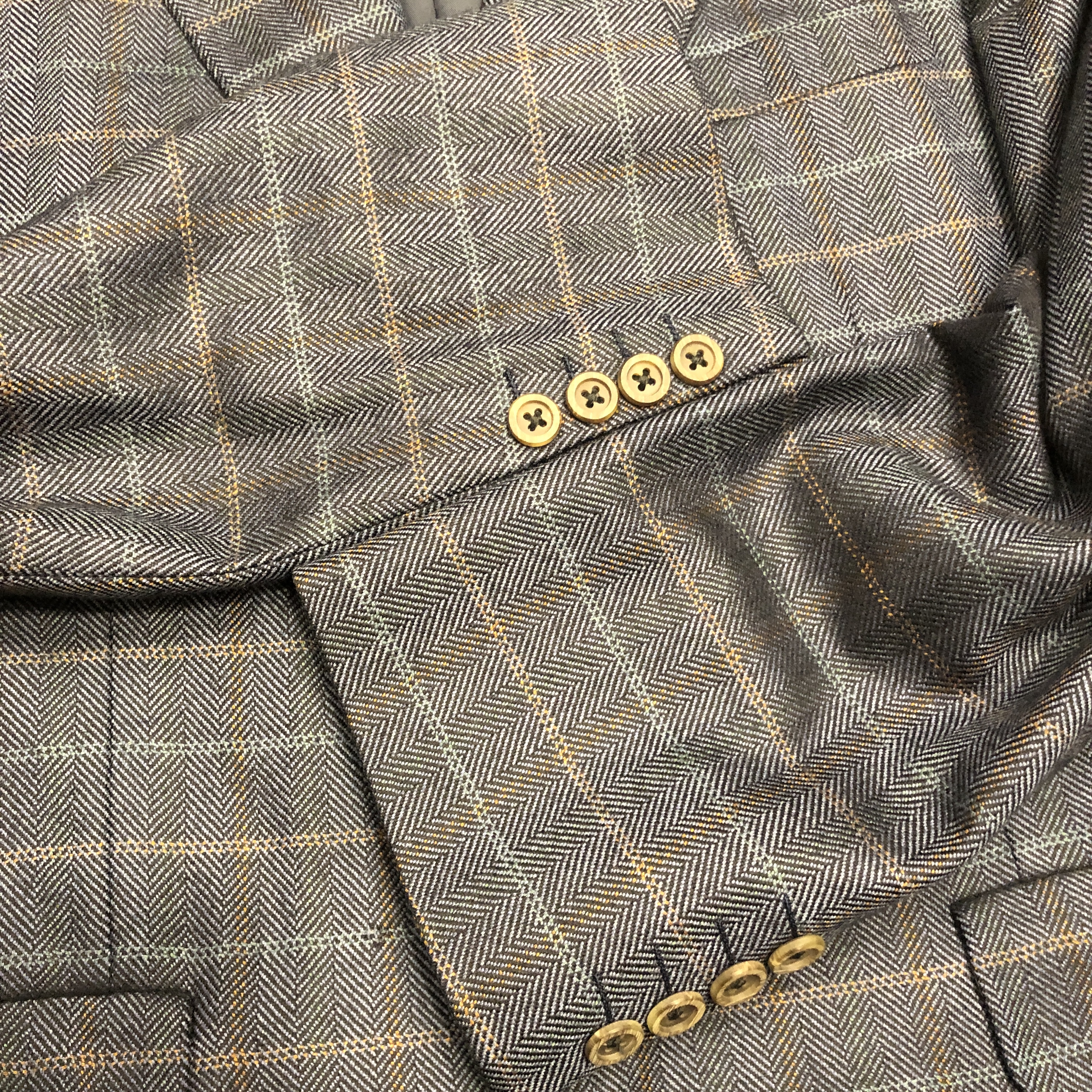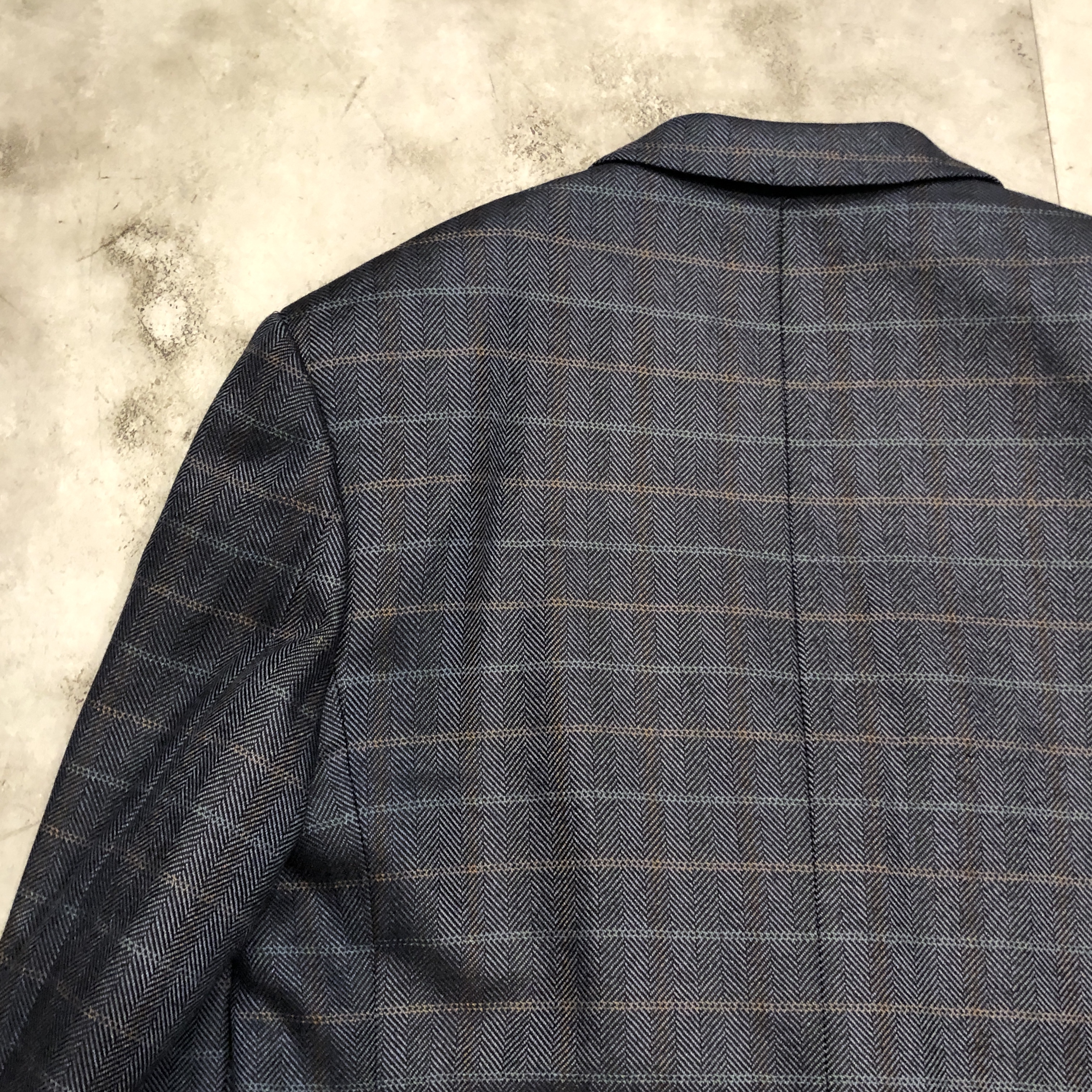 生地はヘリンボーンベースに淡いオーバーペーンが走る正統派。黄金期のサヴィル・ロウを彷彿とさせるボリューム感あるラペルと程よいドレープが、クラシカルかつ気品あるシルエットを描き出します。