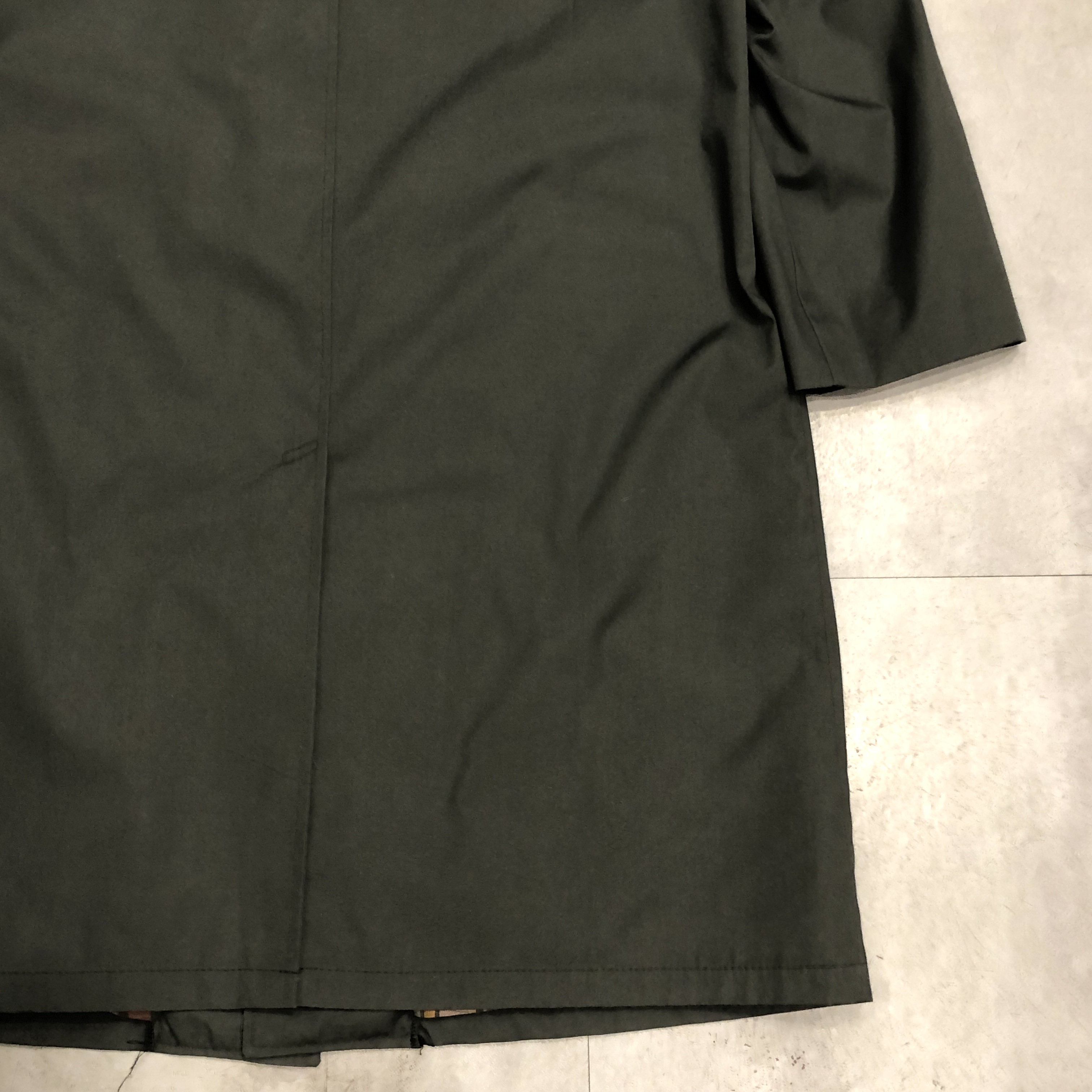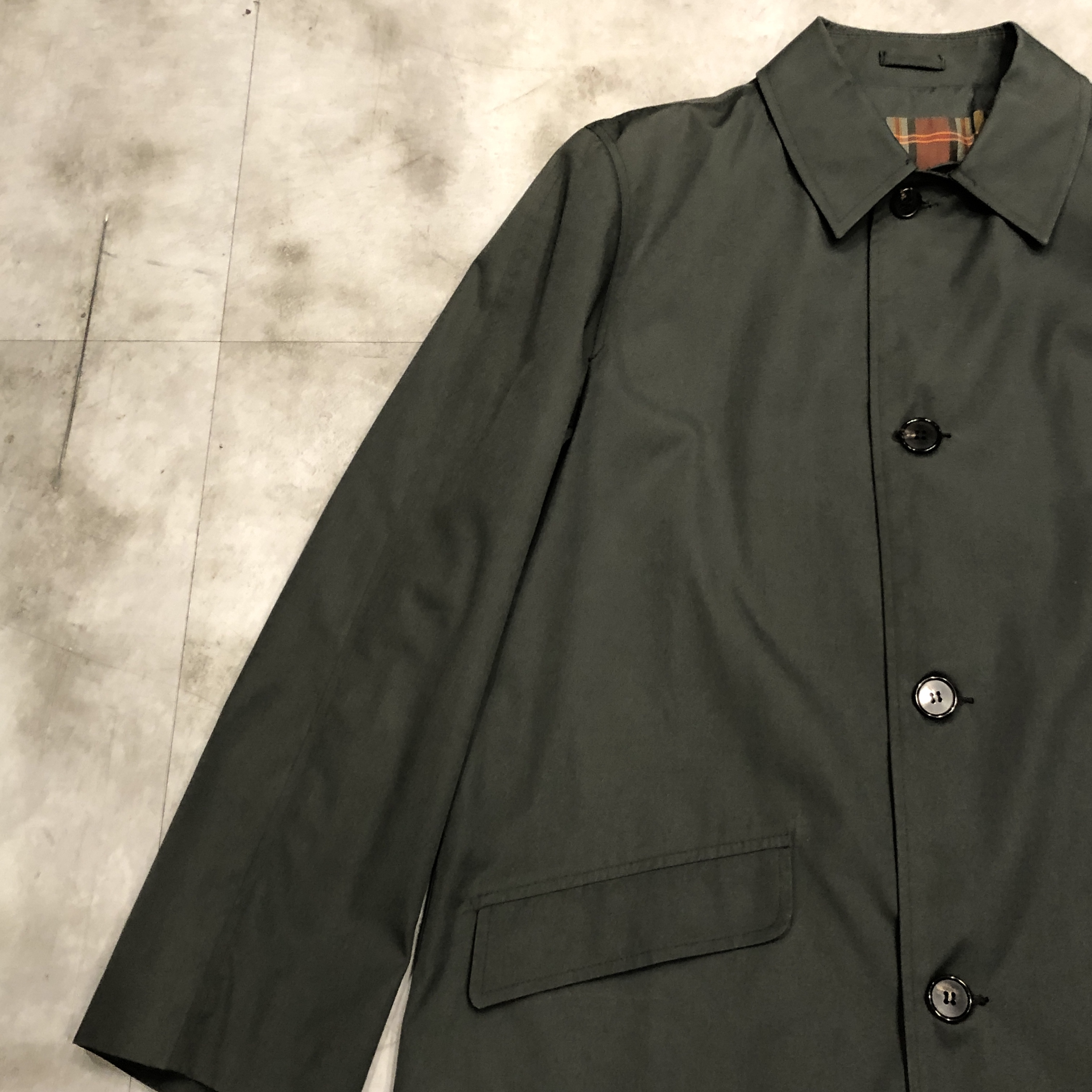 裏地は暖色系チェック。スモーキーグリーンの表地とのコントラストが非常に洒落ています。3つボタンのミニマルなフロント。無駄のないステンカラー。派手さはないのに、確実に雰囲気がある。静かな存在感を放つコートです。