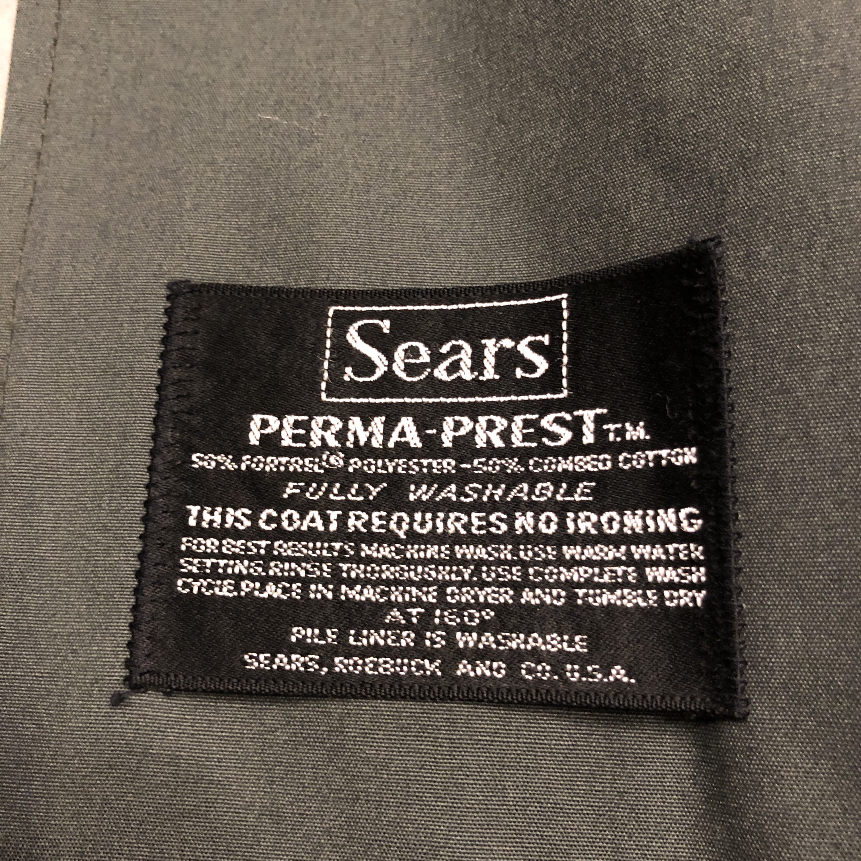 SEARSは当時、アメリカ中産階級の生活を支えた巨大百貨店。そのSEARSが作るアウターは、“手の届く上質”でした。今あらためて見ると、このスモーキーなグリーンは現代のスタイルとも自然に馴染みます。英国コートとはまた違う、アメリカらしい合理美がここにはあります。