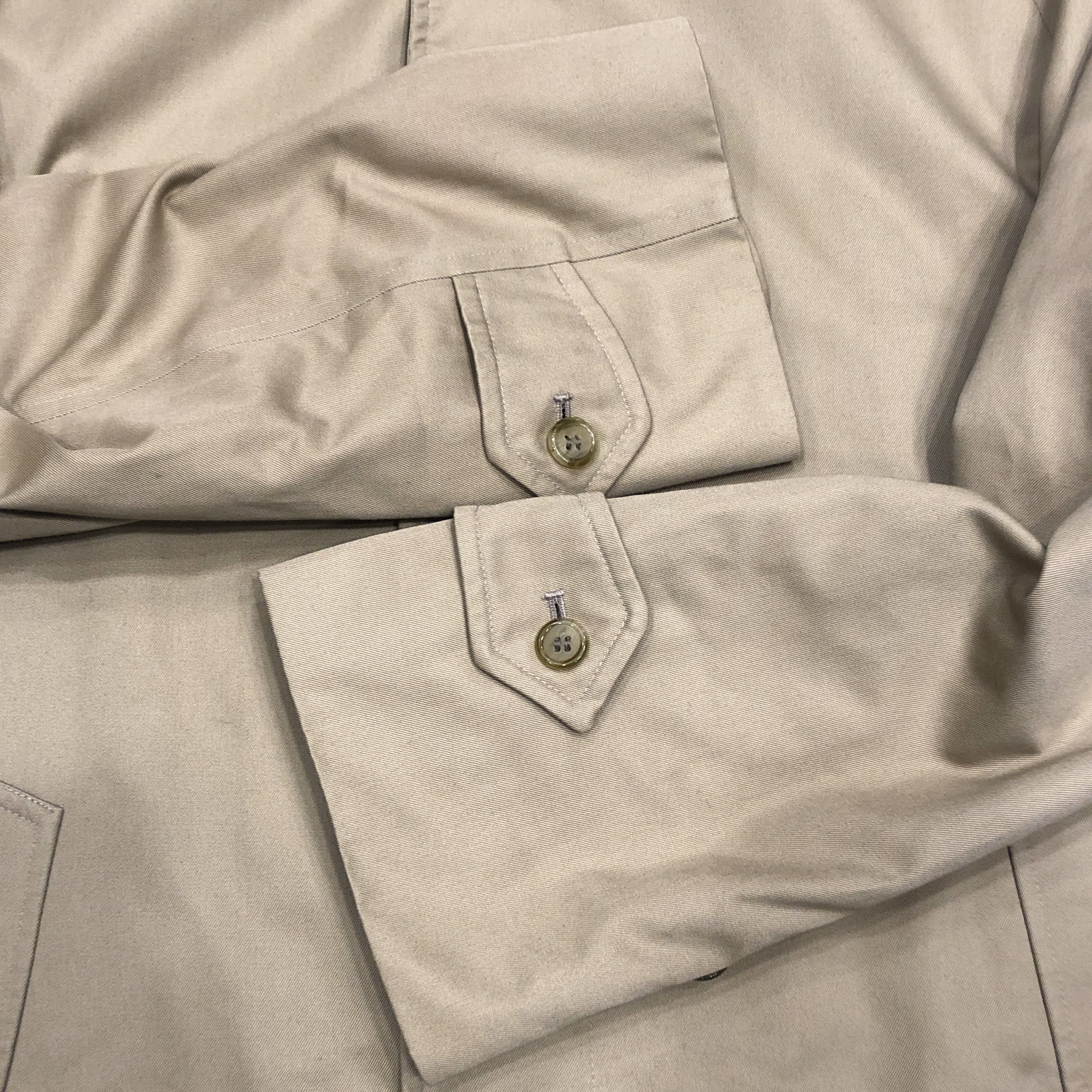 まず目を引くのは、高密度コットン・ポリの上質な艶と張り感。雨風をしっかりと弾く撥水性のあるこの素材は、Burberryが誇る伝統的な生地。半世紀以上の時を経てもなお、ハリとコシを保つその品質の高さに驚かされます。