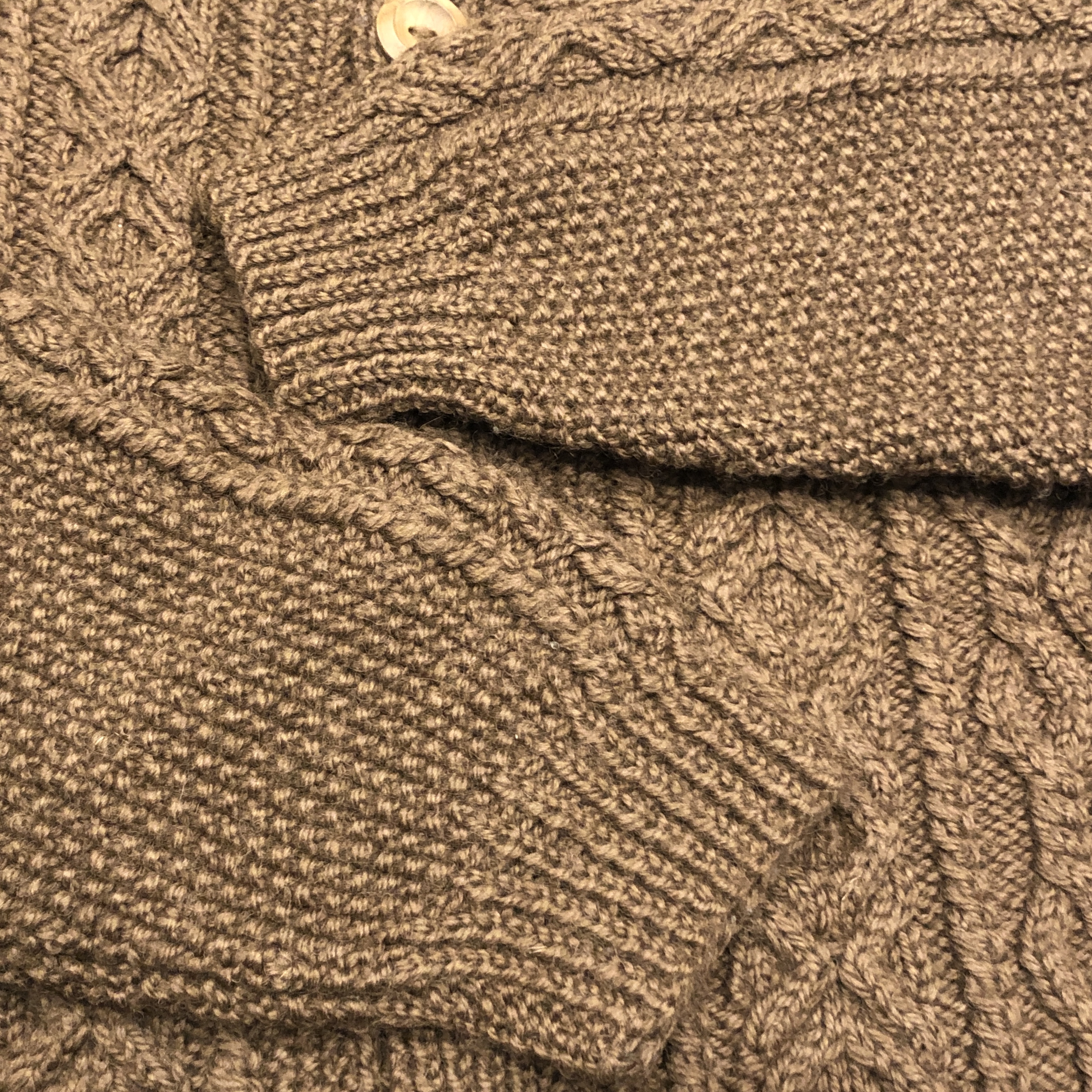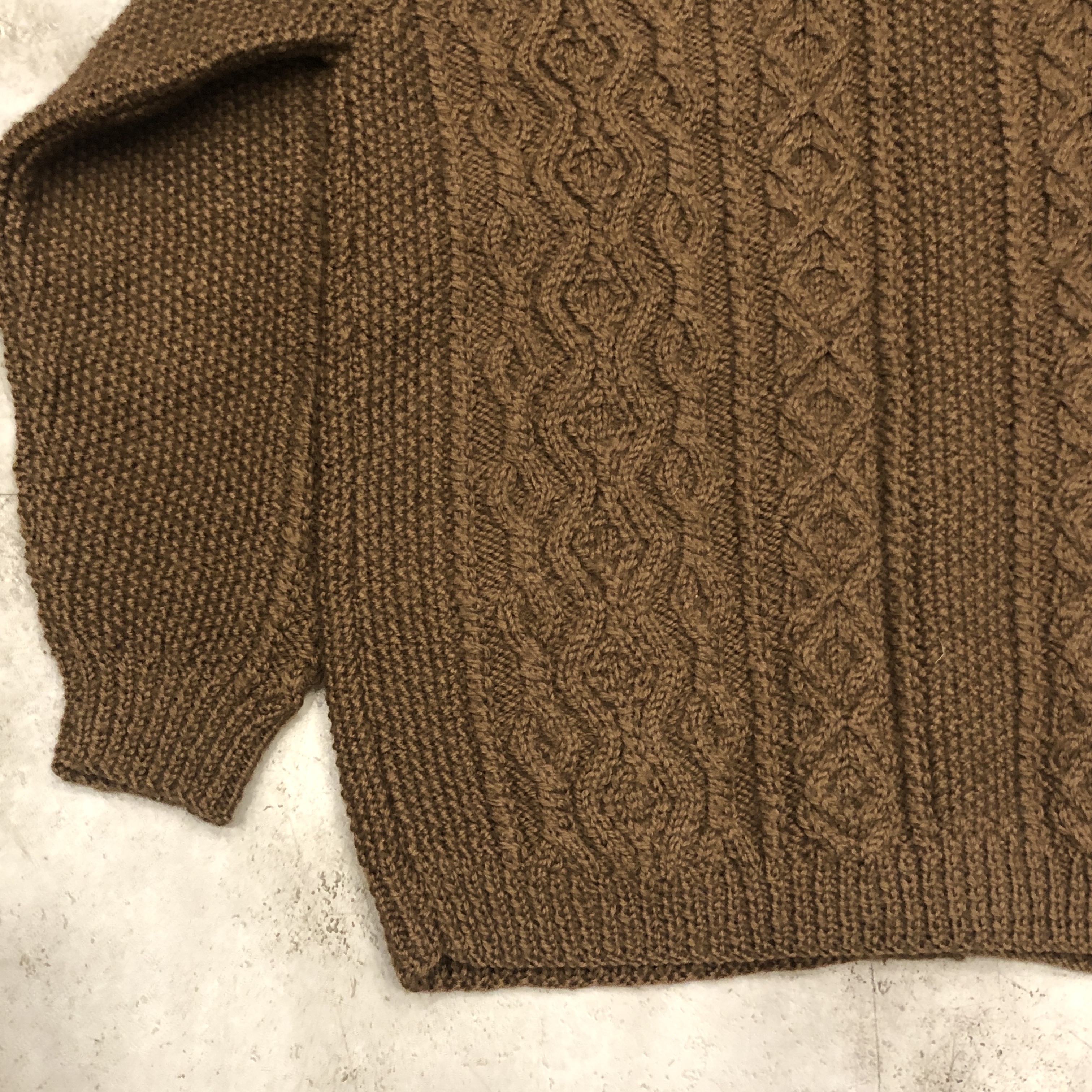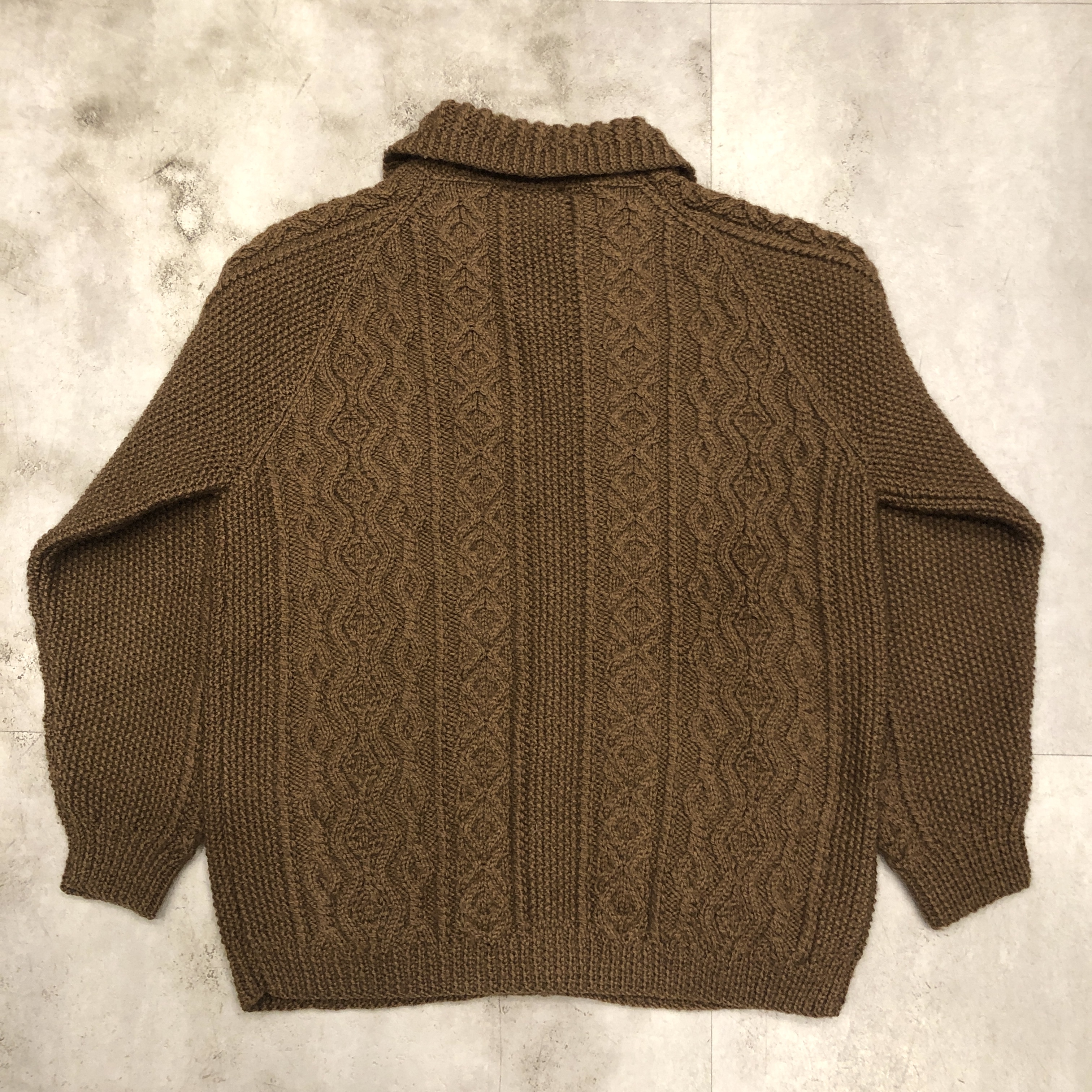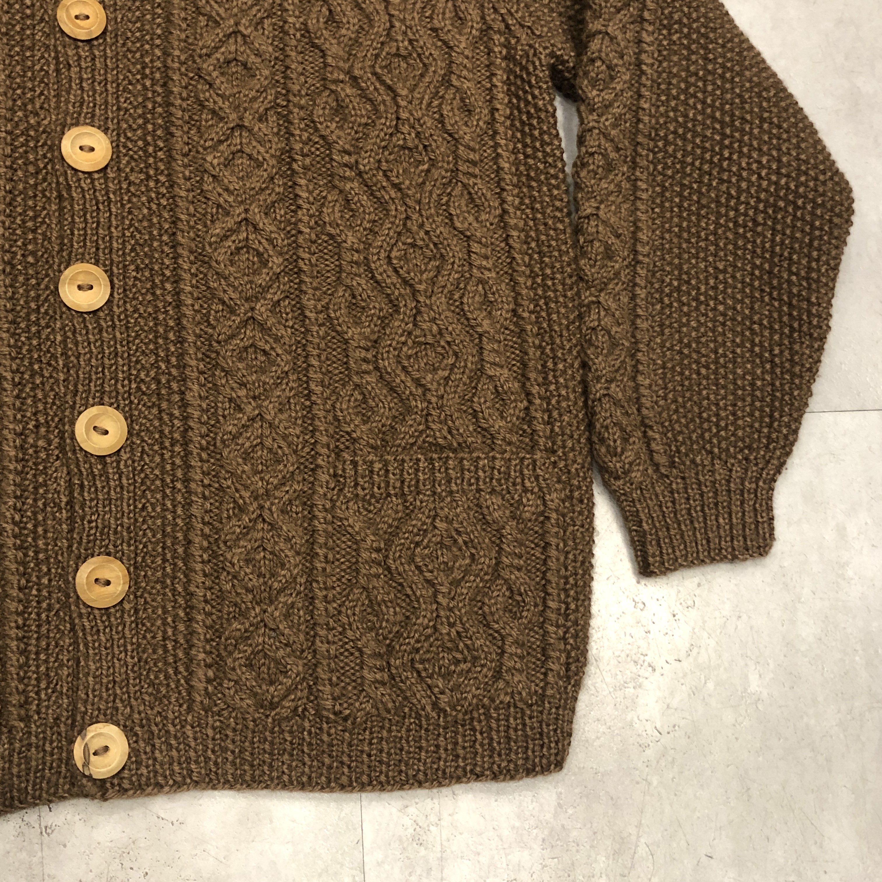 - 1970年代より続くスコットランド発の名門〈INVERALLAN〉による、名作「3A」ハンドニットカーディガンのご紹介です。熟練した職人の手仕事により、1着編み上げるのに60時間以上を要するとも言われる名品。当個体はライトな生地感、クラシックなアラン編みの模様と、存在感のあるウッドボタン、ざっくりとしたピュアニューウールの肉厚な風合いが相まって、まさに“一生モノ”と呼ぶにふさわしい佇まいです。