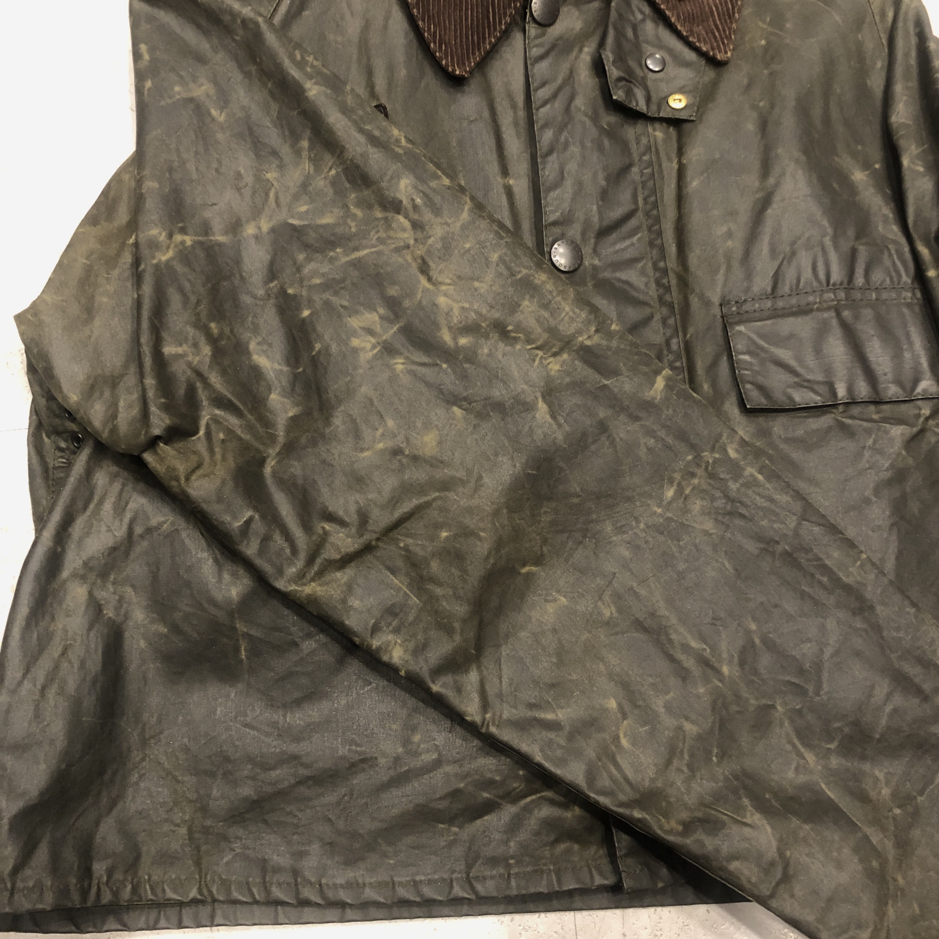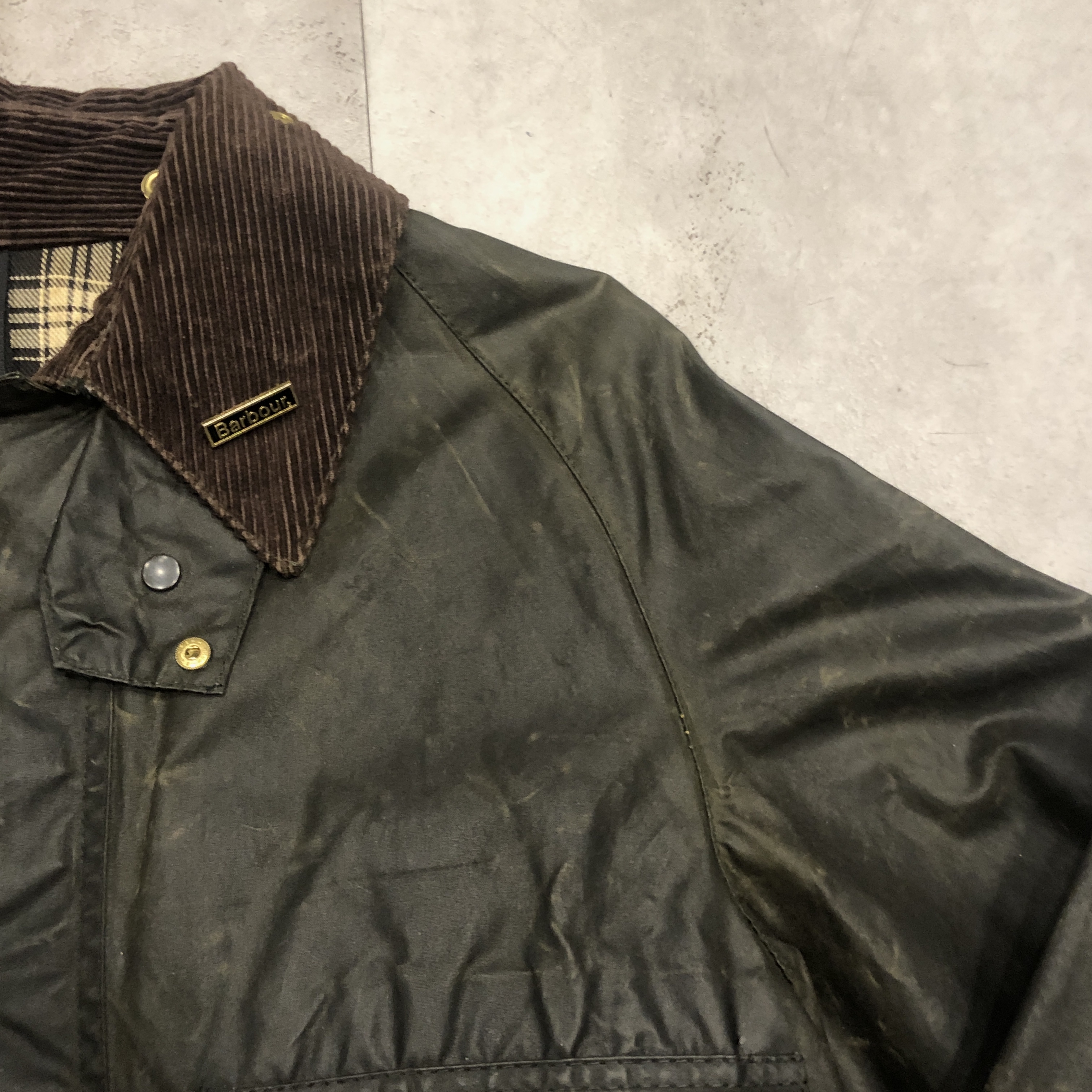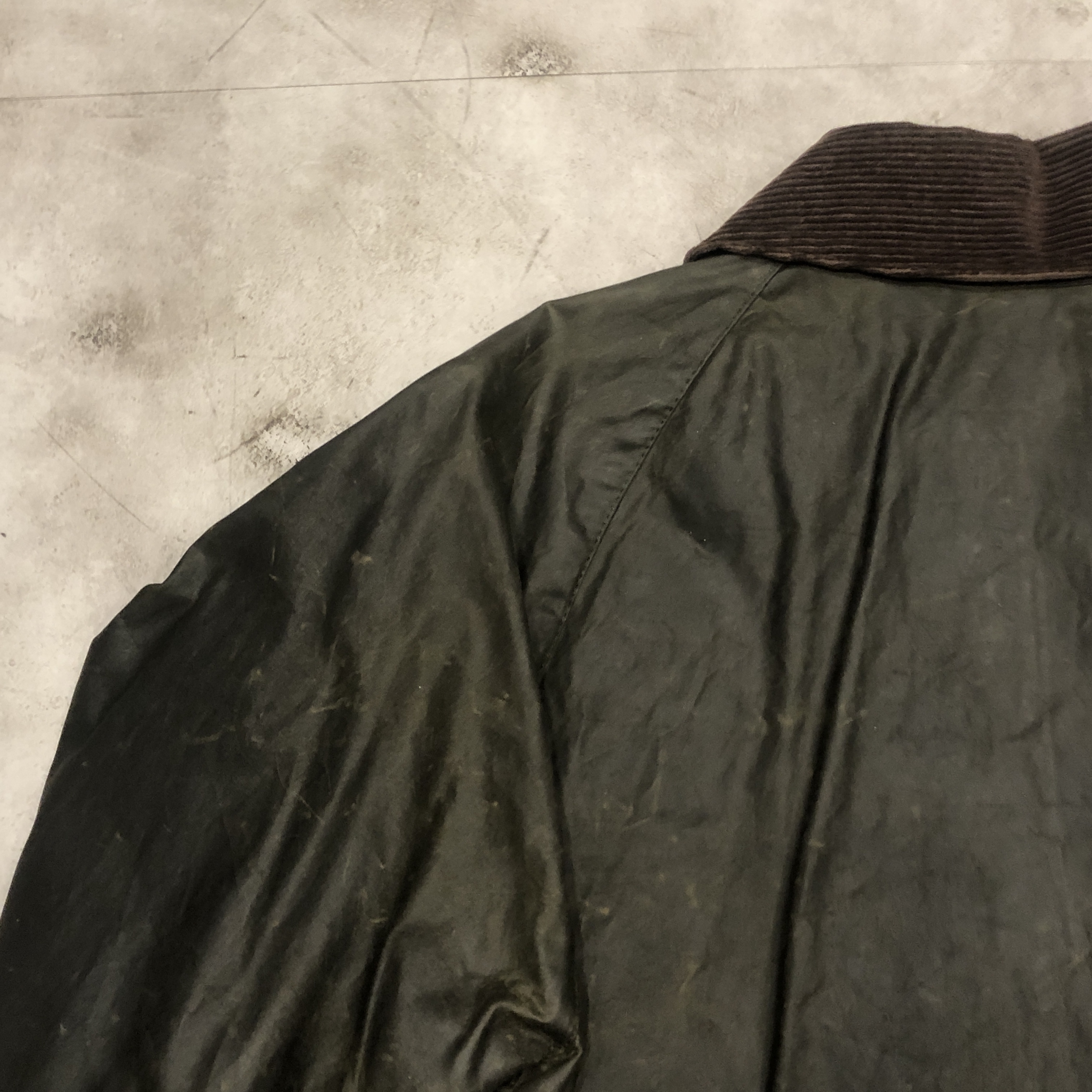 フロントにはスナップボタンとダブルジップを採用し、防風性と利便性を両立。ダークオリーブのワックスドコットンにブラウンのコーデュロイ襟が映える伝統的な佇まいは、BARBOURのフィッシングラインならではの魅力を放っています。