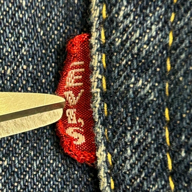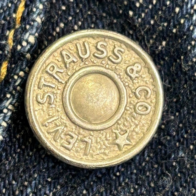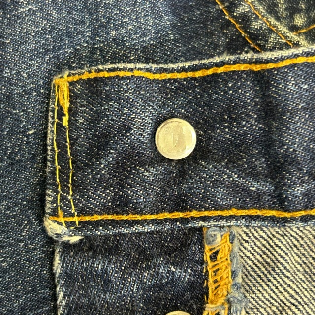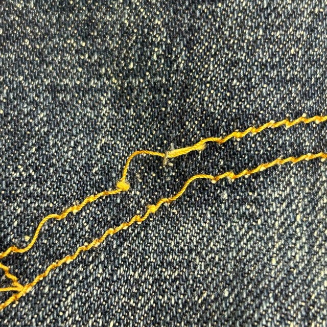 - トップボタン裏刻印『4』、足長R、並行ステッチ、ウェストチェーンステッチ